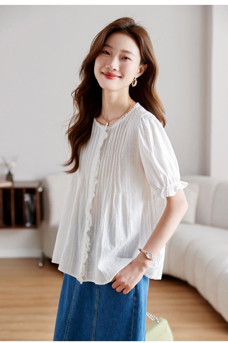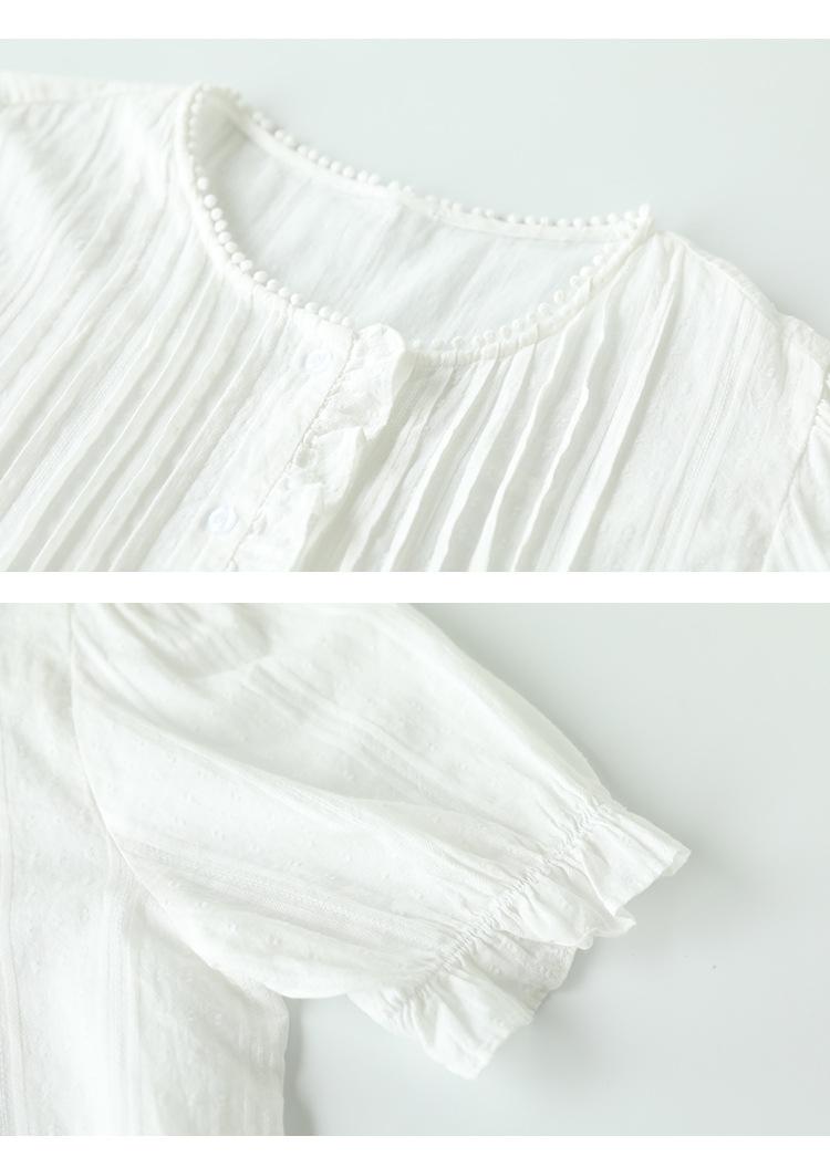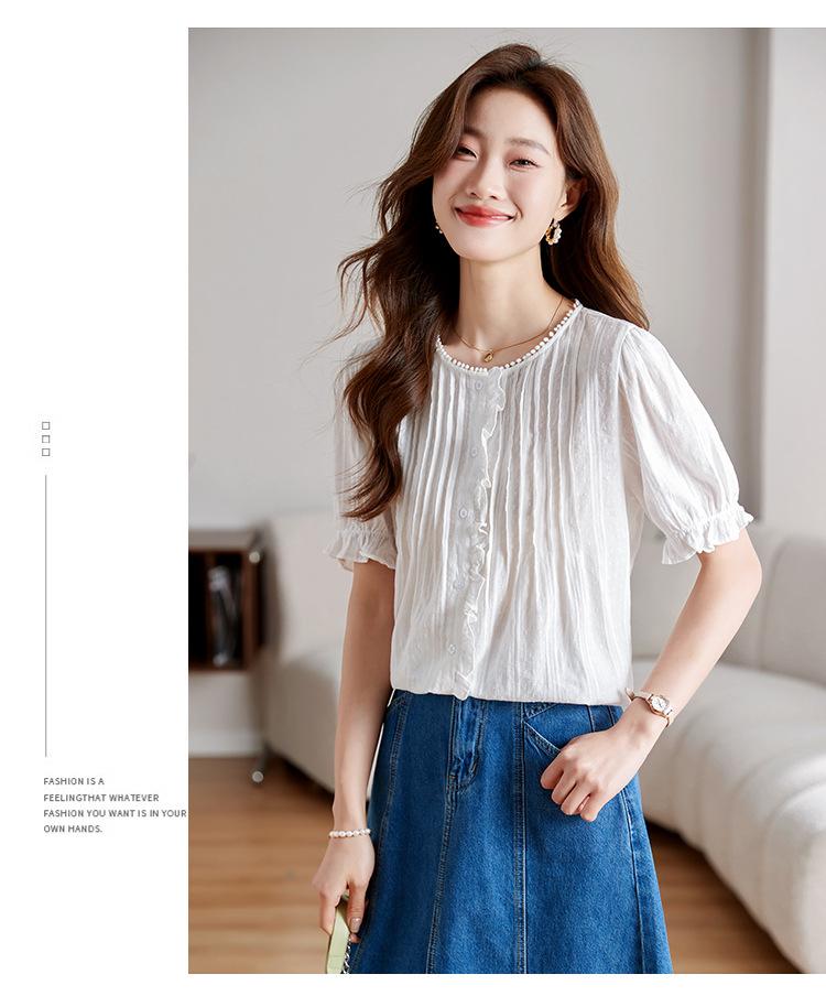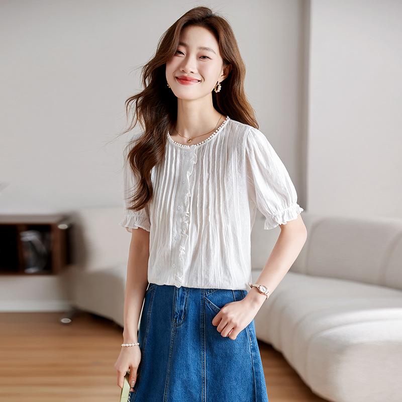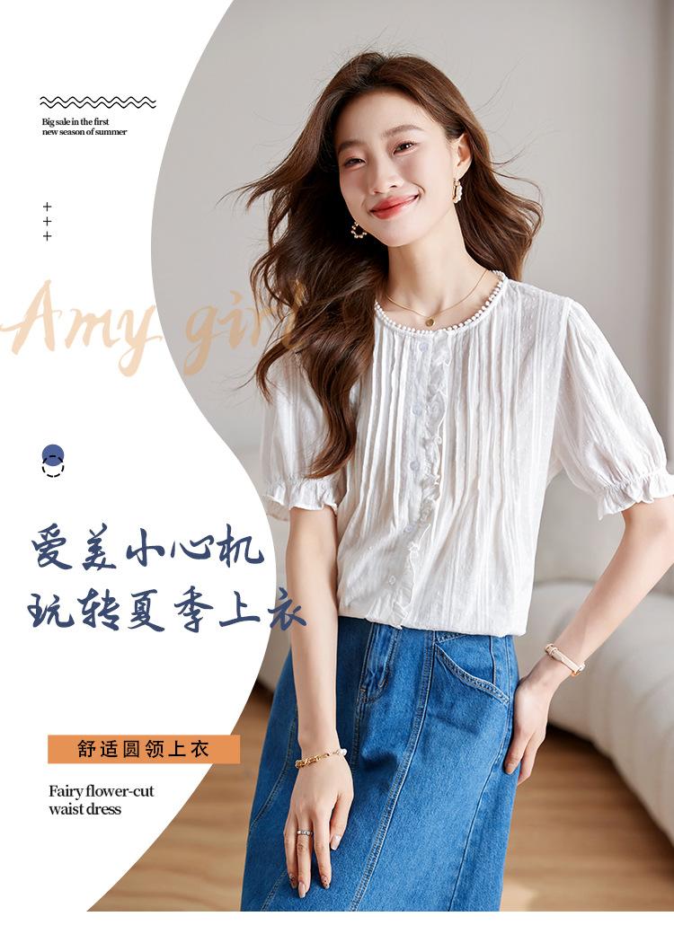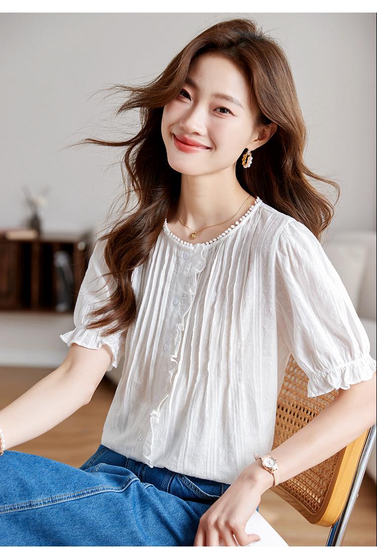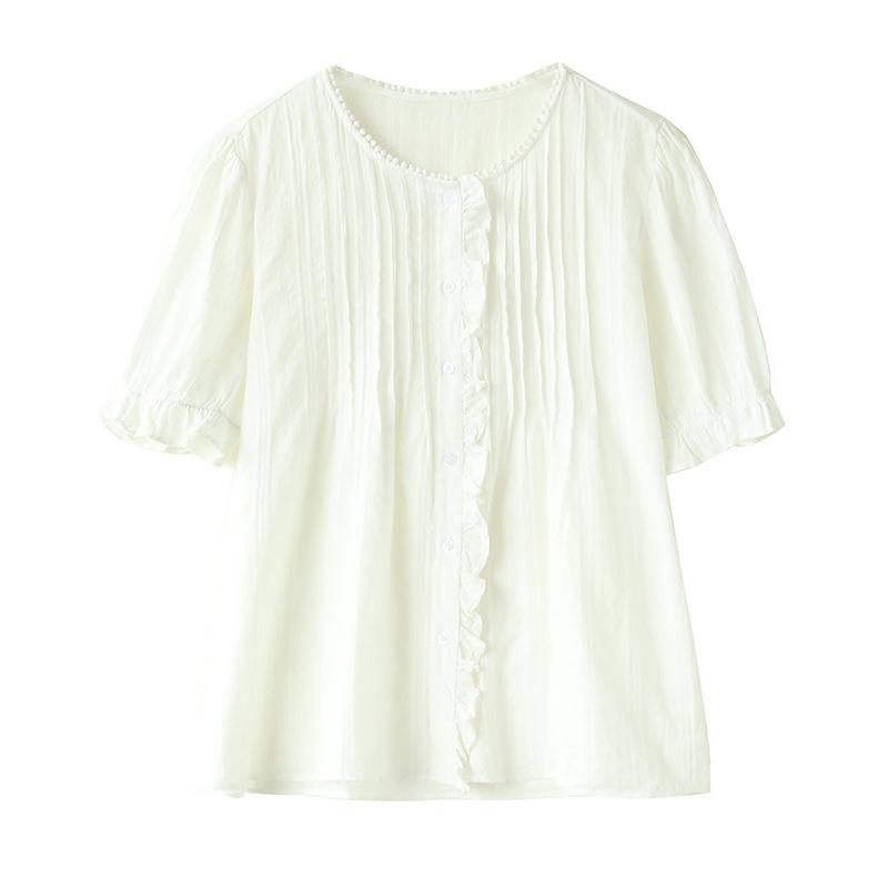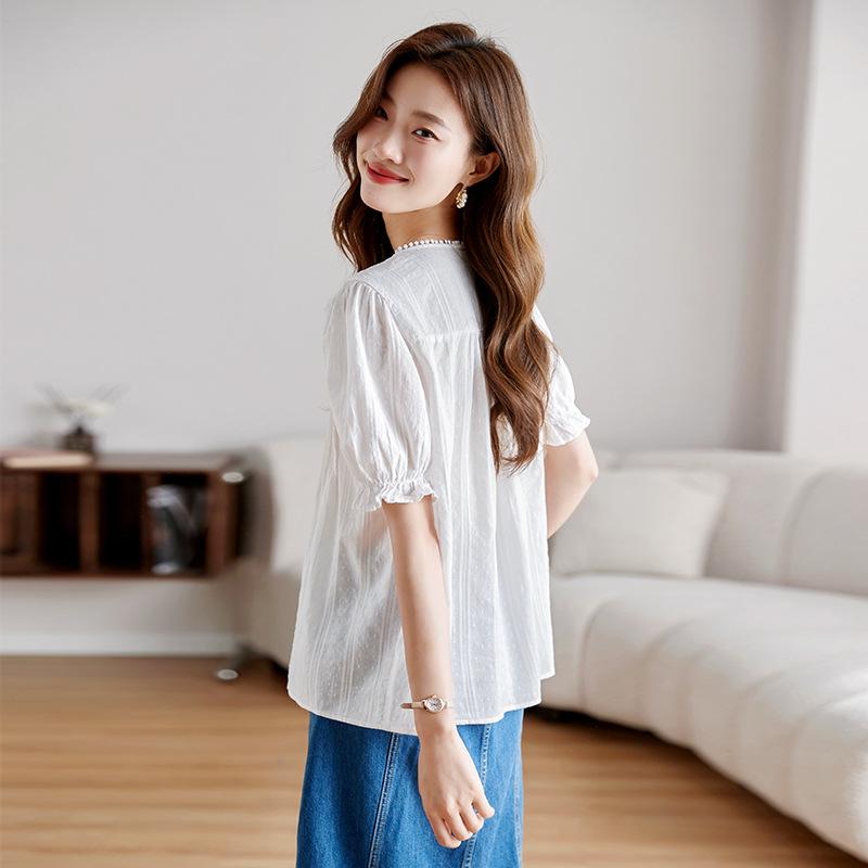 Camisa Blanca de Verano para Mujer de Manga Corta Cuello Redondo Cárdigan Holgado