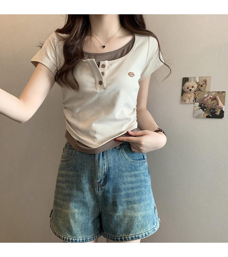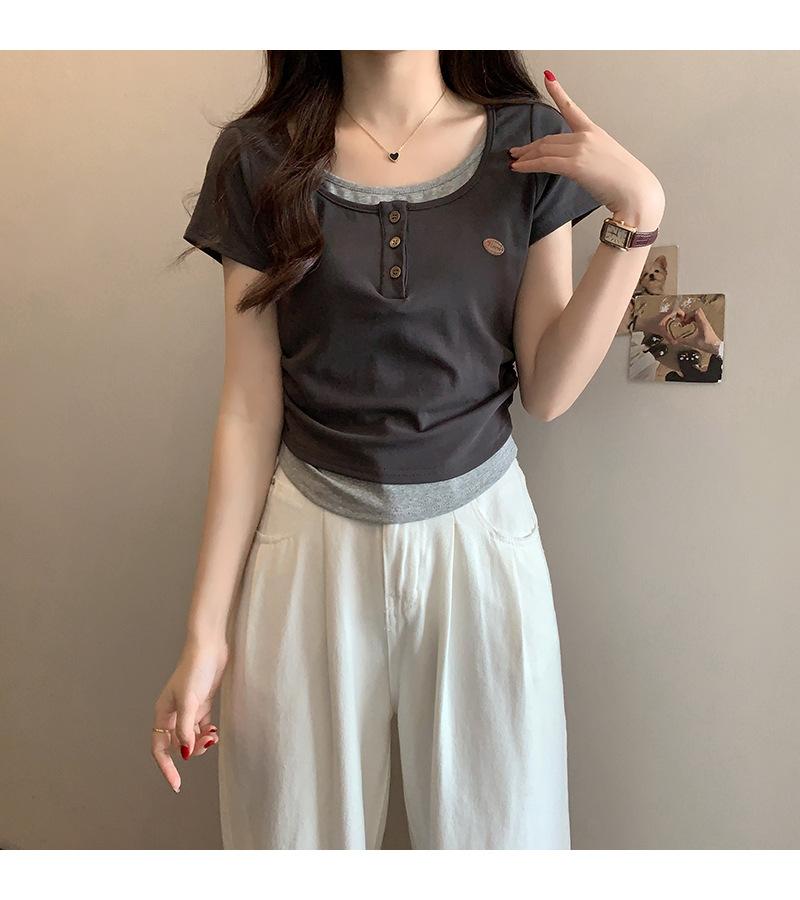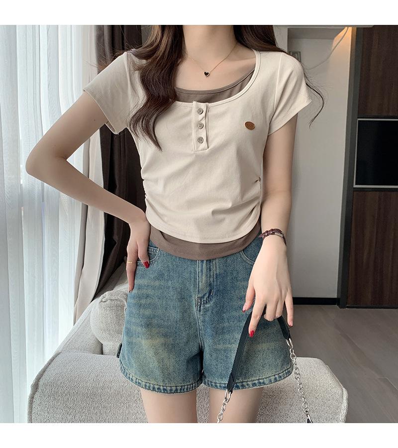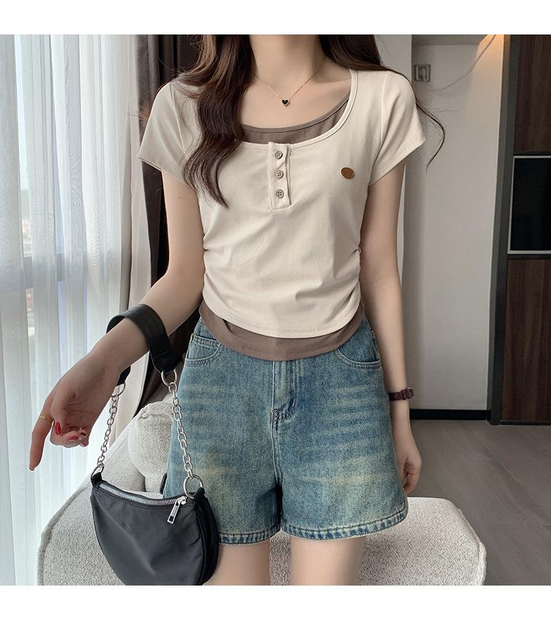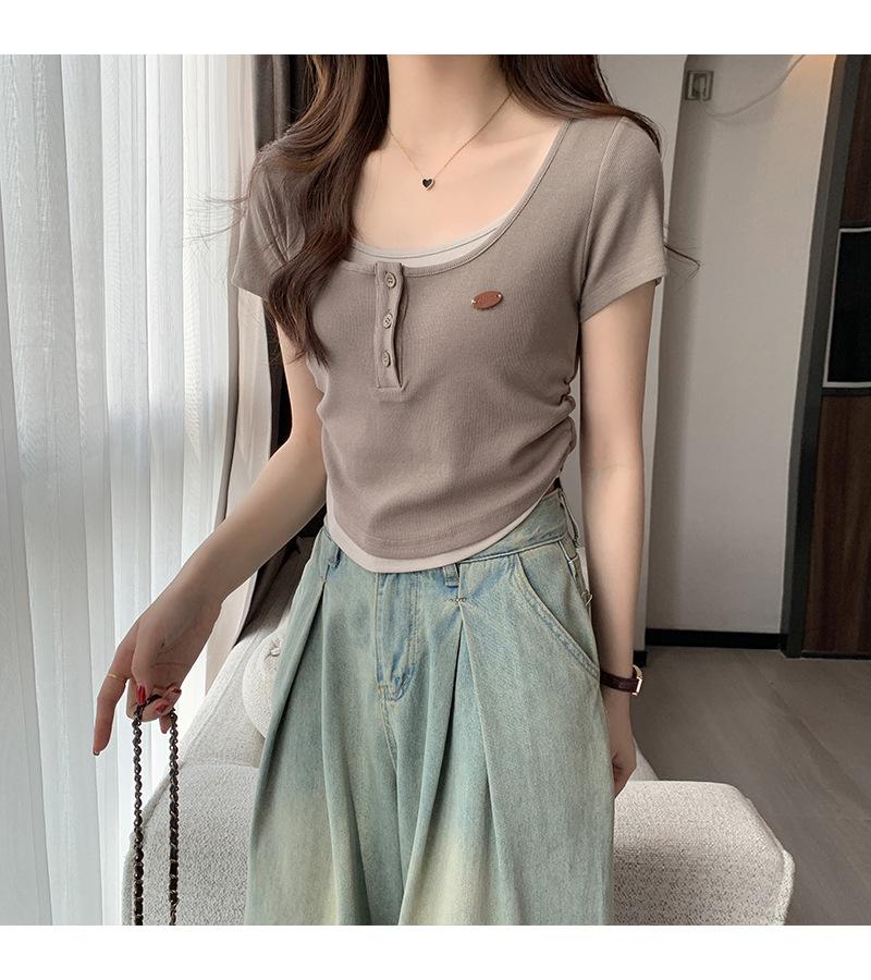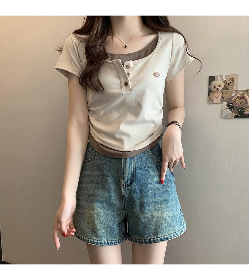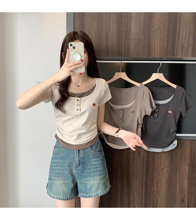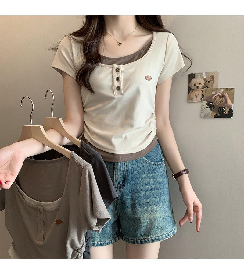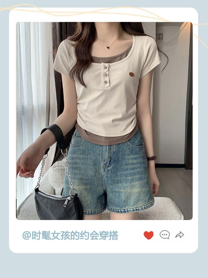 Compra Camiseta Americana de Hombro Derecho Falsa de Dos Piezas de Manga Corta para Mujer Verano 2025 Nueva Camiseta Básica Aspecto Adelgazante de Cintura Top Corto al por mayor en Joom.pro