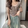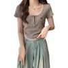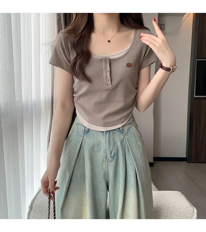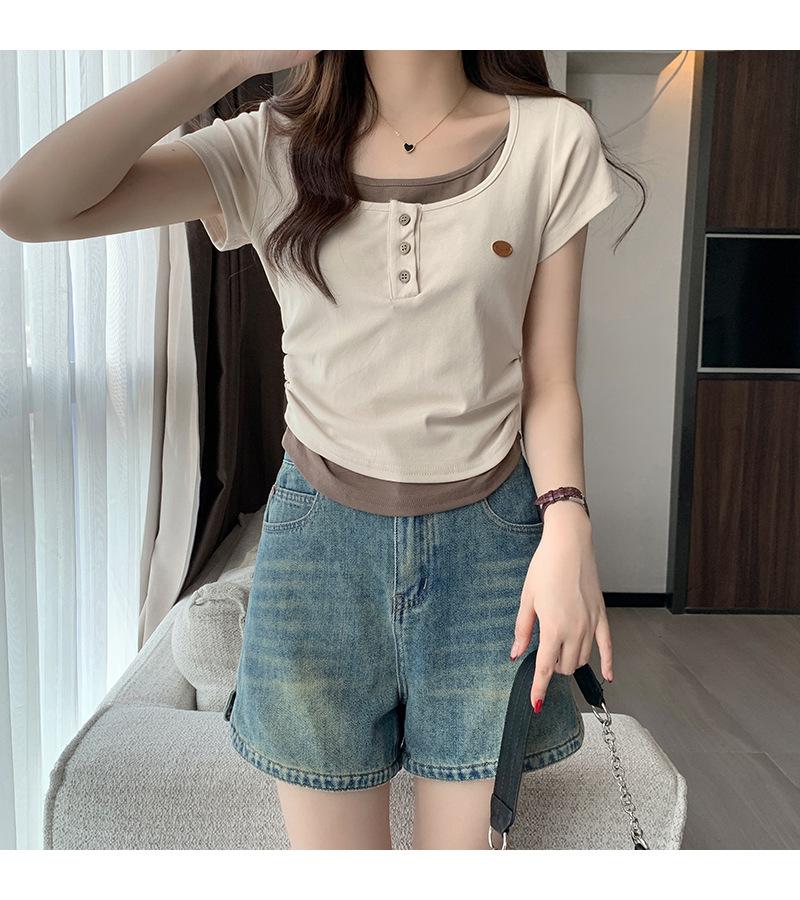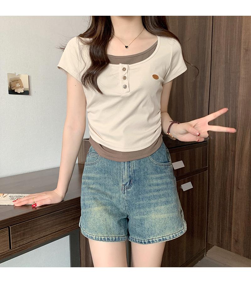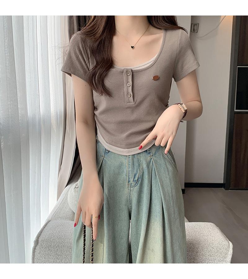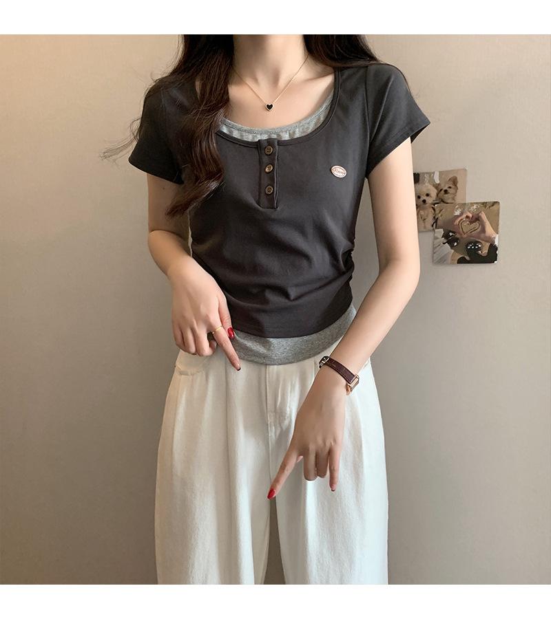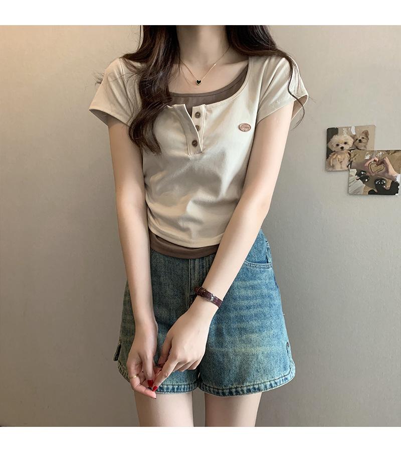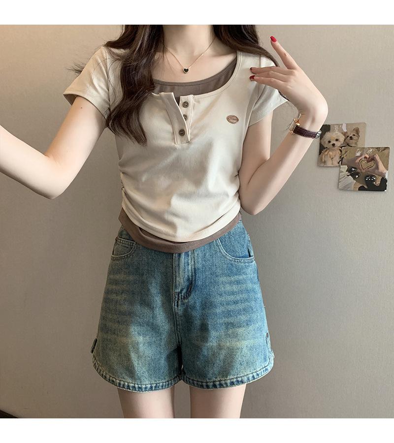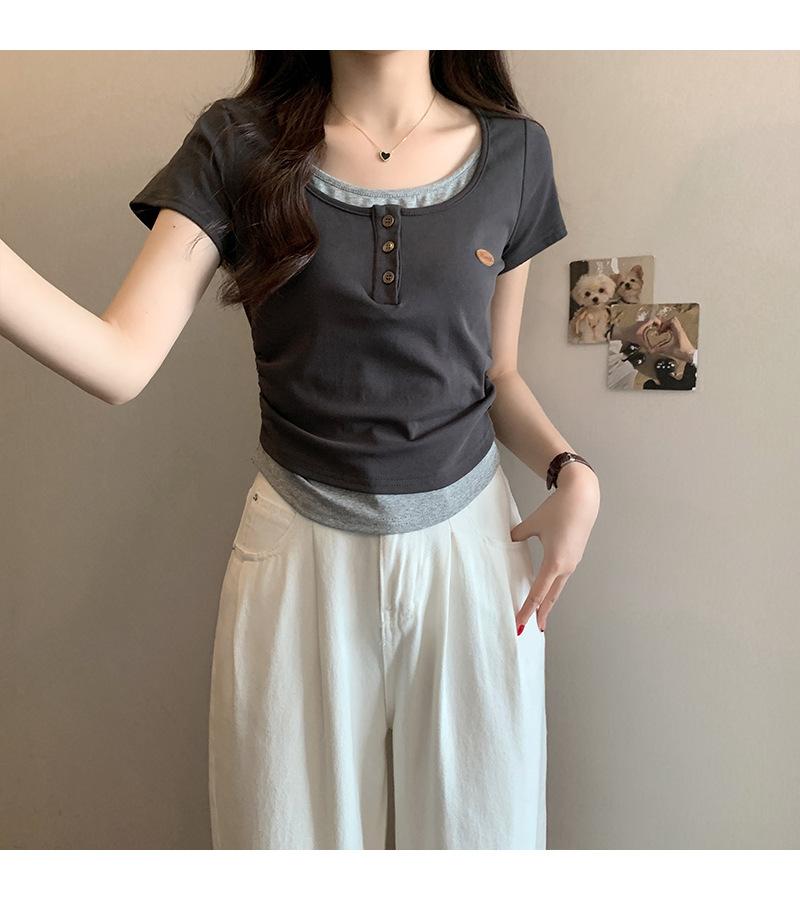 Compra Camiseta Americana de Hombro Derecho Falsa de Dos Piezas de Manga Corta para Mujer Verano 2025 Nueva Camiseta Básica Aspecto Adelgazante de Cintura Top Corto al por mayor en Joom.pro