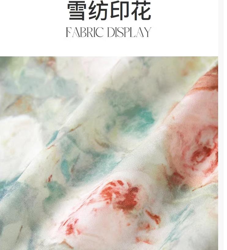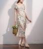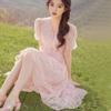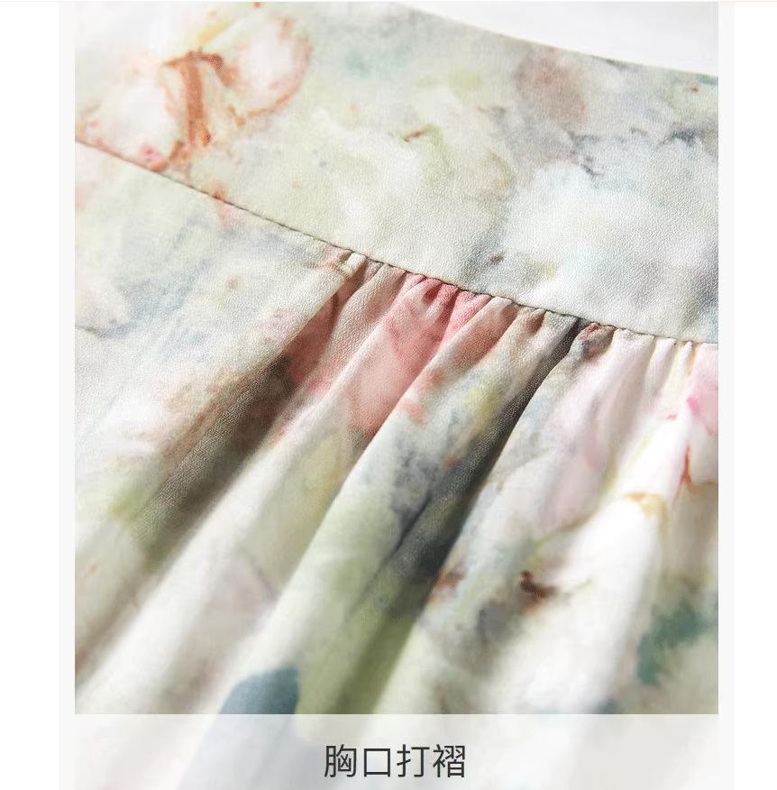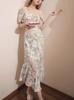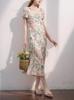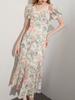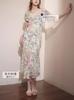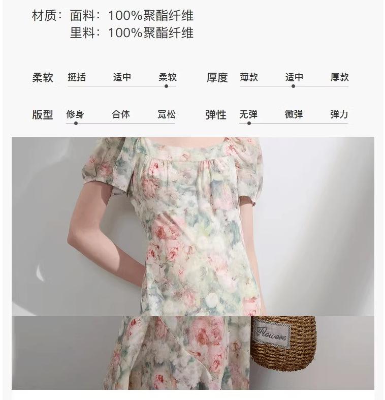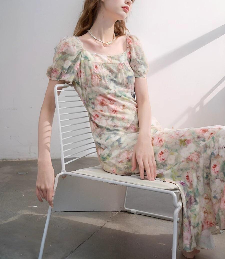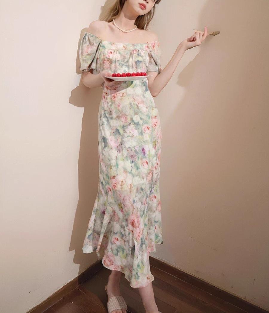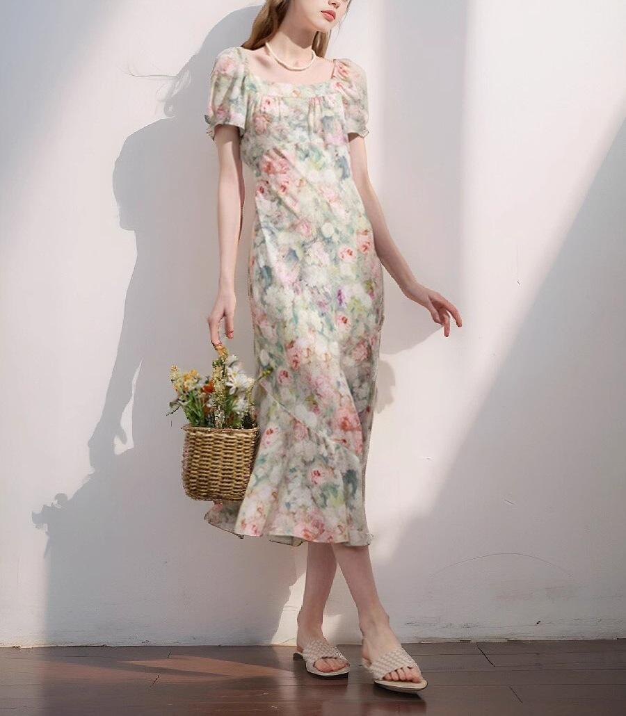 Vestido Floral Nuevo de Primavera y Verano 2025 Pintura al Óleo Cuello Cuadrado Francés Manga Corta Falda de Cola de Pescado Falda Larga para Mujer