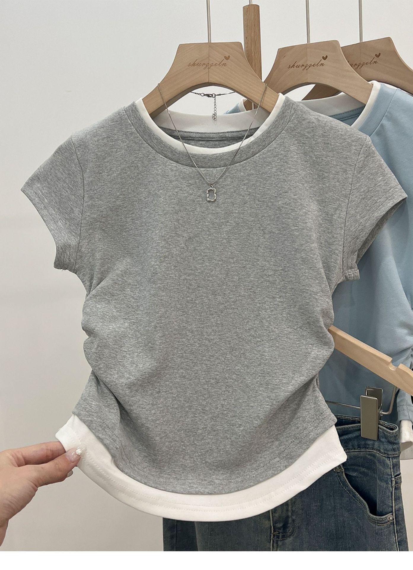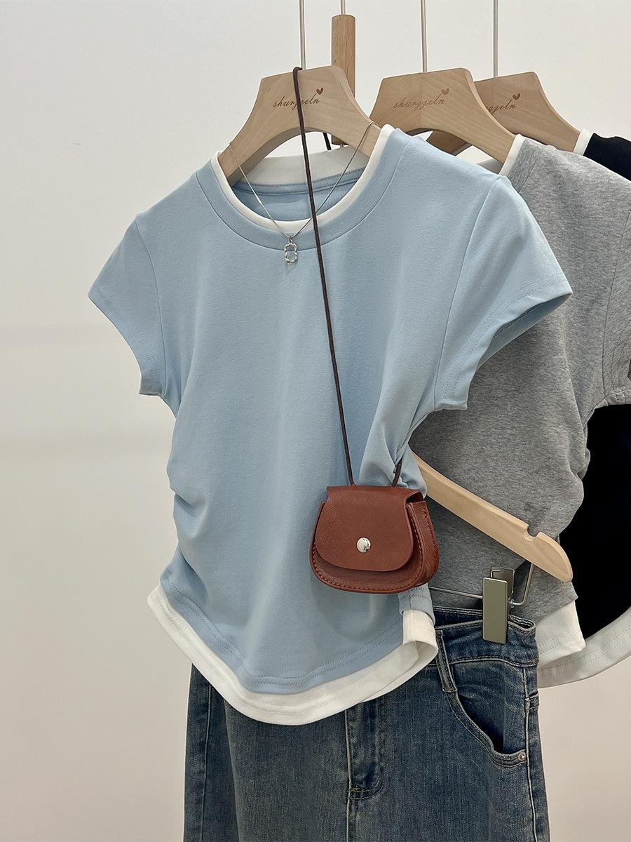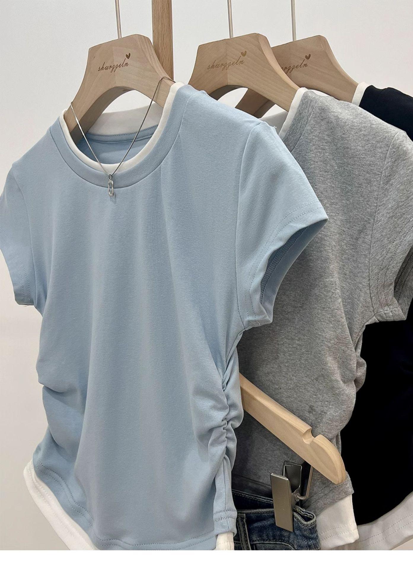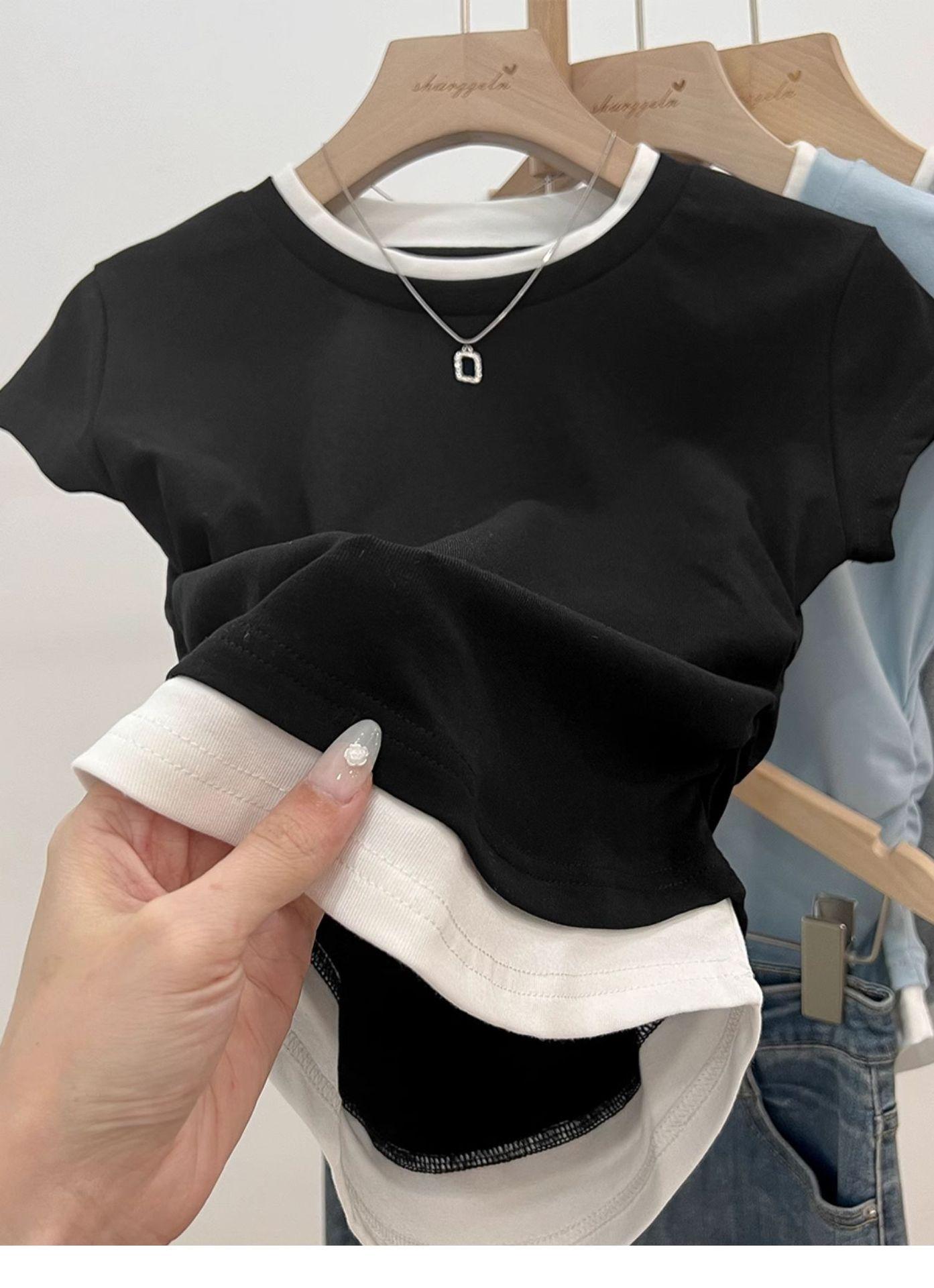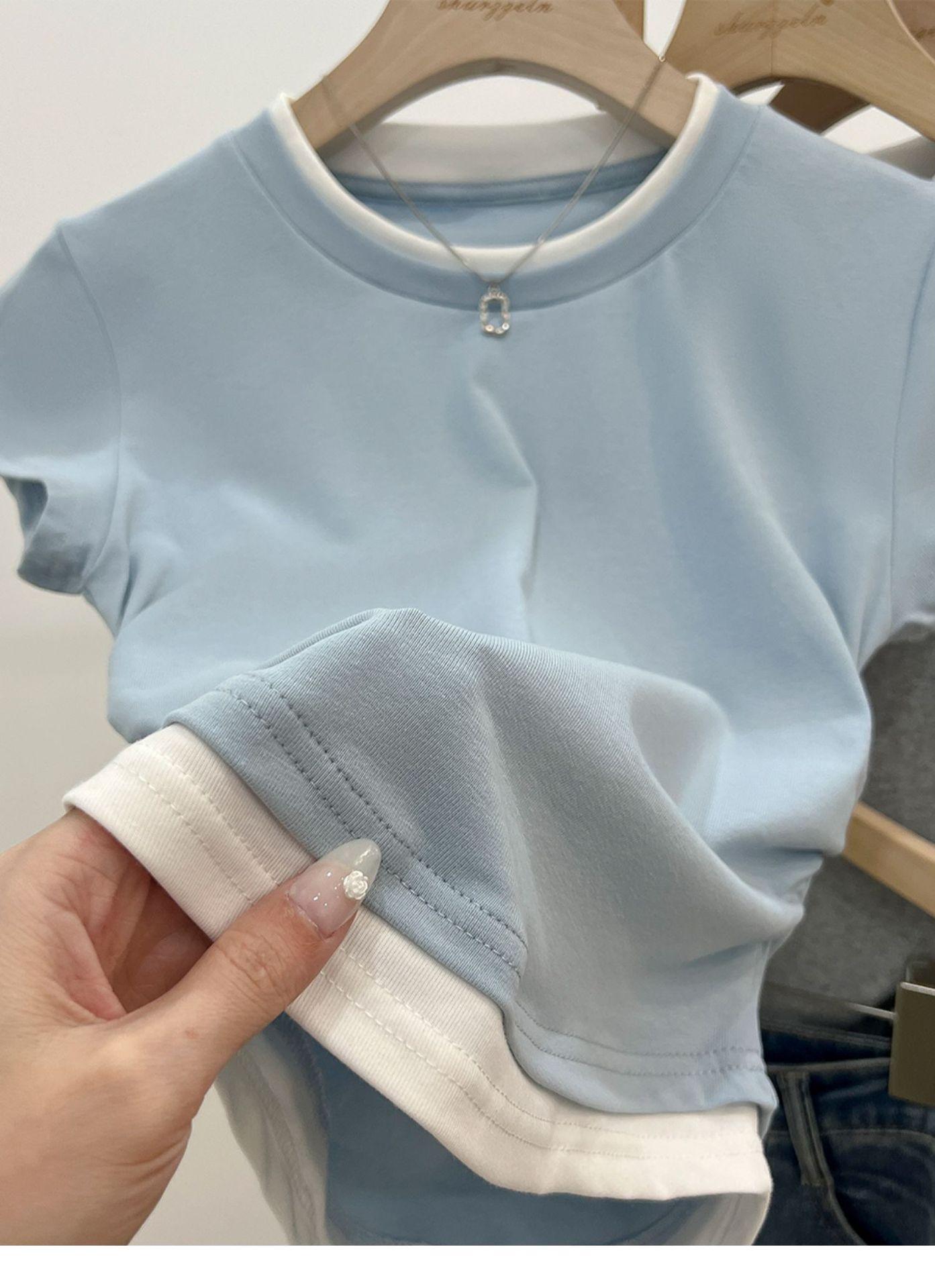 Nueva camiseta de manga corta de dos piezas con hombros descubiertos y contraste de color para mujer, diseño nuevo de verano, top corto plisado estilo Sweet Spice Girl