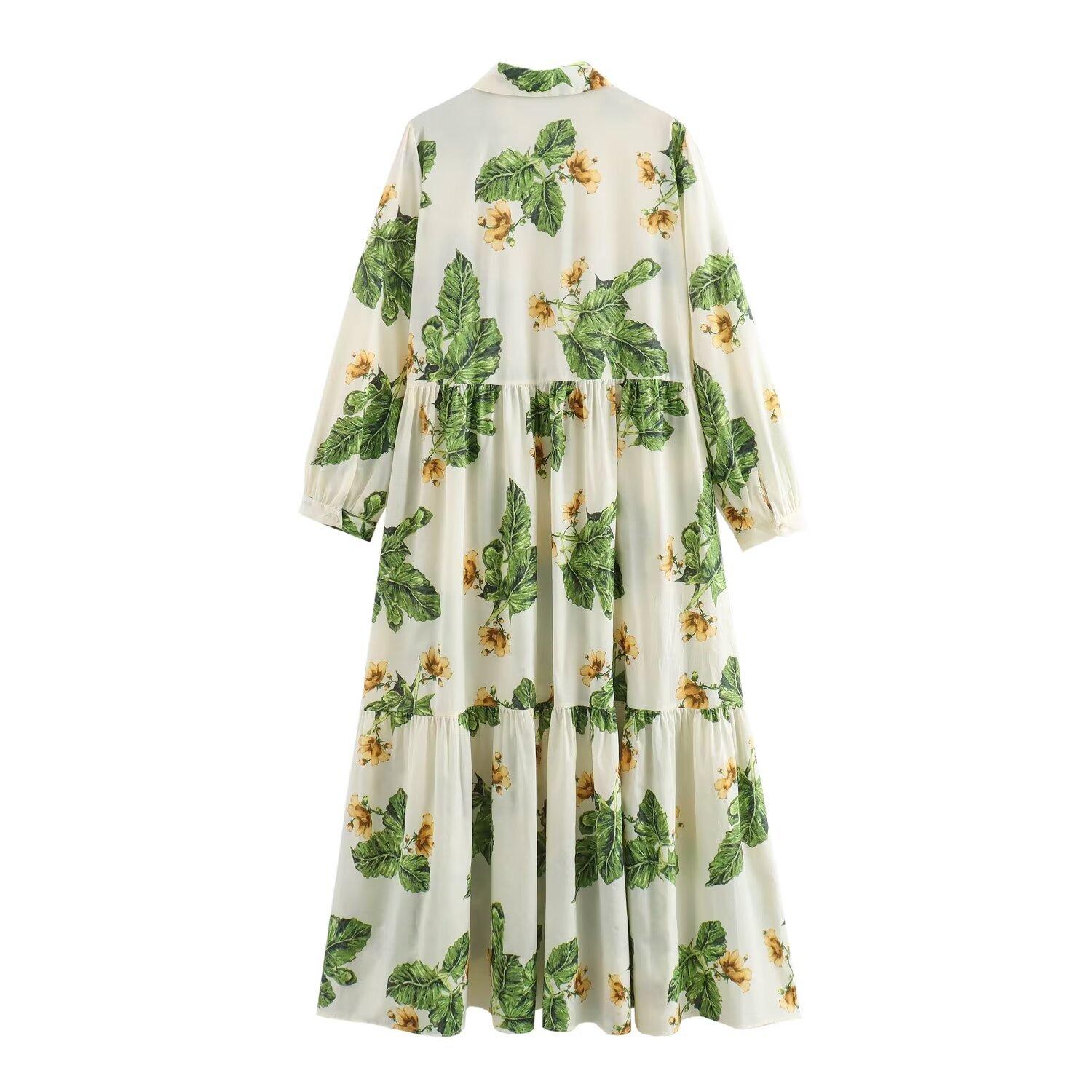 Ropa transfronteriza europea y americana, nueva, con estampado floral, fresca y moderna, solapa, estilo camisa de manga larga, vestido ajustado.