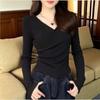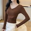 Camiseta de manga larga tipo cachemir para mujer, otoño e invierno 2023, nueva camiseta de chica americana sexy con cuello en V ajustado y hebilla, top adelgazante