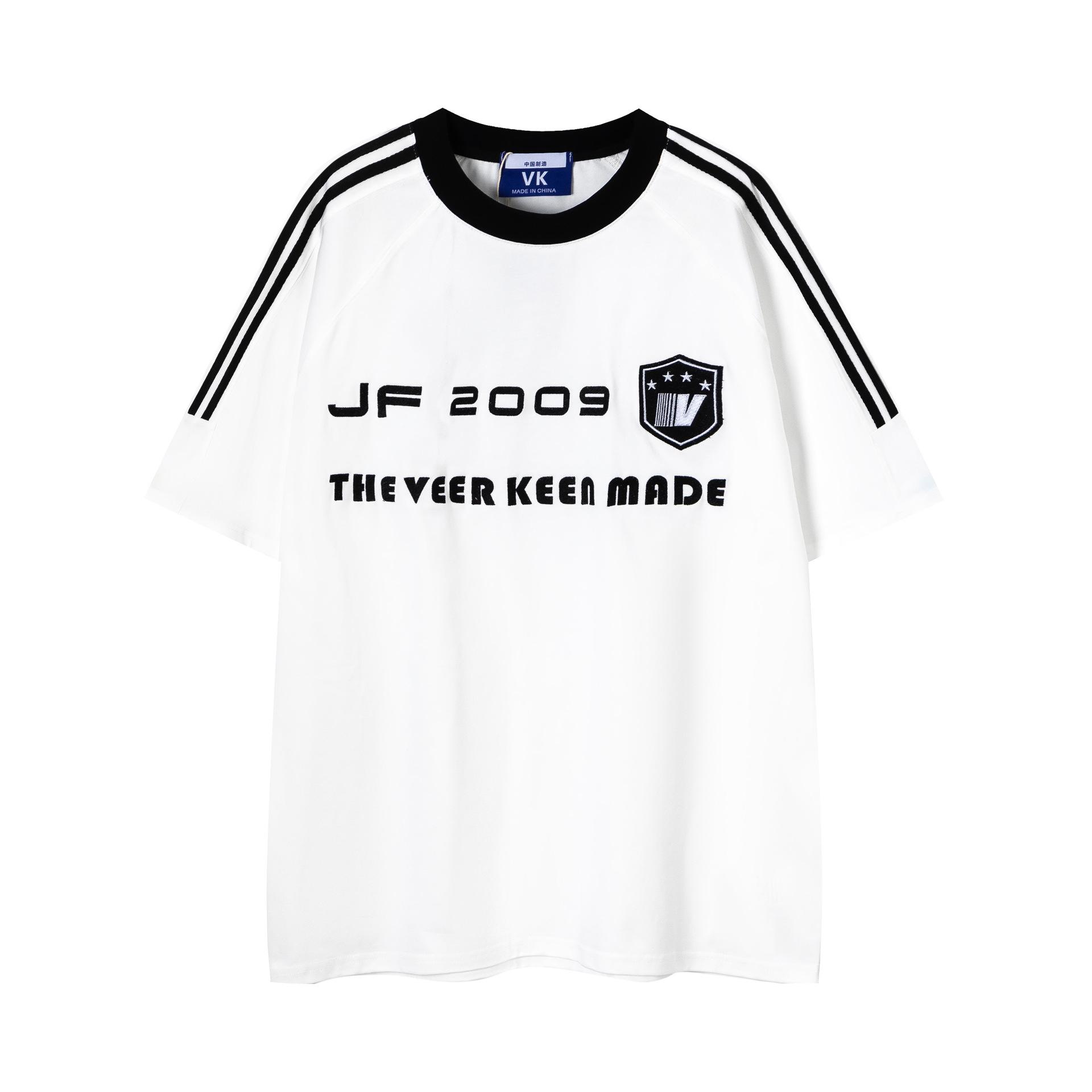 Compra Camiseta de manga corta con estampado de letras y costuras de tres barras estilo retro americano, holgada, para hombre y mujer, para parejas al por mayor en Joom.pro