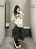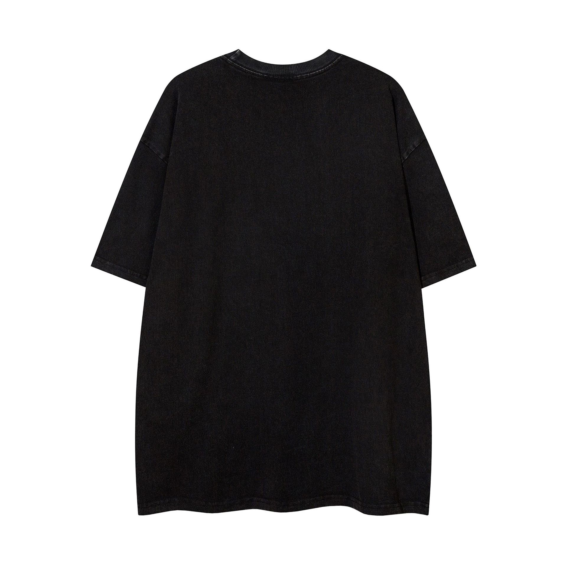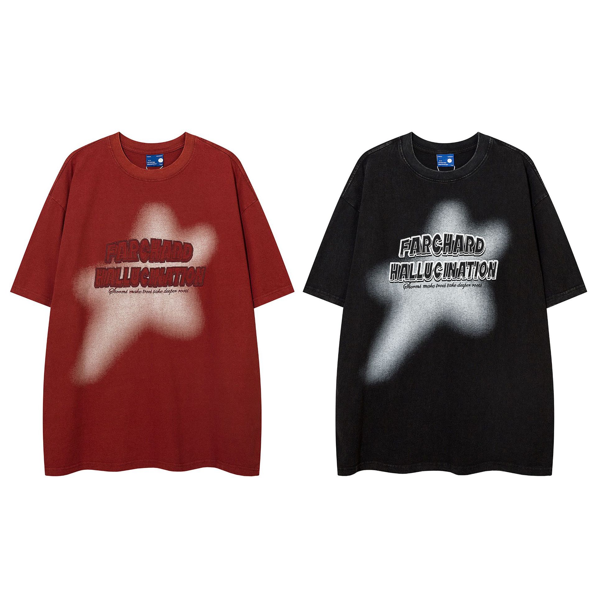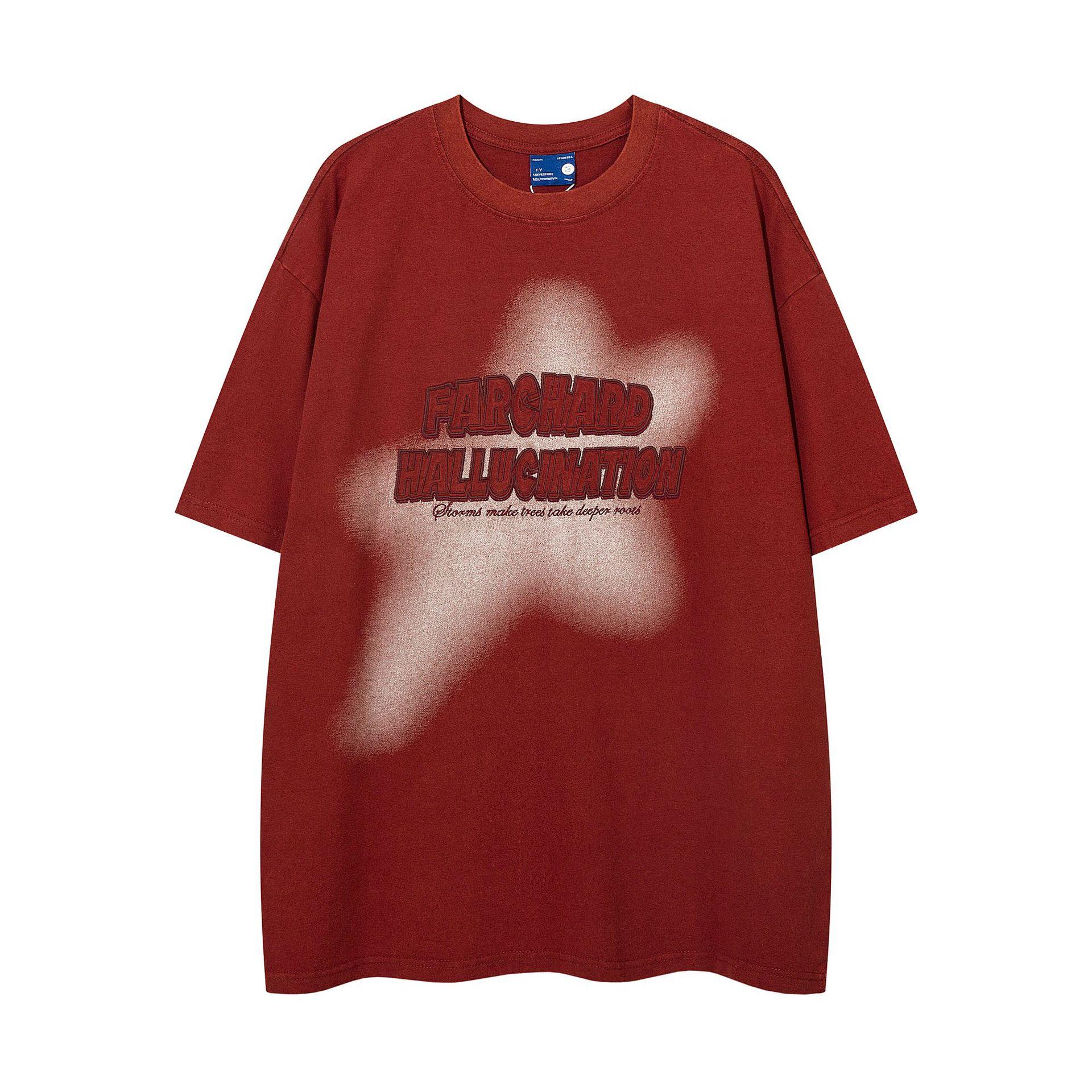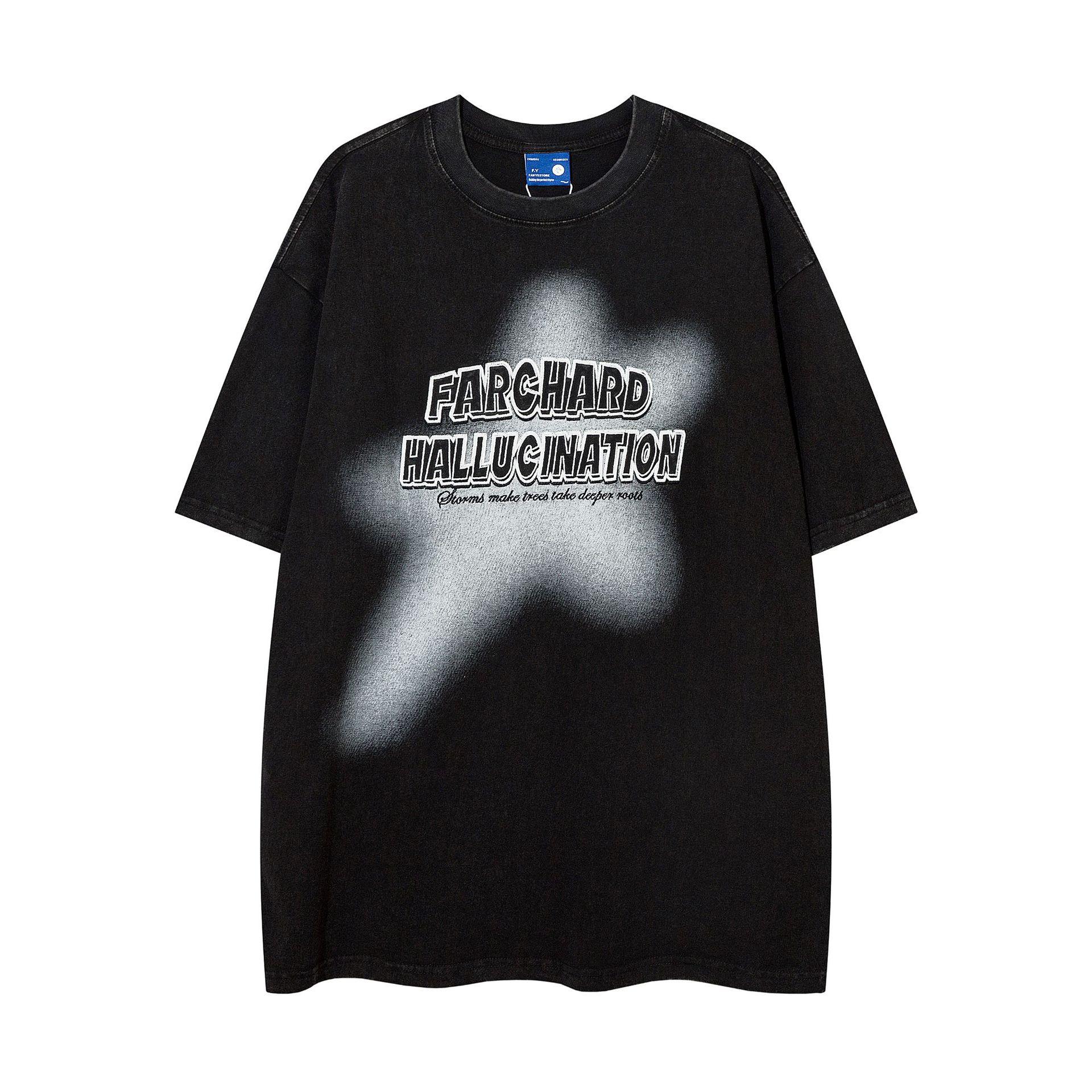 Camiseta de manga corta lavada retro americana con parche de letra de estrella de cinco puntas bordado, camiseta corta suelta para hombres y mujeres, top de media manga para parejas