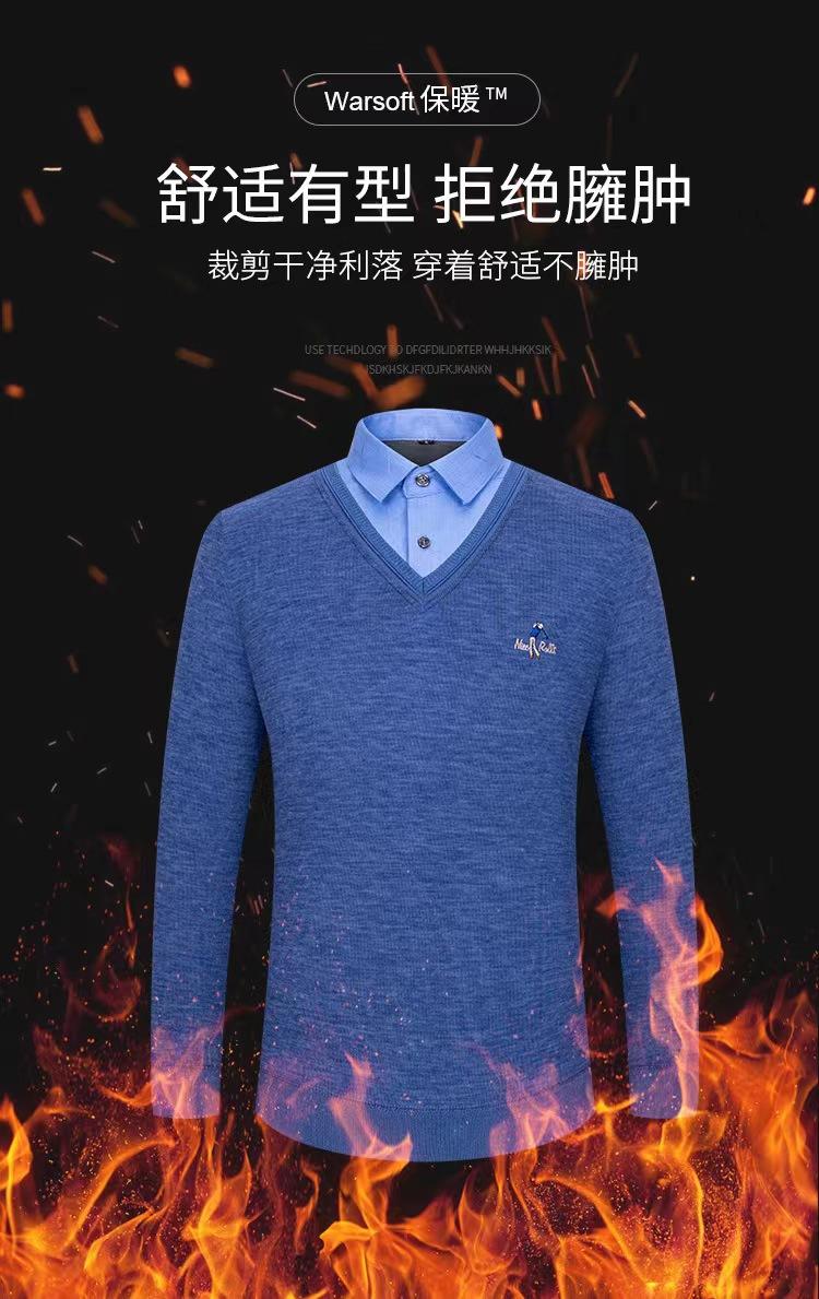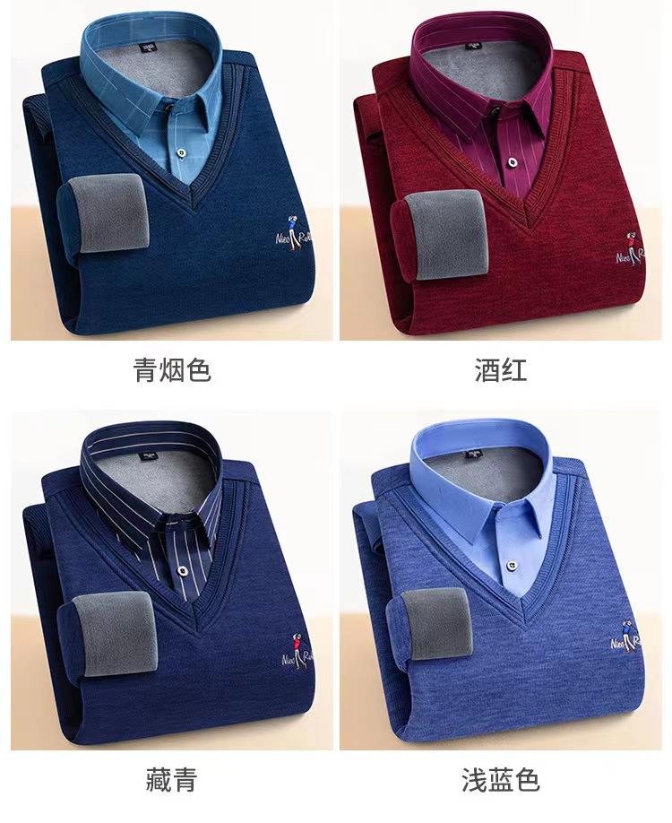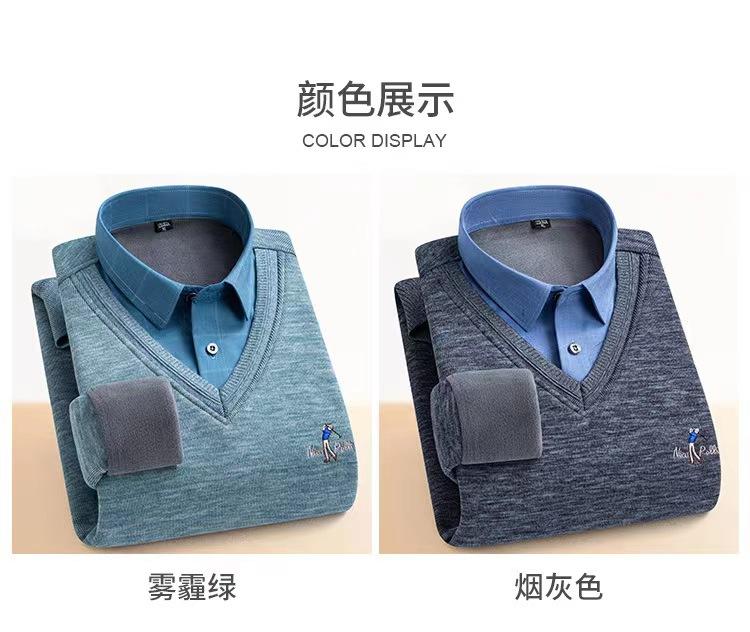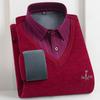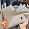 Suéter de cuello de camisa de dos piezas falso grueso con forro polar para hombre de otoño e invierno, suéter de punto informal cálido para negocios