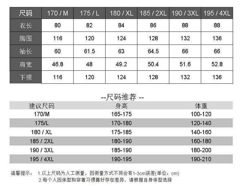 M/170, L/175, XL/180, 2XL/185, 3XL/190, 4XL/195