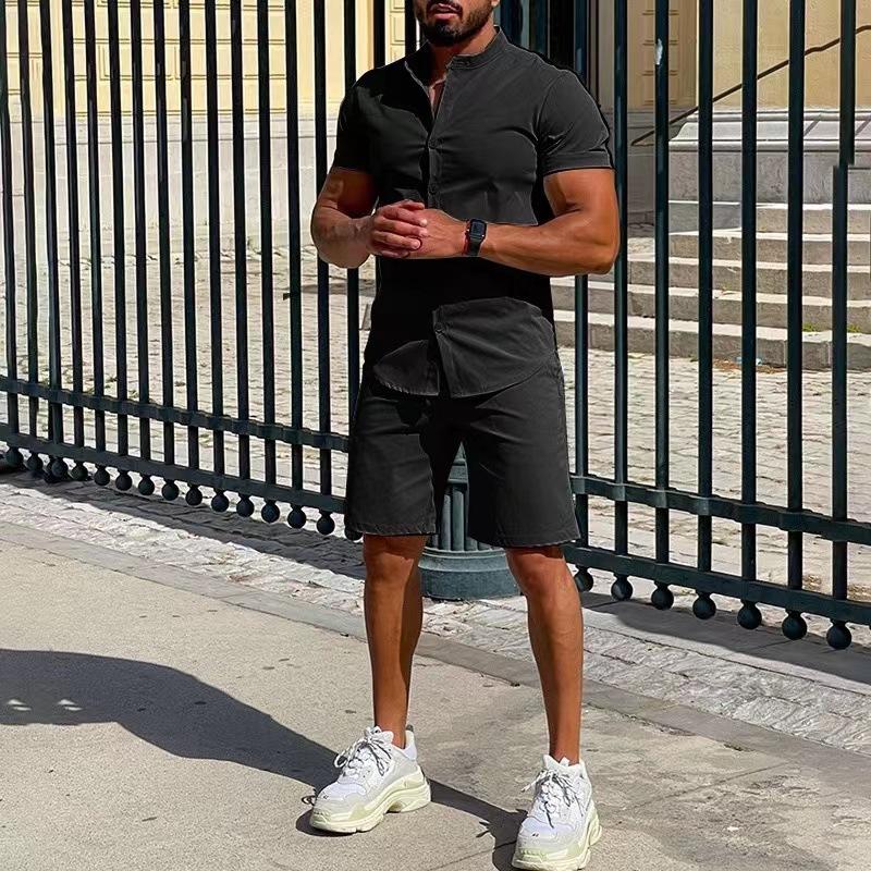 Traje Deportivo de Verano Europeo y Americano Transfronterizo 2023 para Hombre, Ropa de Hombre de Color Sólido, Conjunto Trendy de Dos Piezas de Manga Corta