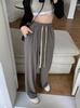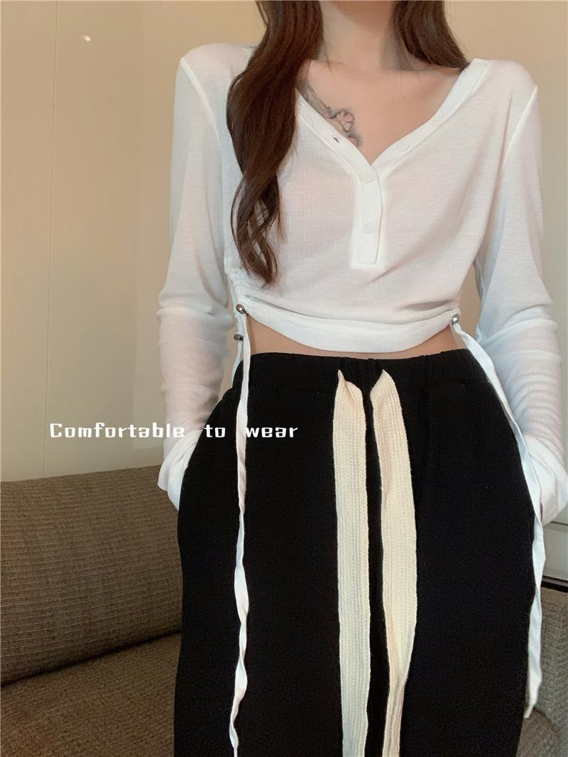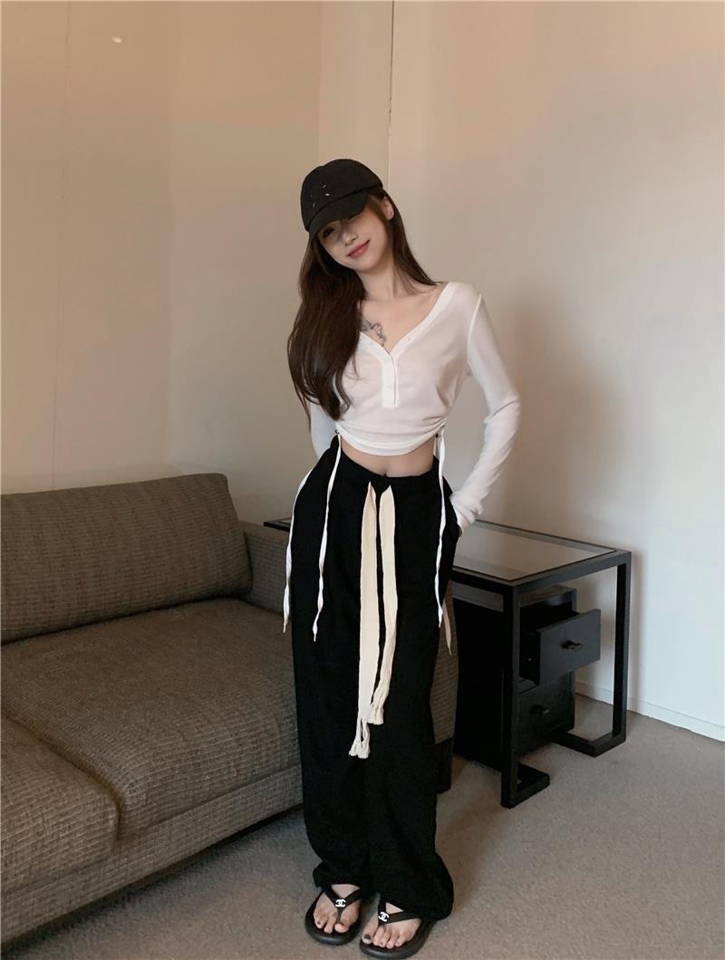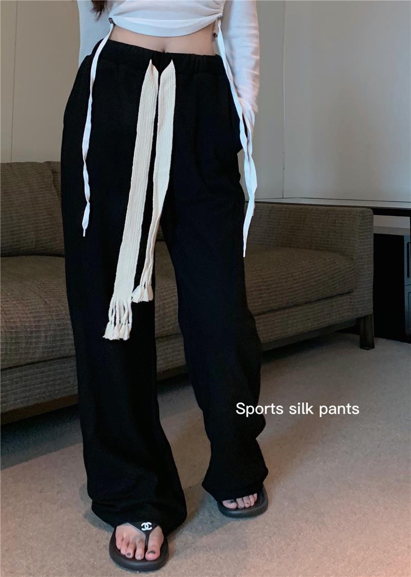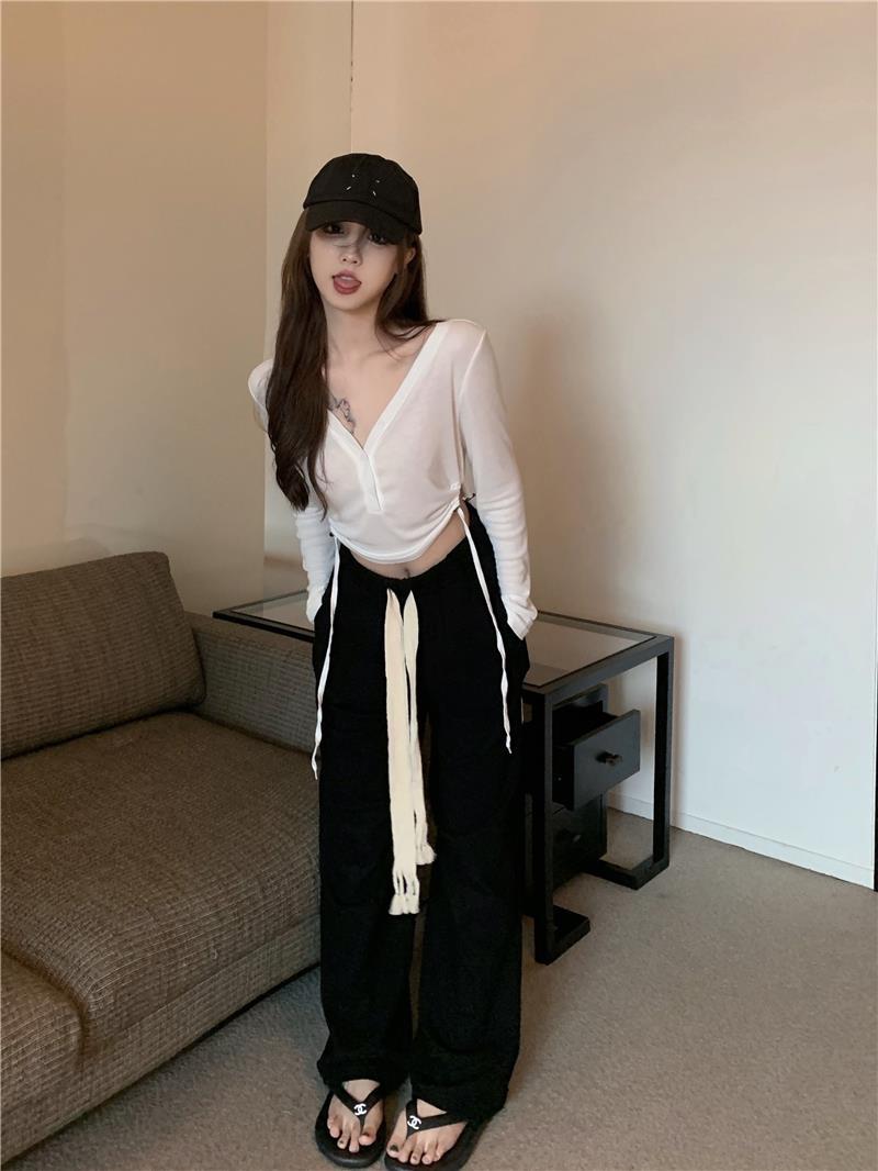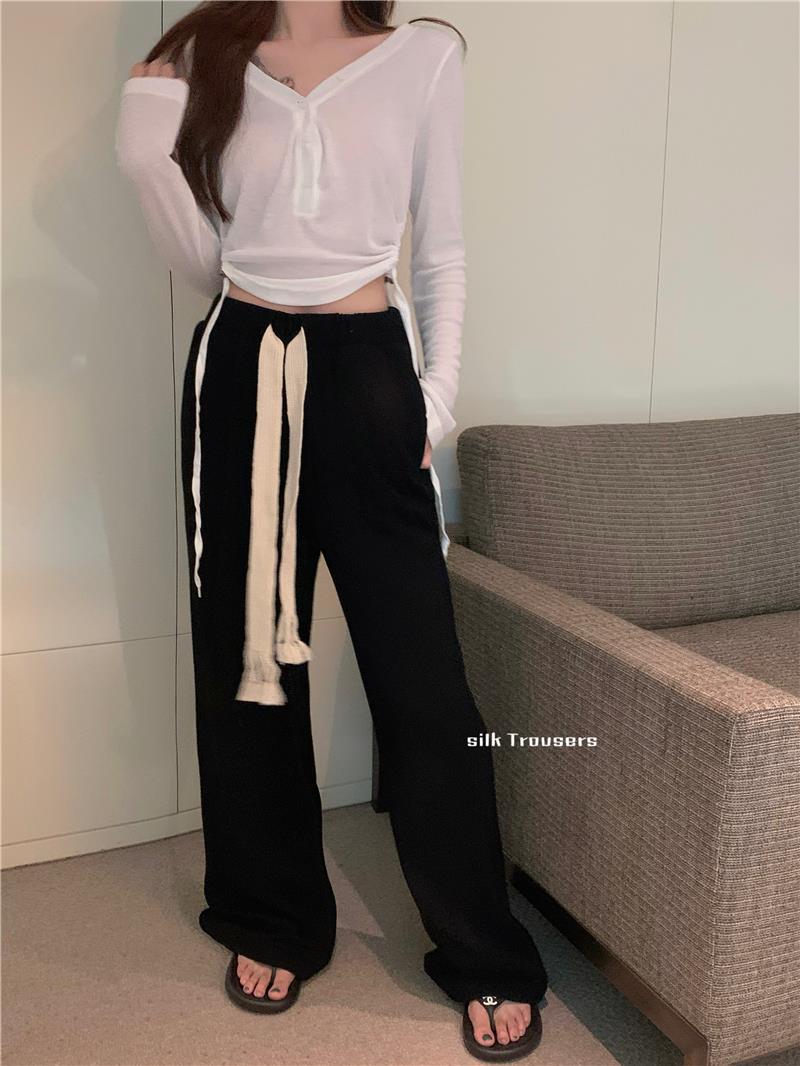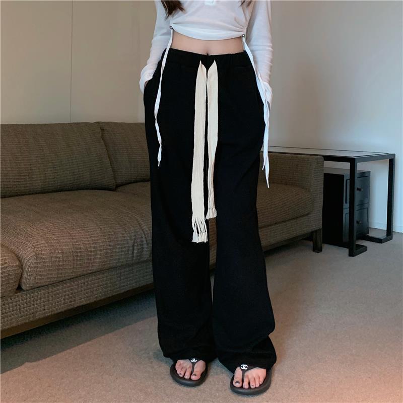 Pantalones casuales negros con cordón ajustable para mujer, pantalones holgados de cintura alta y pierna ancha, pantalones rectos finos de verano