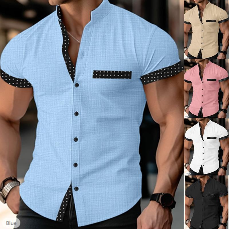 Compra Camisa de comercio exterior para hombre, cárdigan de manga corta con cuello alto, informal, de verano, de algodón y lino, con contraste de color, 2024 al por mayor en Joom.pro