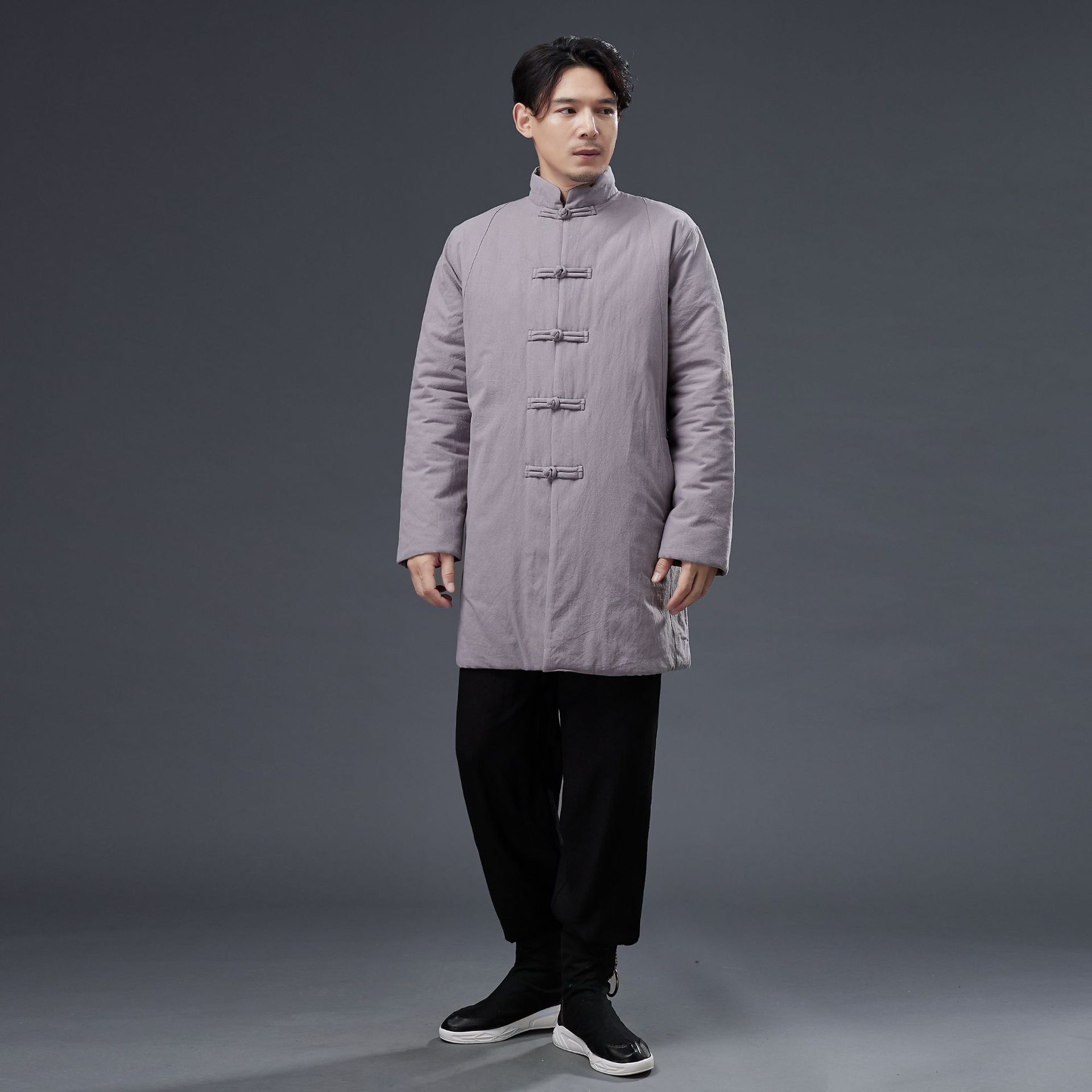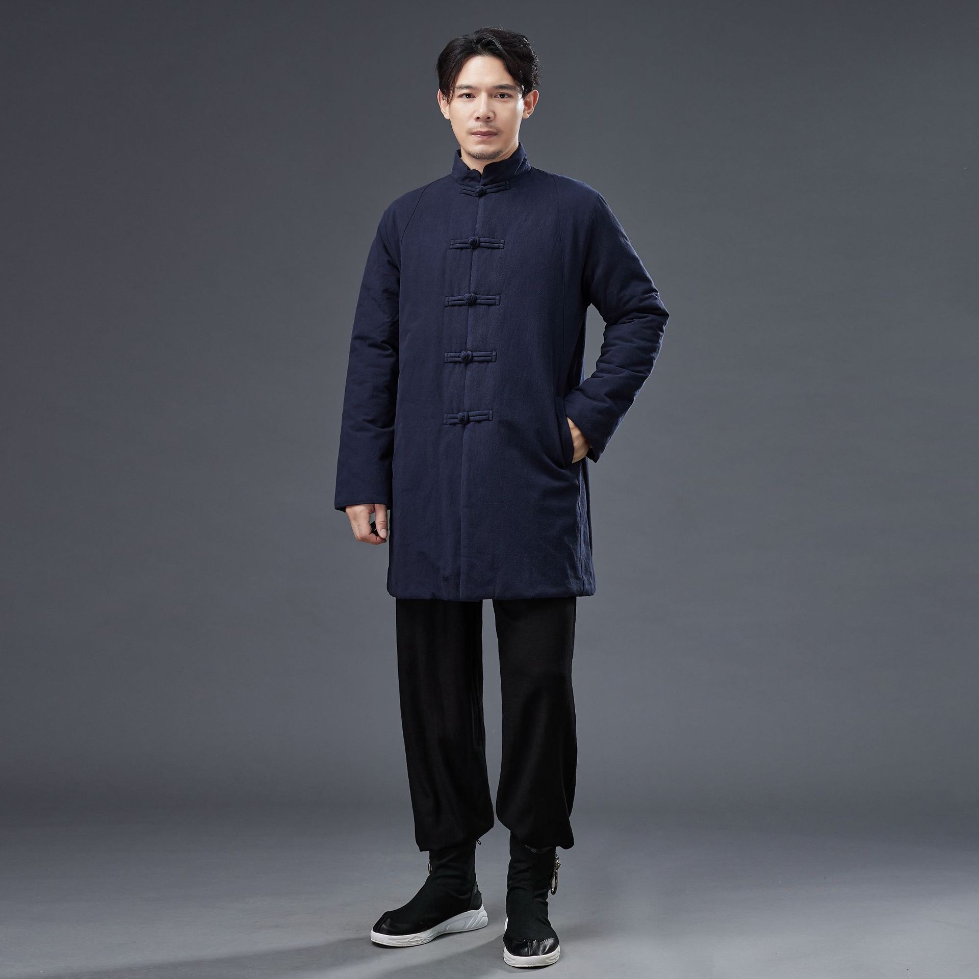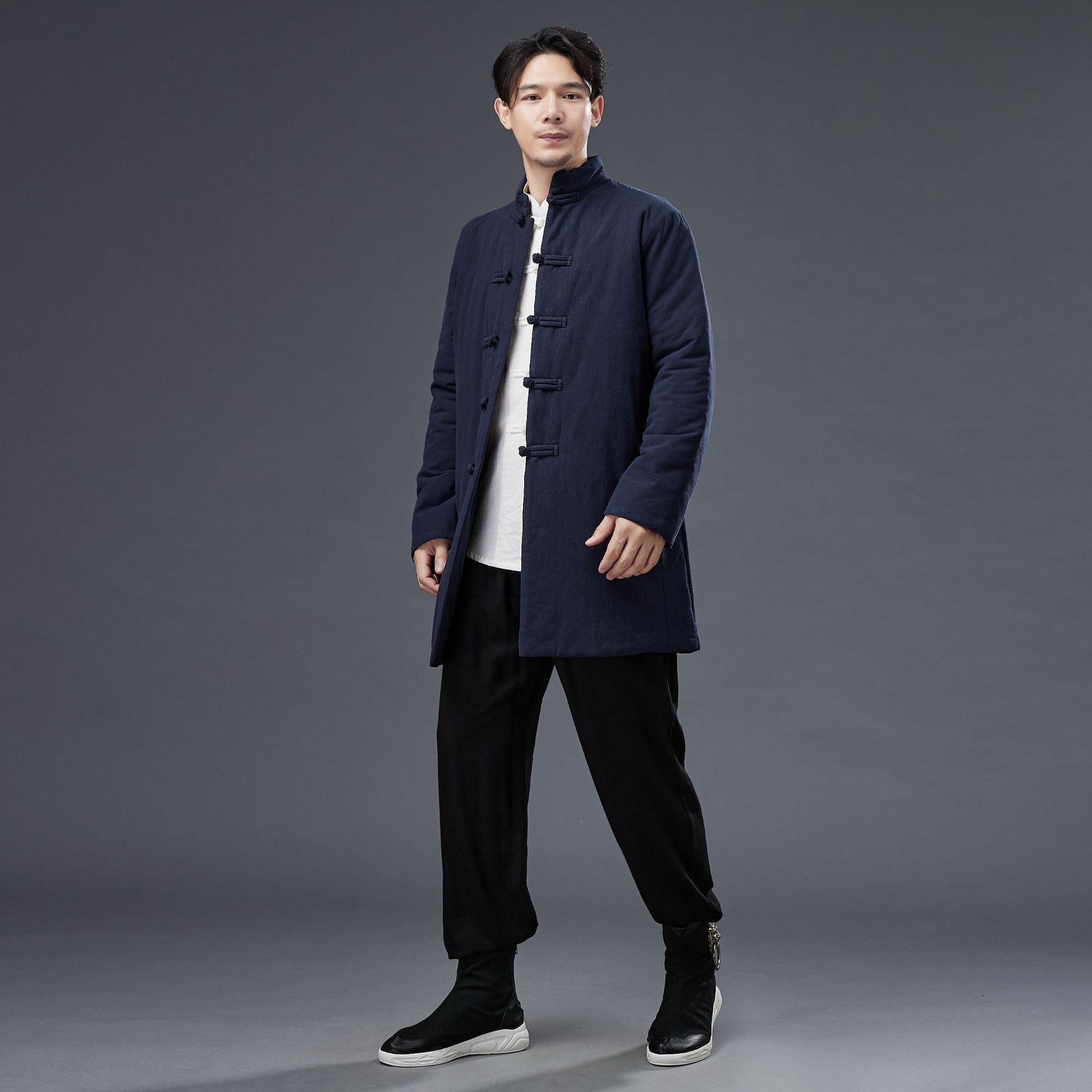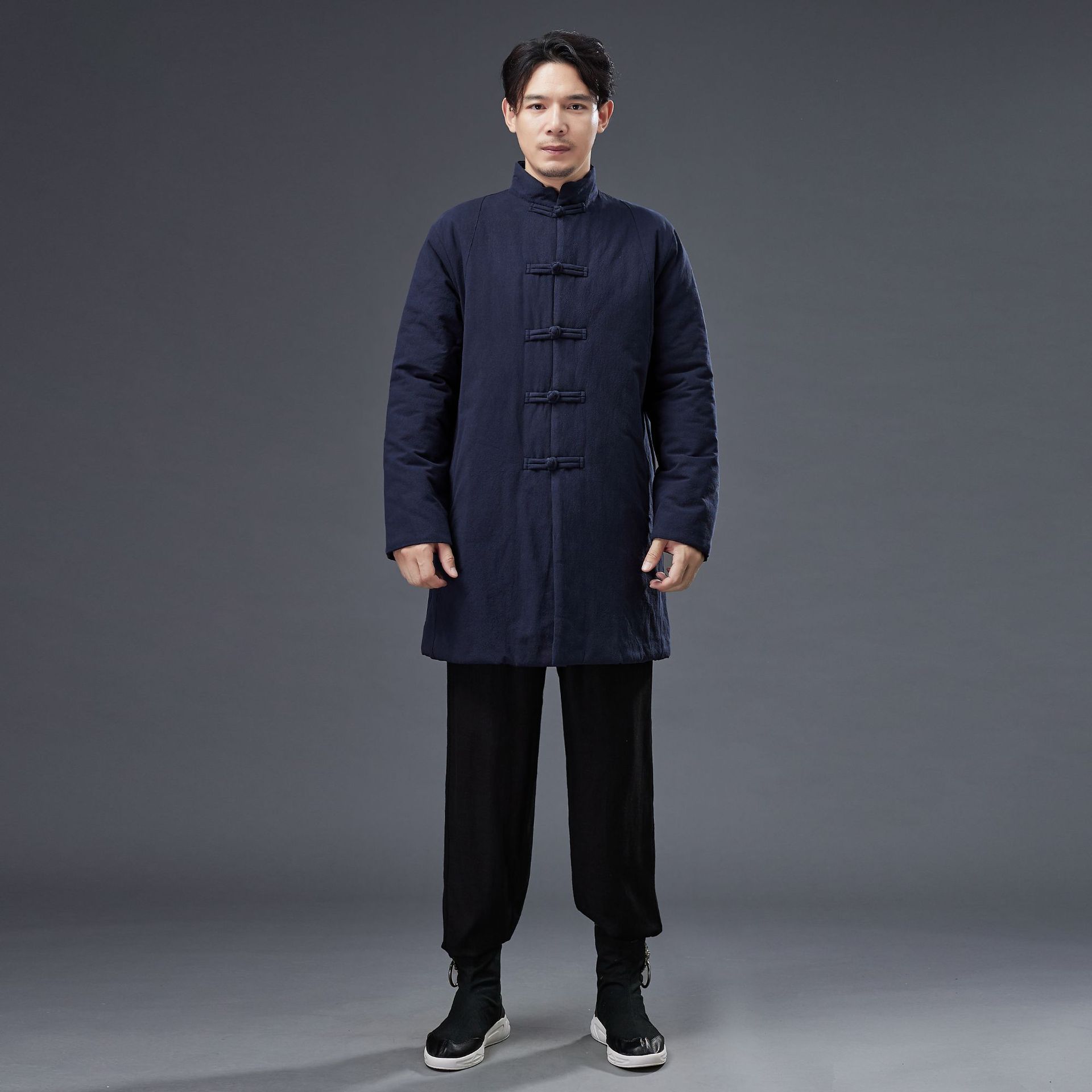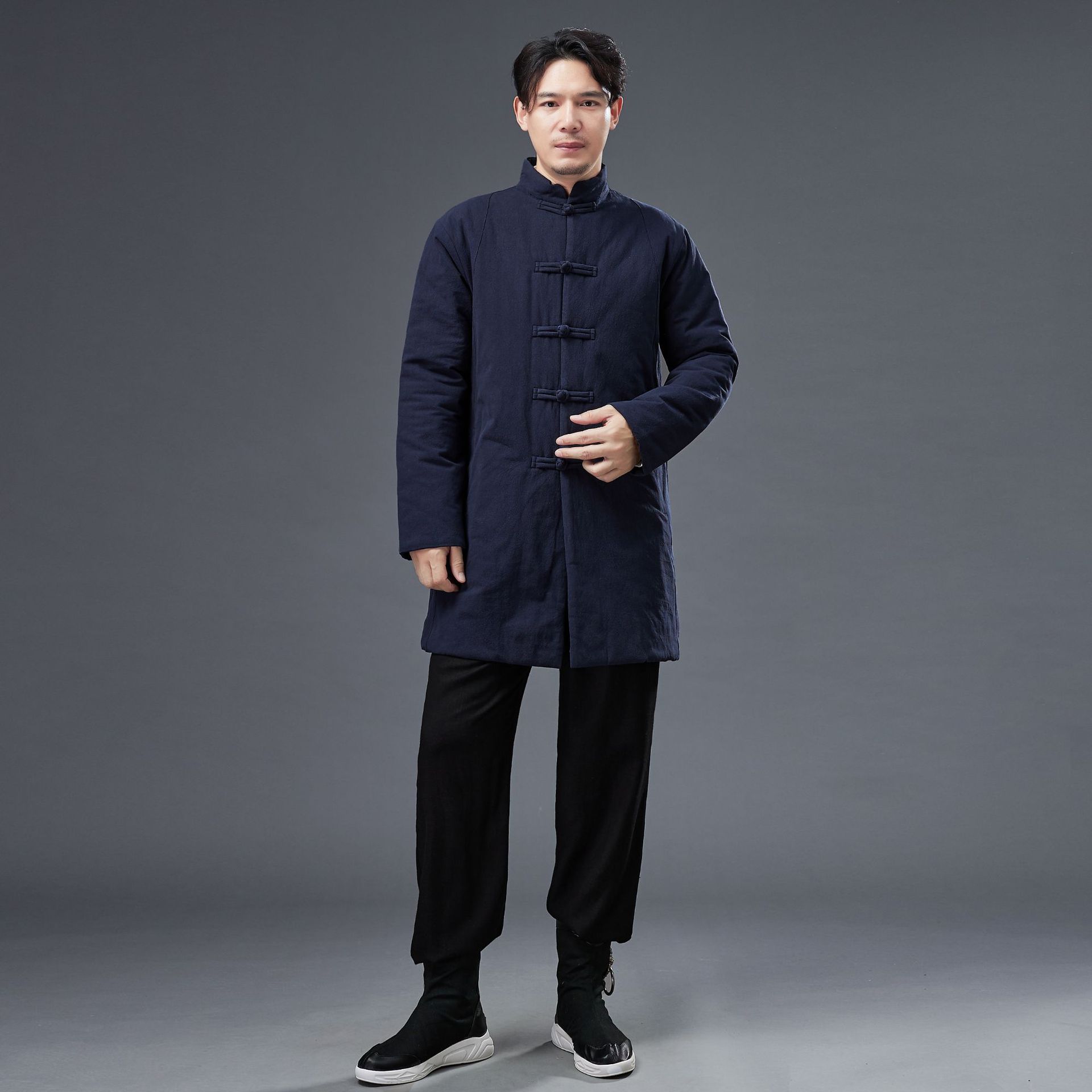 Otoño e Invierno Nuevo Abrigo Acolchado de Algodón para Hombre Abrigo Largo Medio Estilo Chino Chaqueta Acolchada de Algodón Hebilla Hecha a Mano Cuello Vertical Chaqueta Acolchada de Algodón Cálida