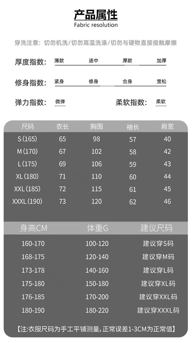 S/165, M/170, L/175, XL/180, 2XL/185, 3XL/190