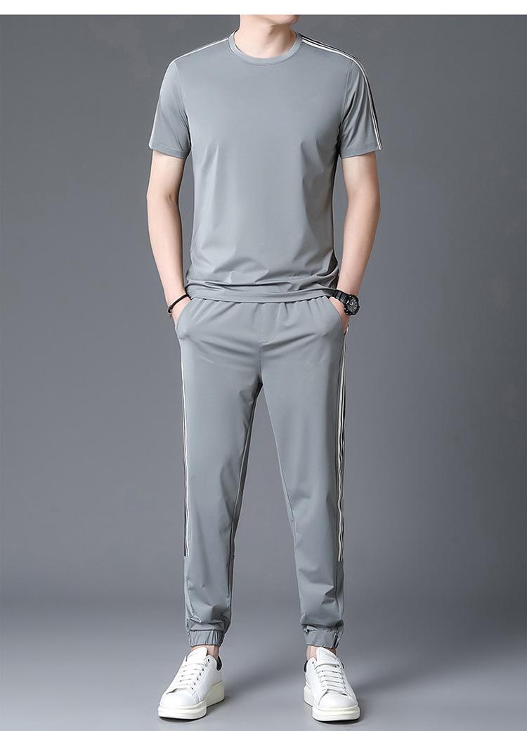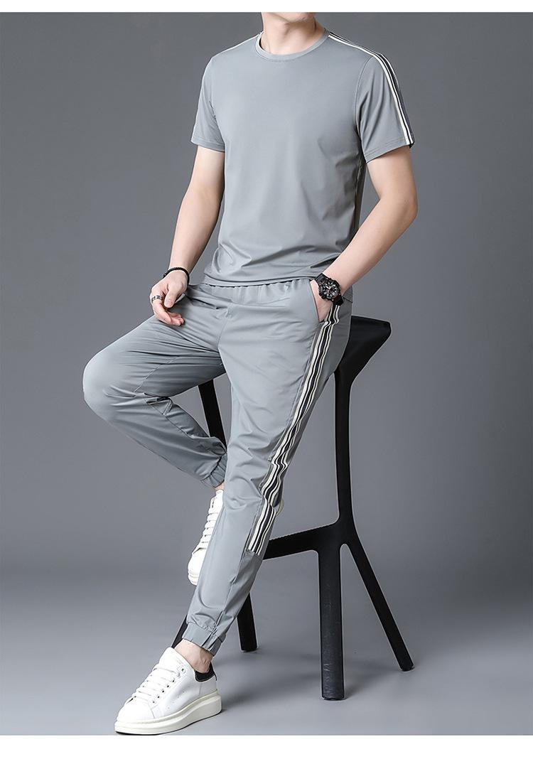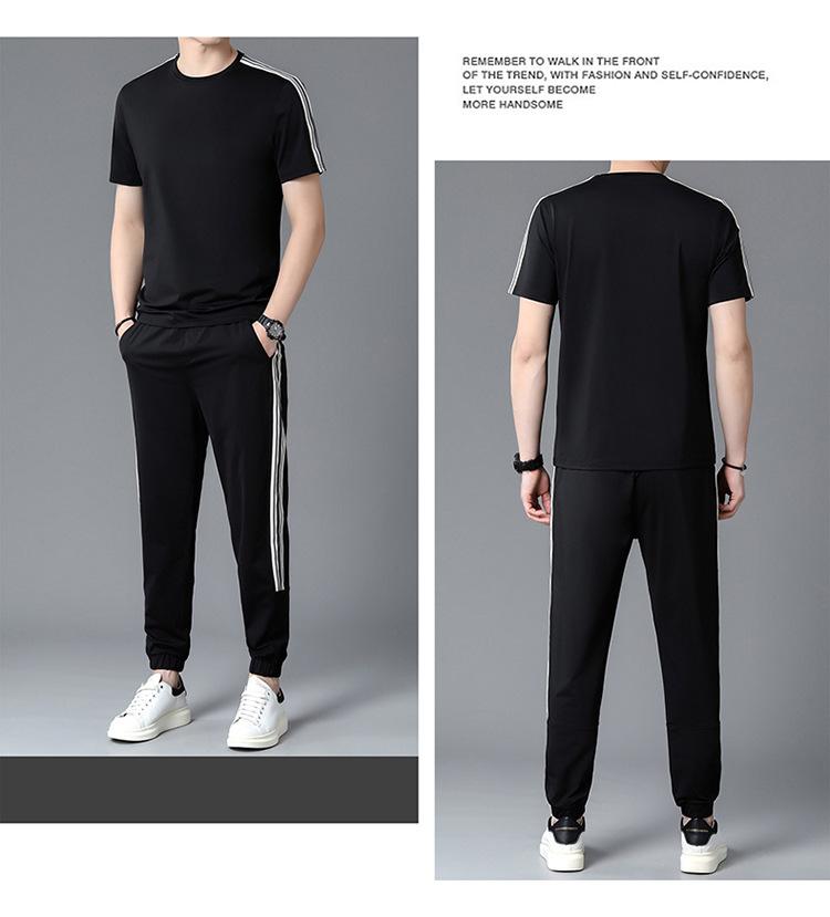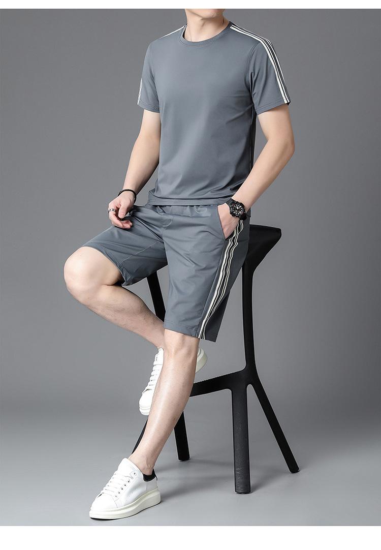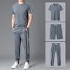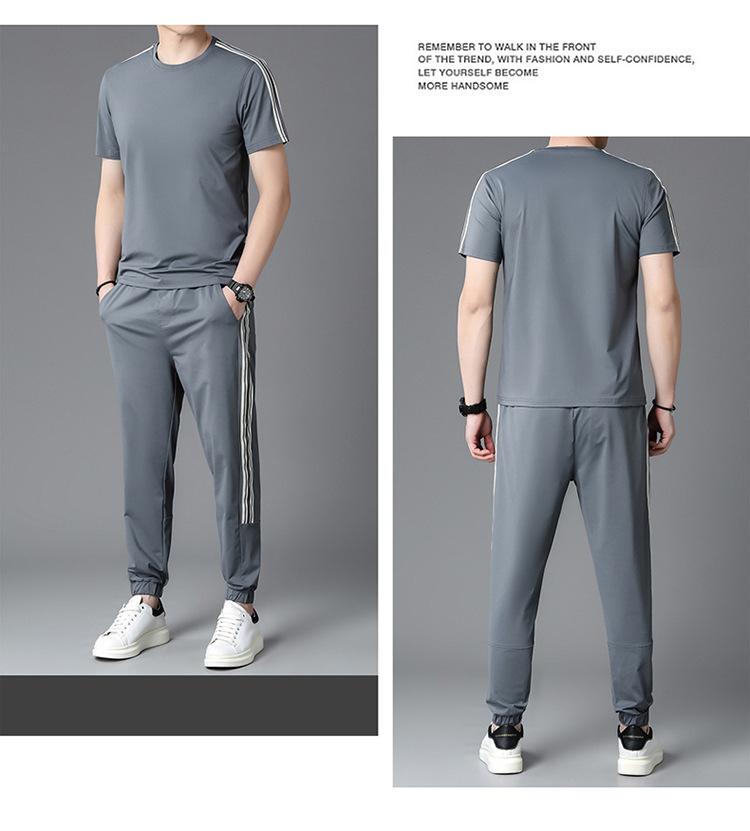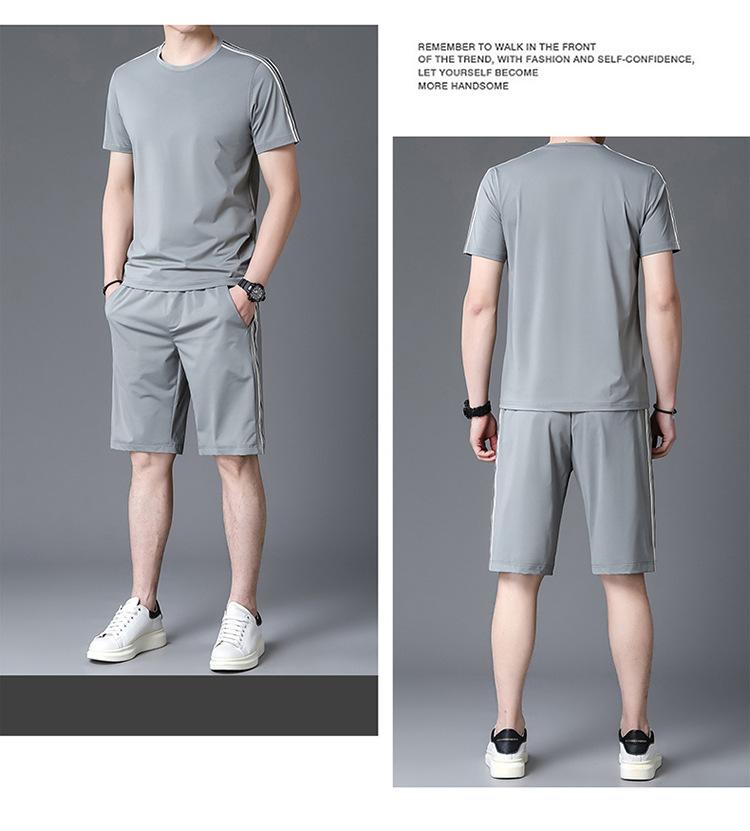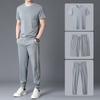 Conjunto de dos piezas de manga corta para hombre de verano 2025, camiseta casual de moda, pantalones deportivos holgados, traje de tres piezas de seda de hielo