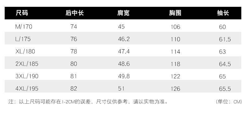 170/M, 175/L, 180/XL, 185/XXL, 190/3XL, 195/4XL