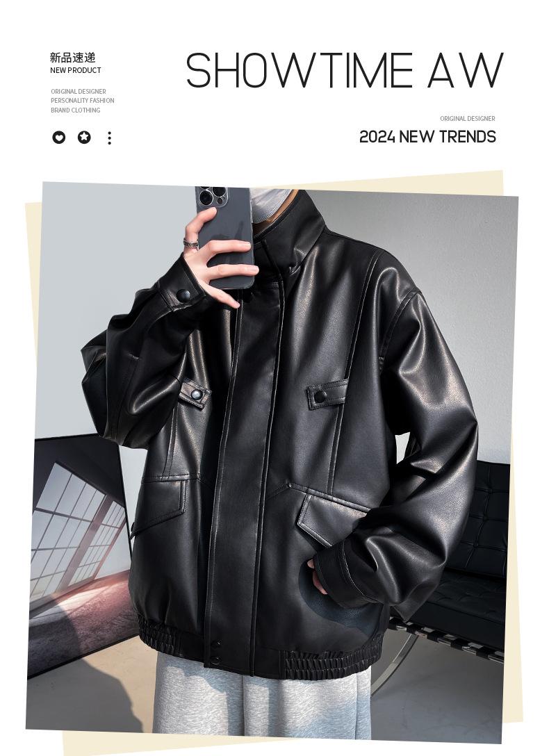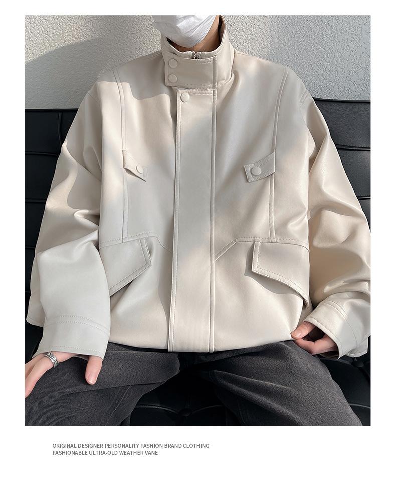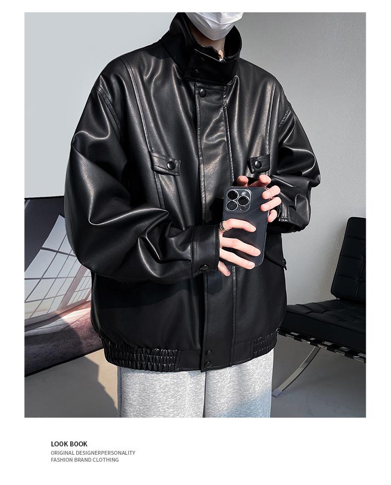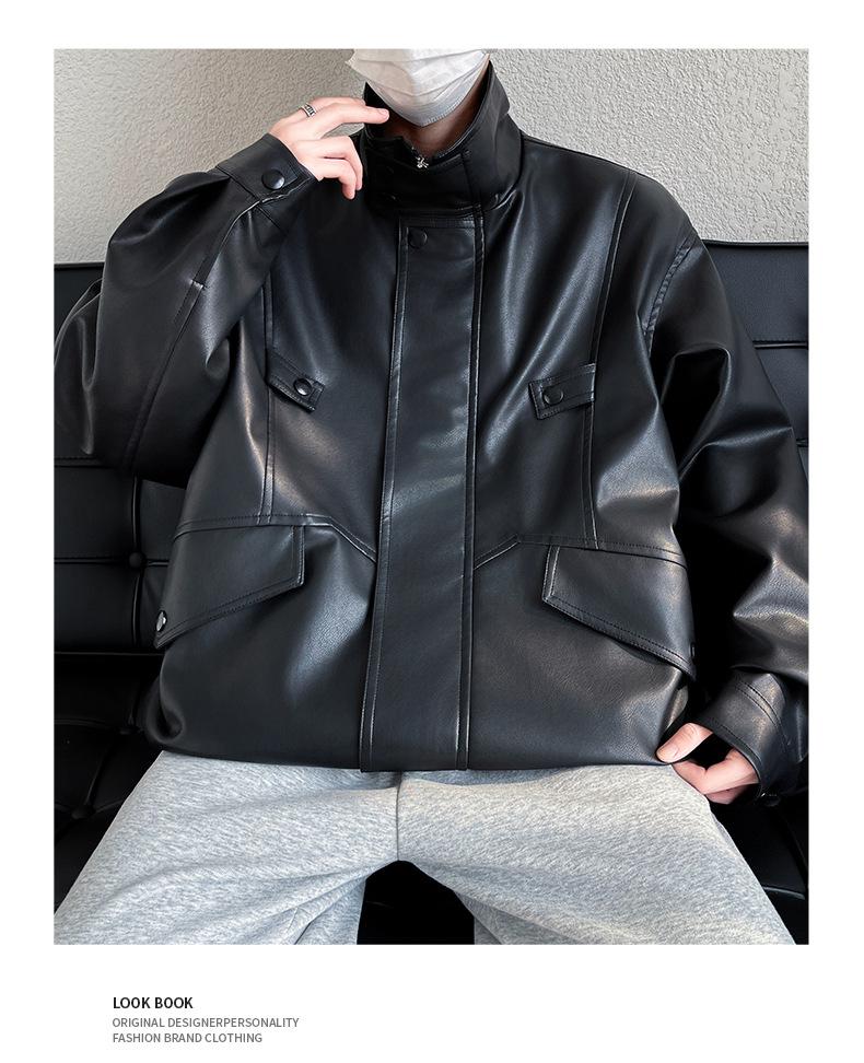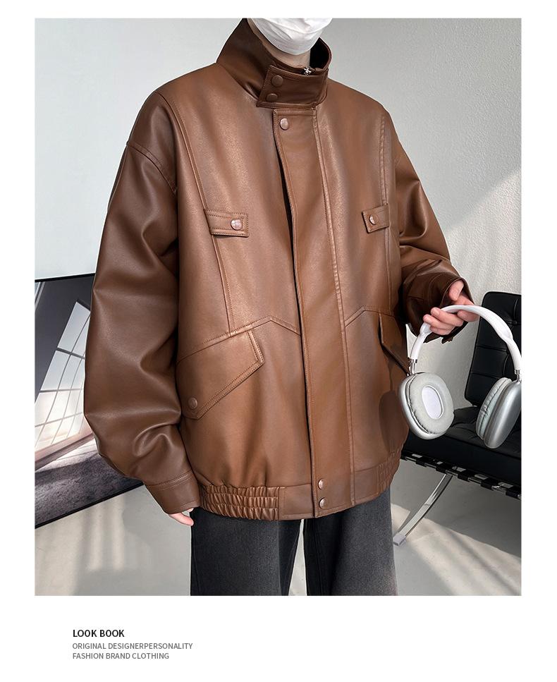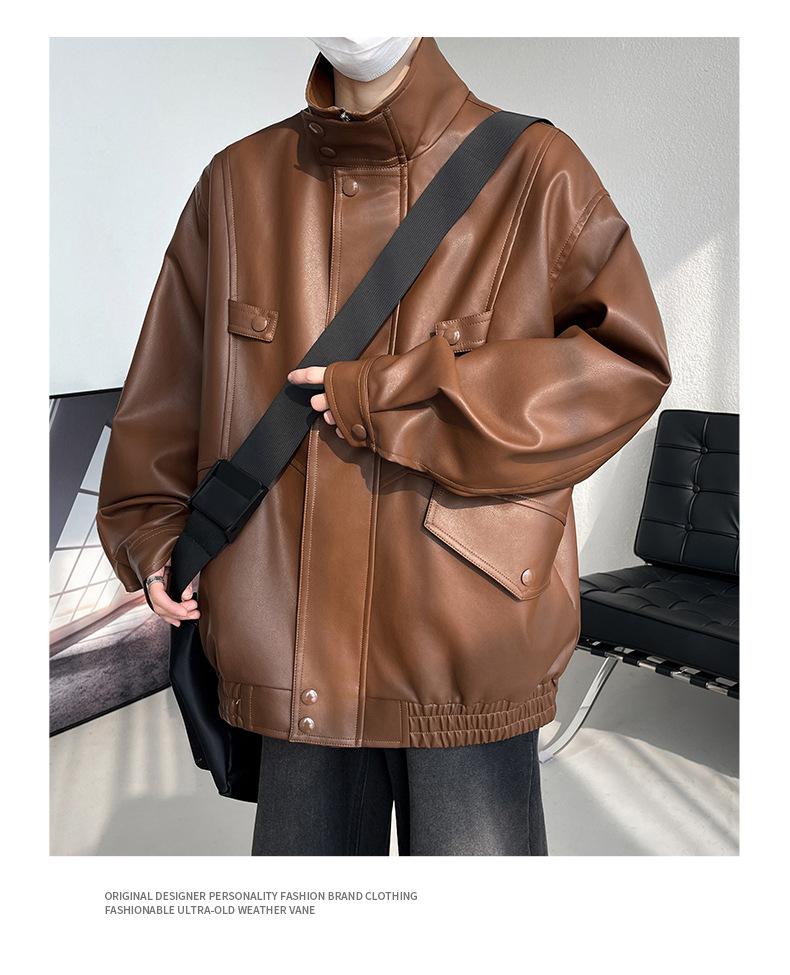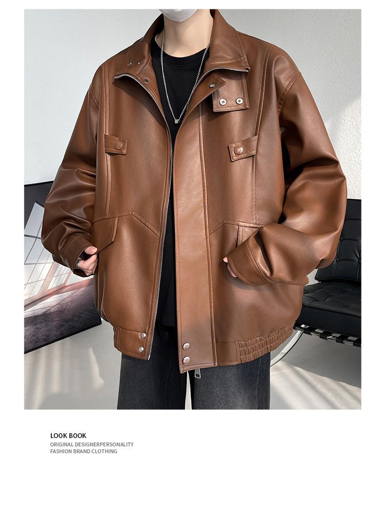 Chaqueta de cuero de motocicleta con cuello alto para hombre, abrigo de cuero de marca de moda de color sólido estadounidense para hombre, abrigo nuevo de primavera y otoño