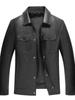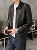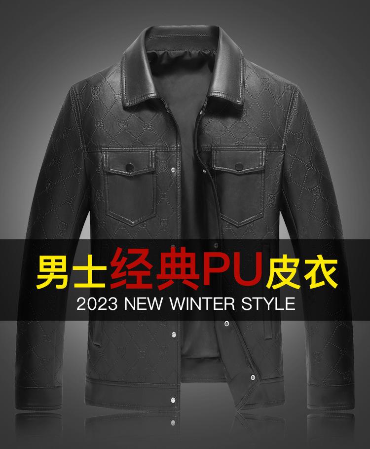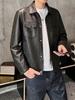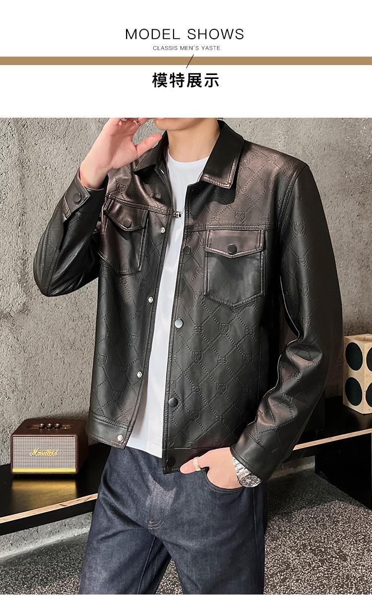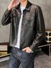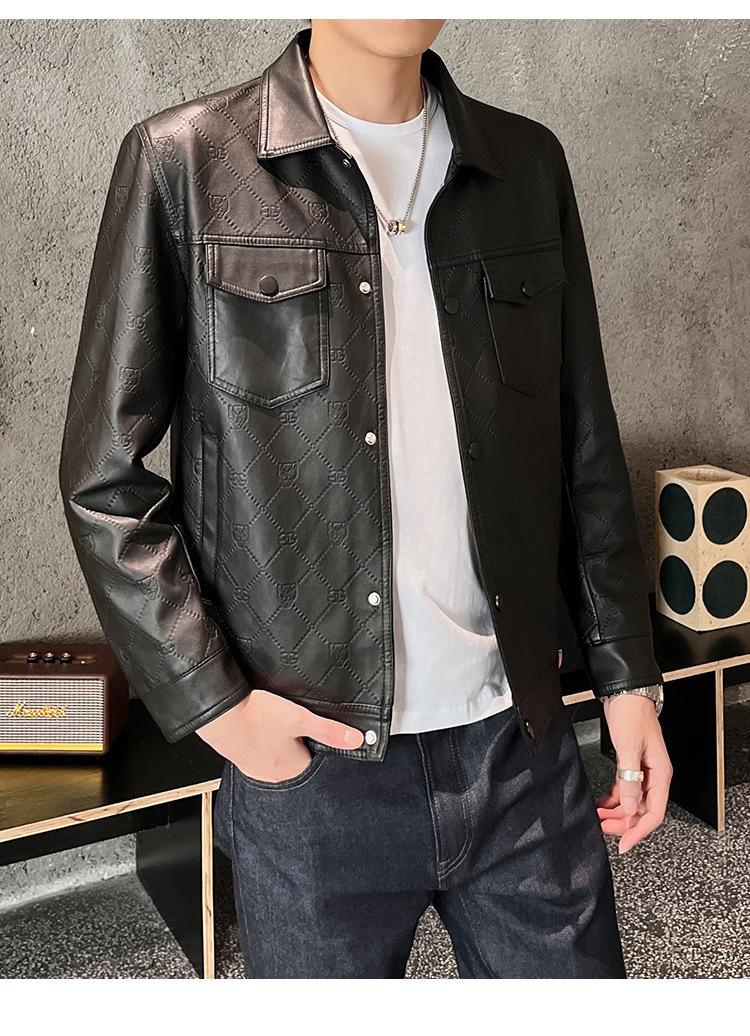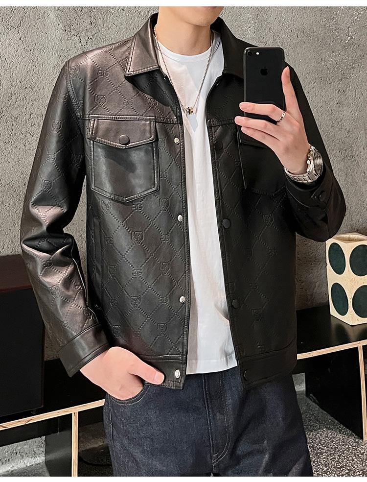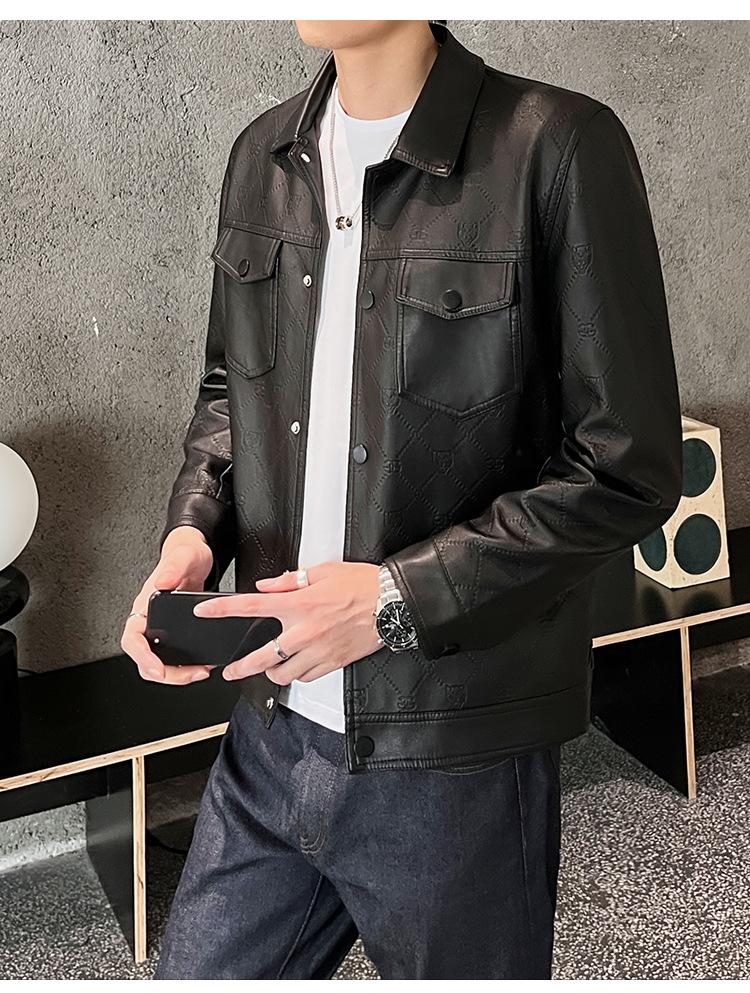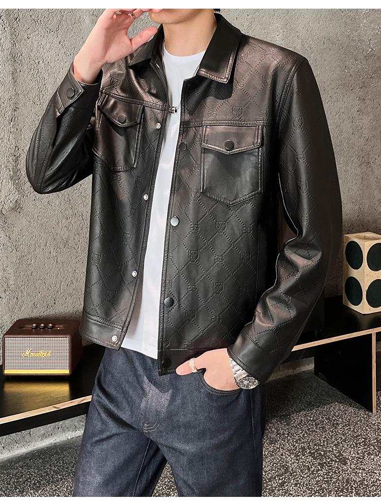Chaqueta de cuero para hombre nueva de primavera y otoño de 2023, chaqueta de cuero con solapa simple, chaqueta de motociclista estampada a la moda para hombre, elegante y a la moda.