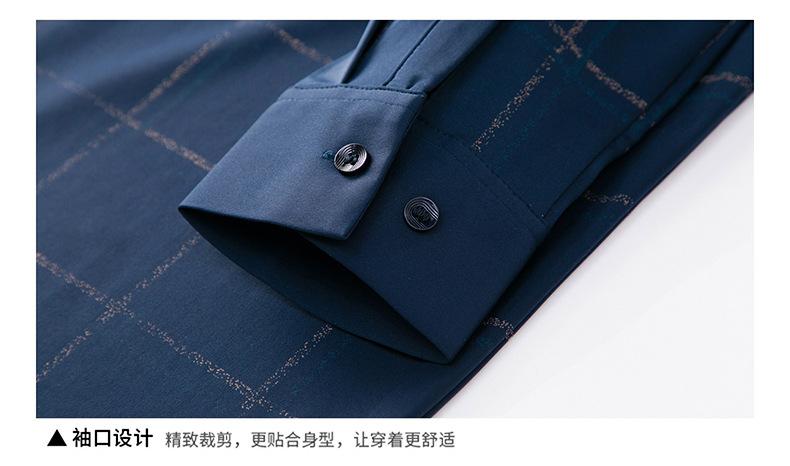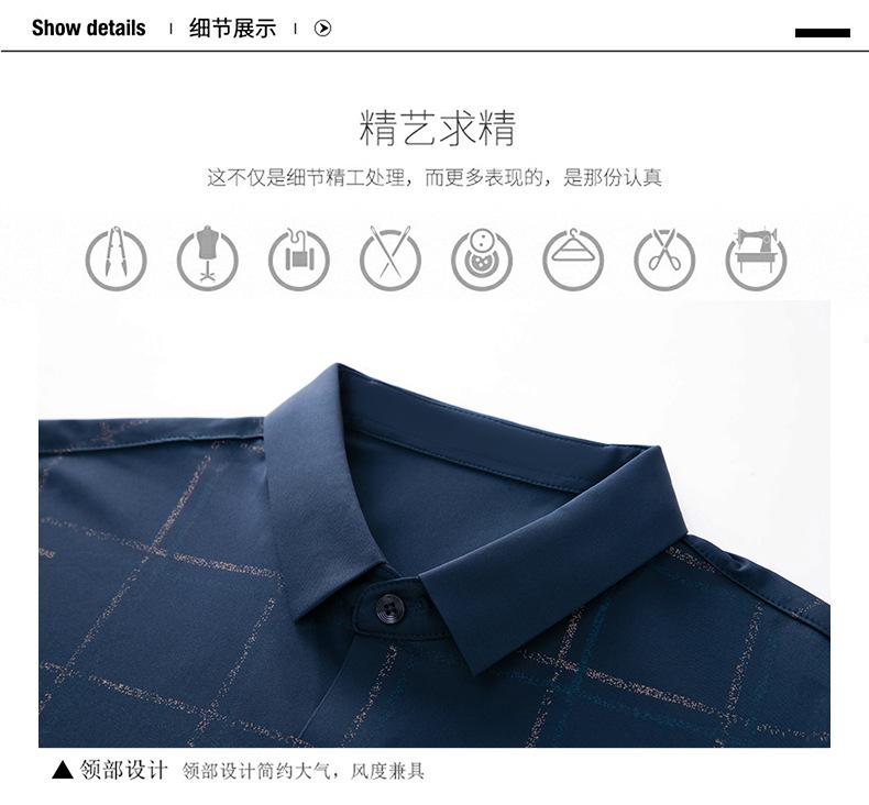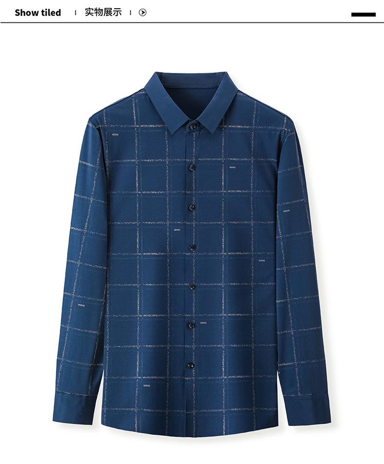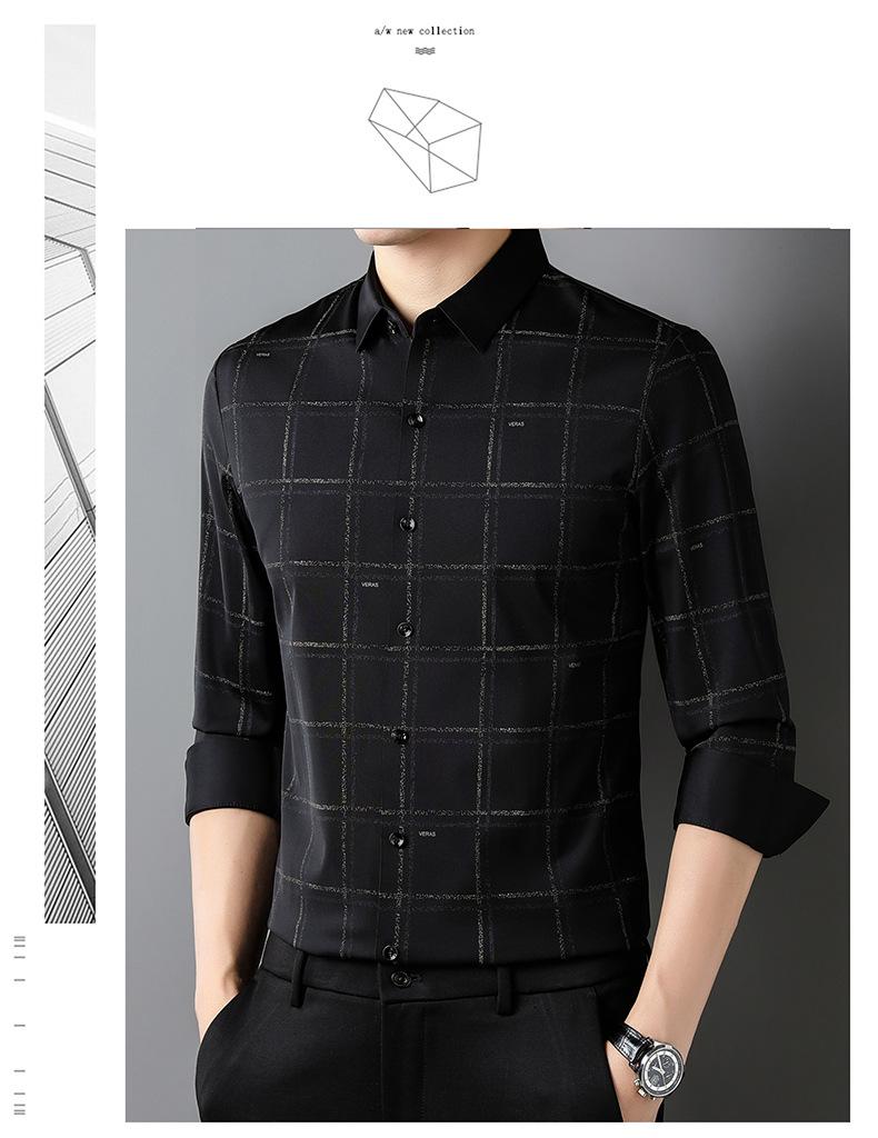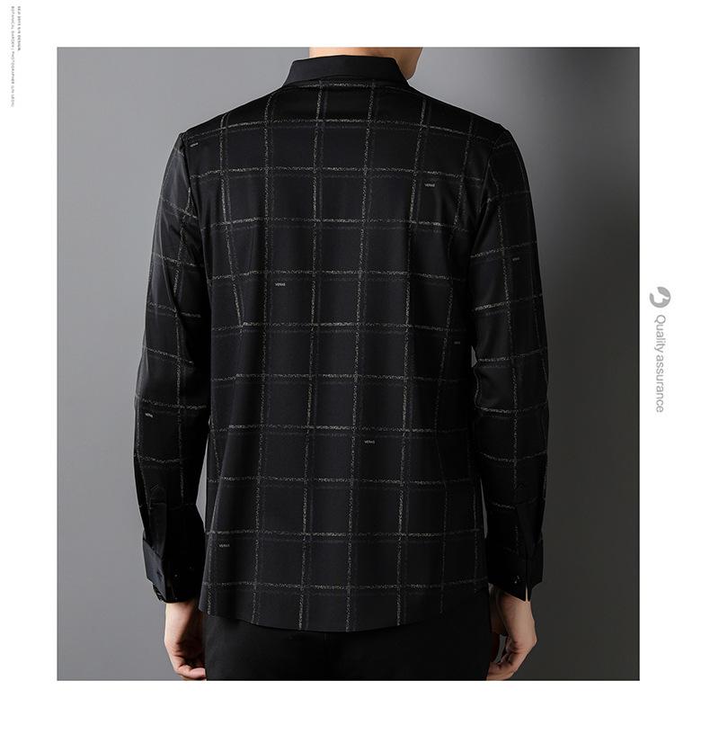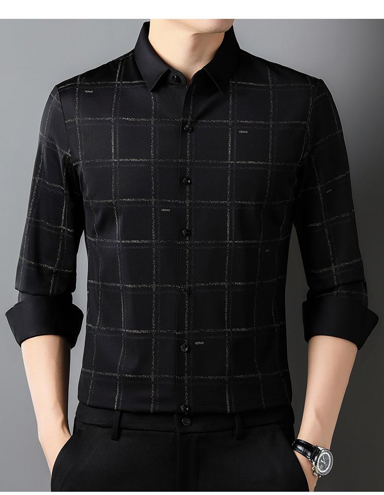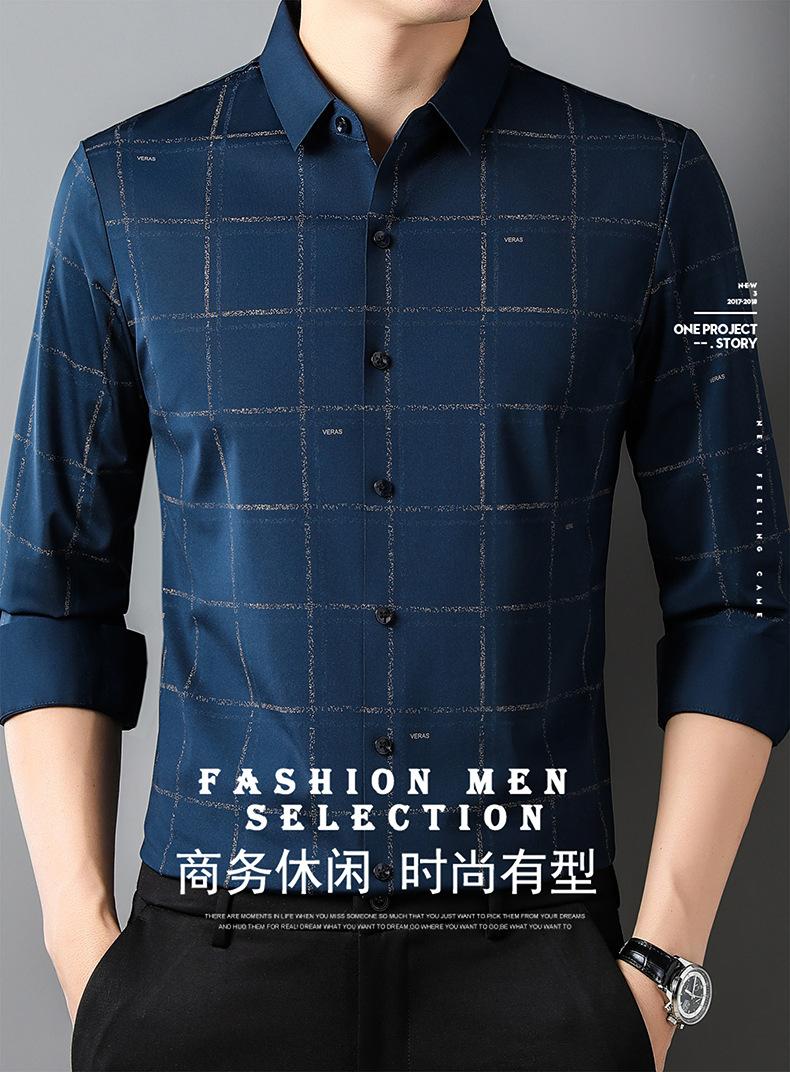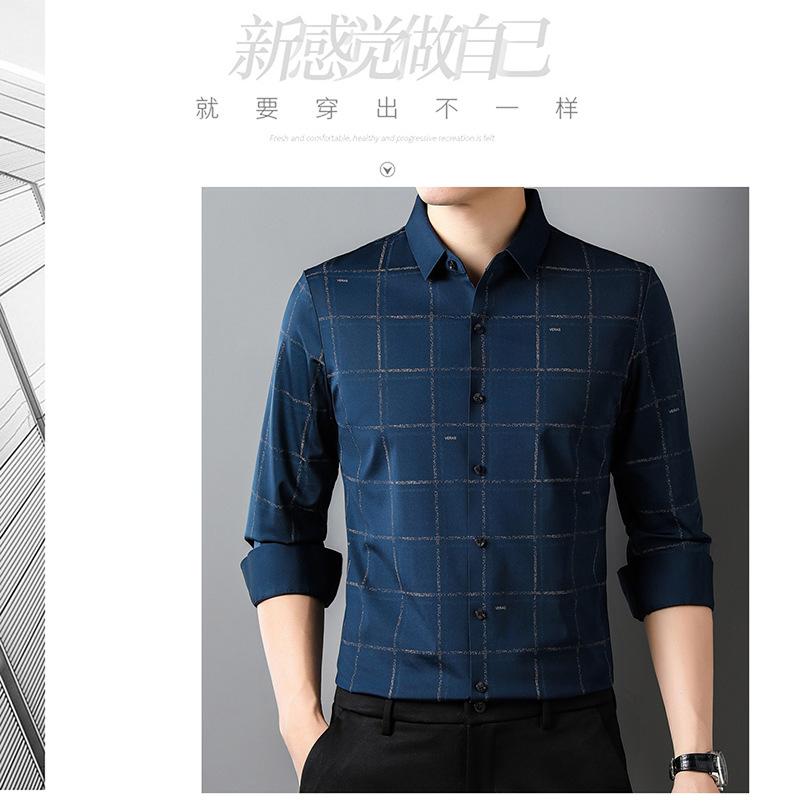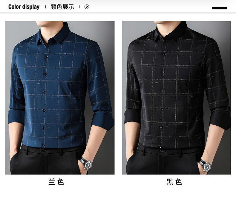 Camisa de hombre de primavera y otoño de manga larga de negocios de moda para papá, camisa fina a cuadros de seda de hielo de moda sin dejar huellas, cómoda