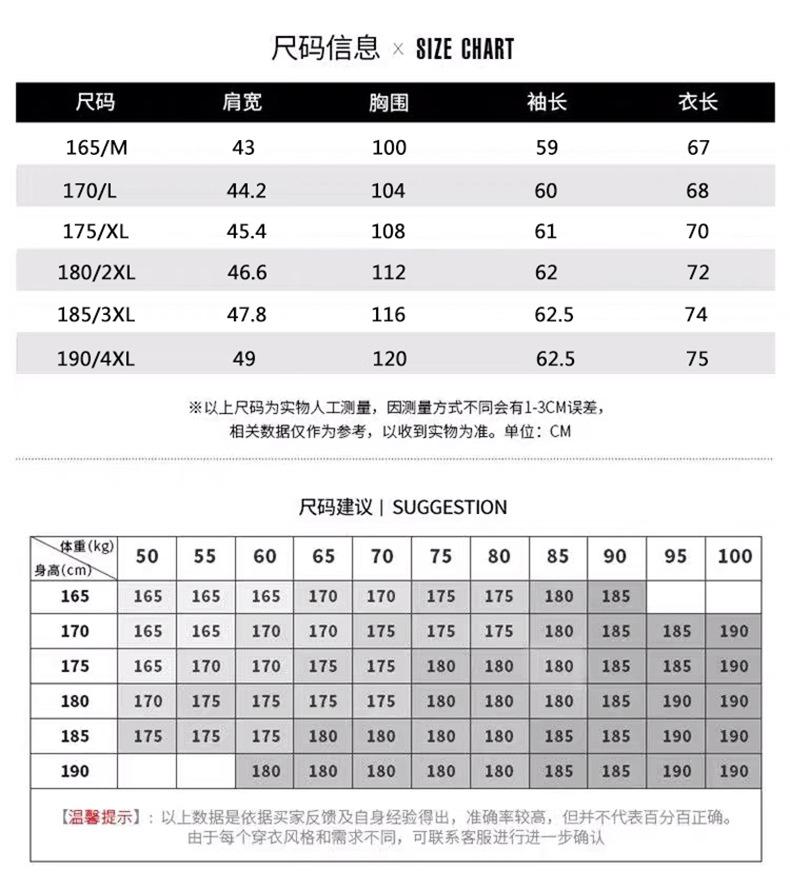 165/M, 170/L, 175/XL, 180/2XL, 185/3XL, 190/4XL