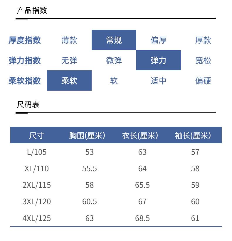 L/105, XL/110, 2XL/115, 3XL/120, 4XL/125