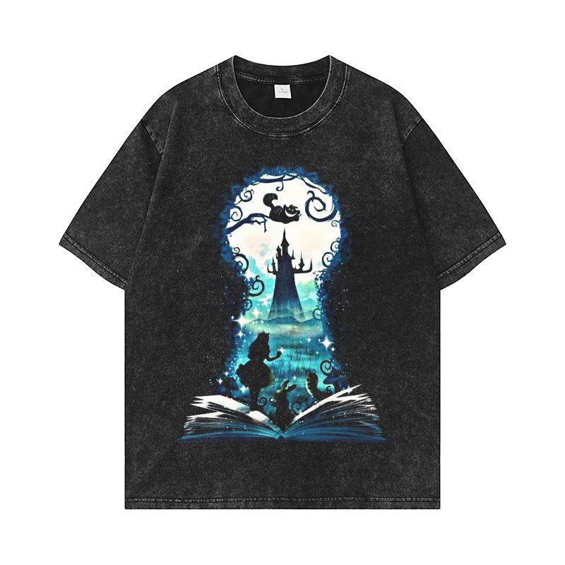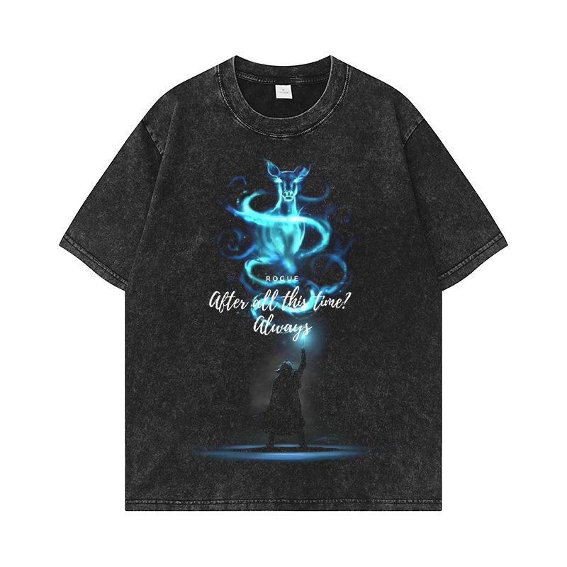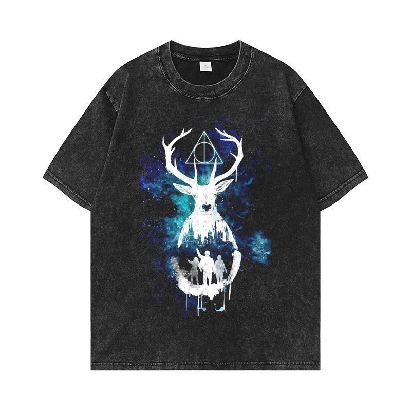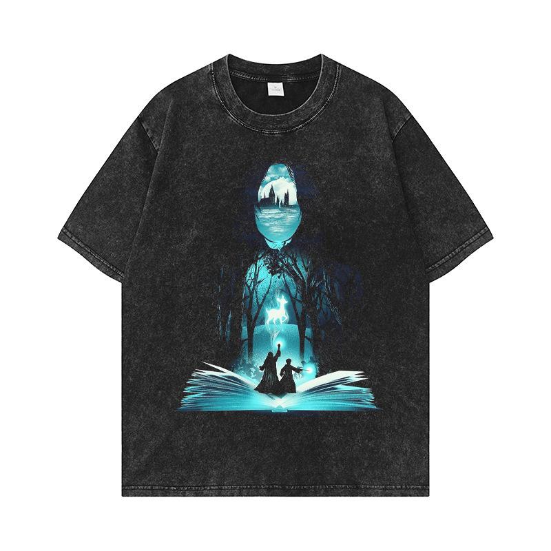Camiseta desgastada retro lavada con estampado de Harry Potter, informal, de verano, para todo tipo de combinaciones, marca de moda americana, holgada, inyección directa digital