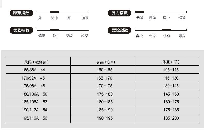 165/80A(S), 170/84A(M), 175/88A(L), 180/92A(XL), 190/100A(3XL), 185/96A(XXL), 195/104A/4XL
