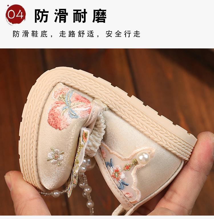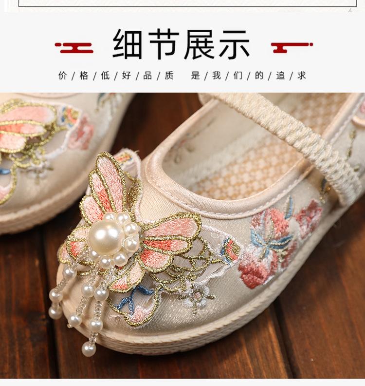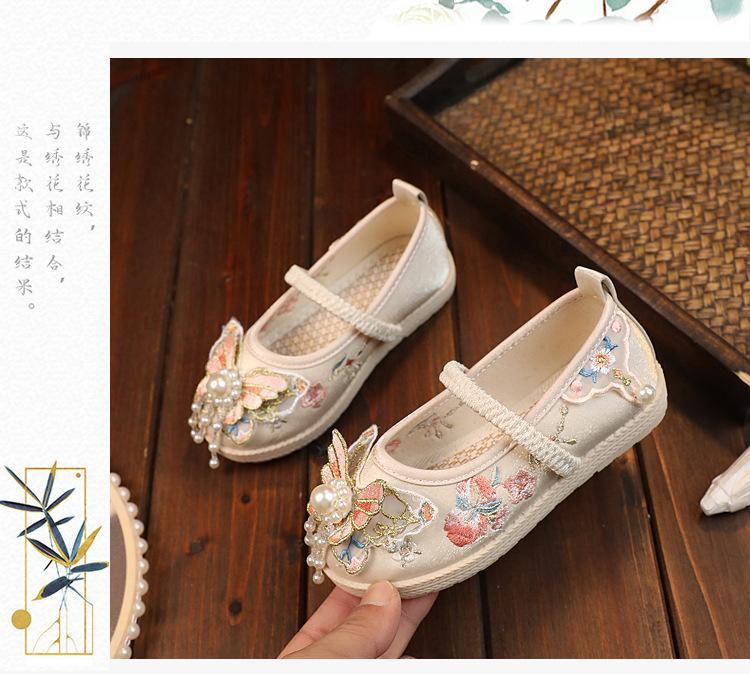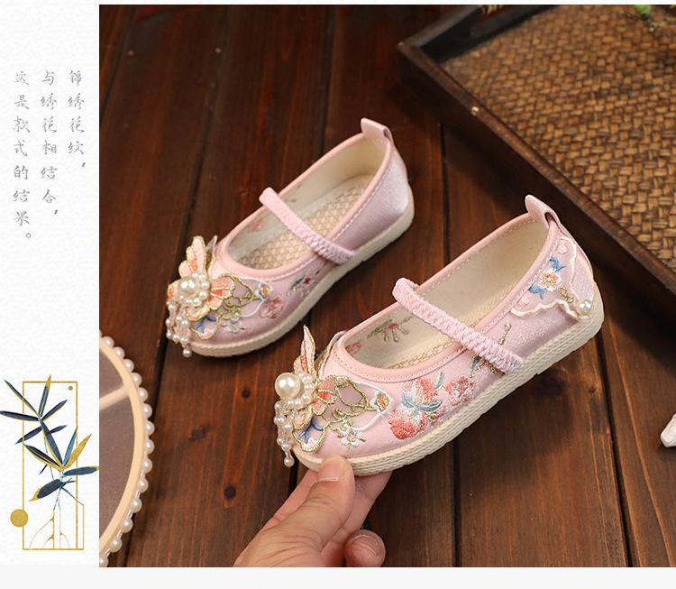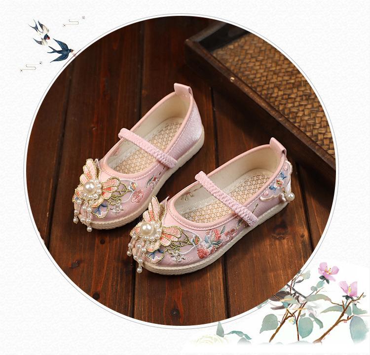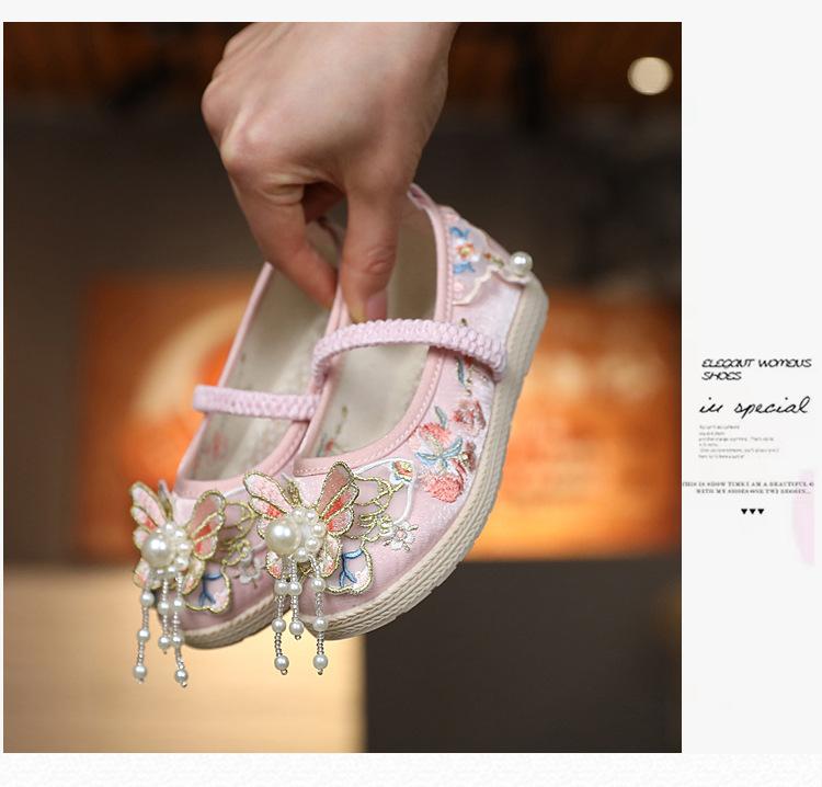 Zapatos bordados Hanfu para niñas, estilo princesa, traje antiguo, zapatos de tela antiguos de Beijing, zapatos bordados de rendimiento étnico, suela de tendón de buey, para danza infantil.