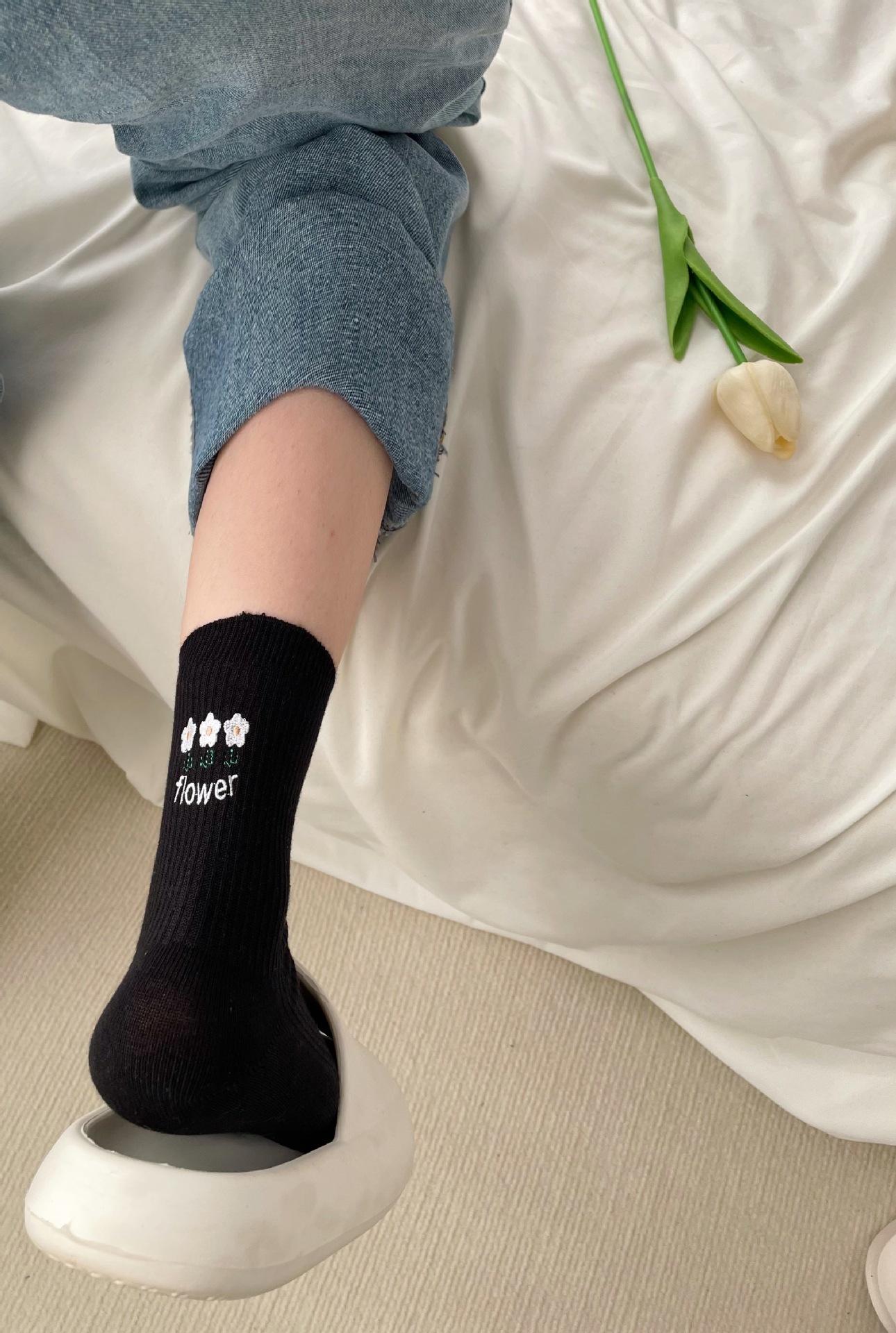 Calcetines de tubo medio con bordado de flores para mujer, calcetín de primavera y verano, bonitos y finos, transpirables y dulces
