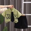 creamy-white tie letter shirt short sleeve suit, Green tie letter shirt short sleeve suit