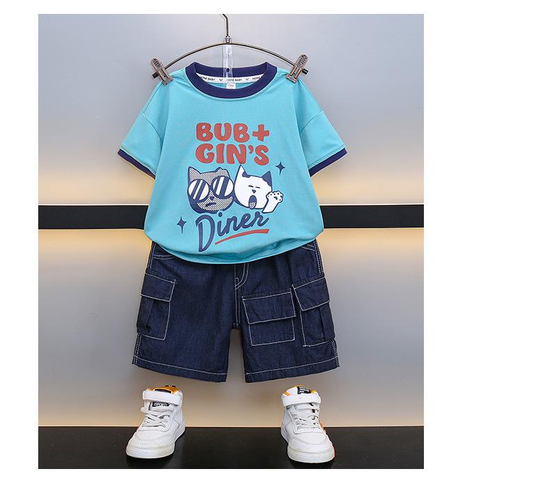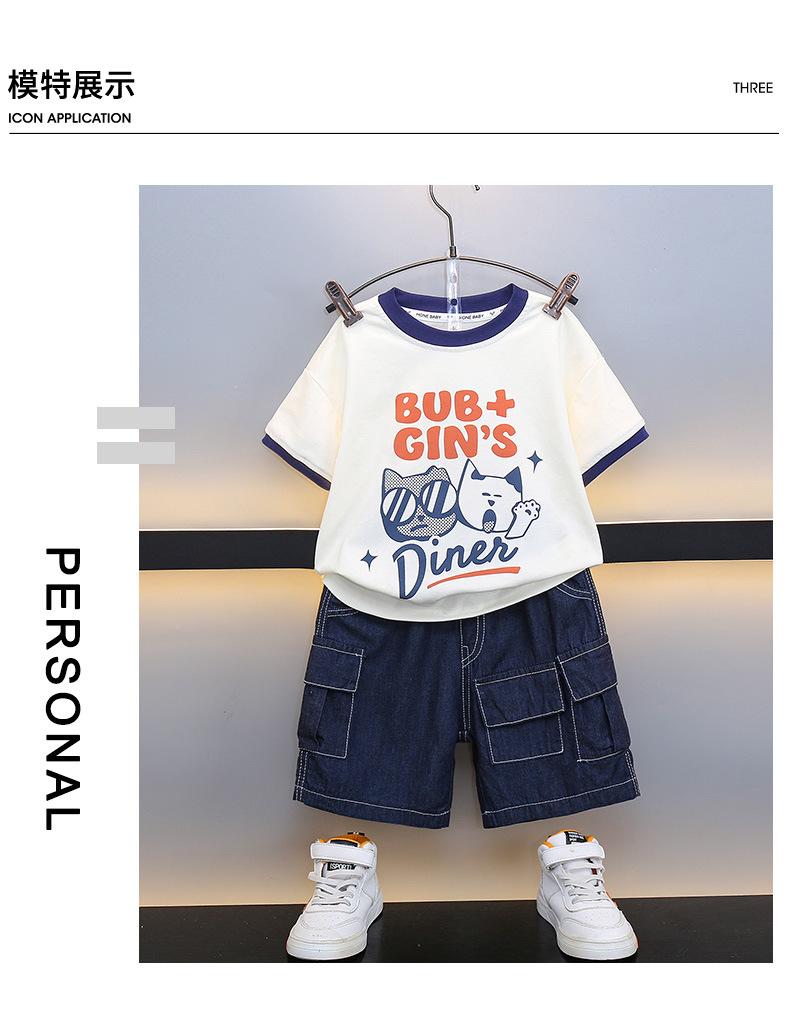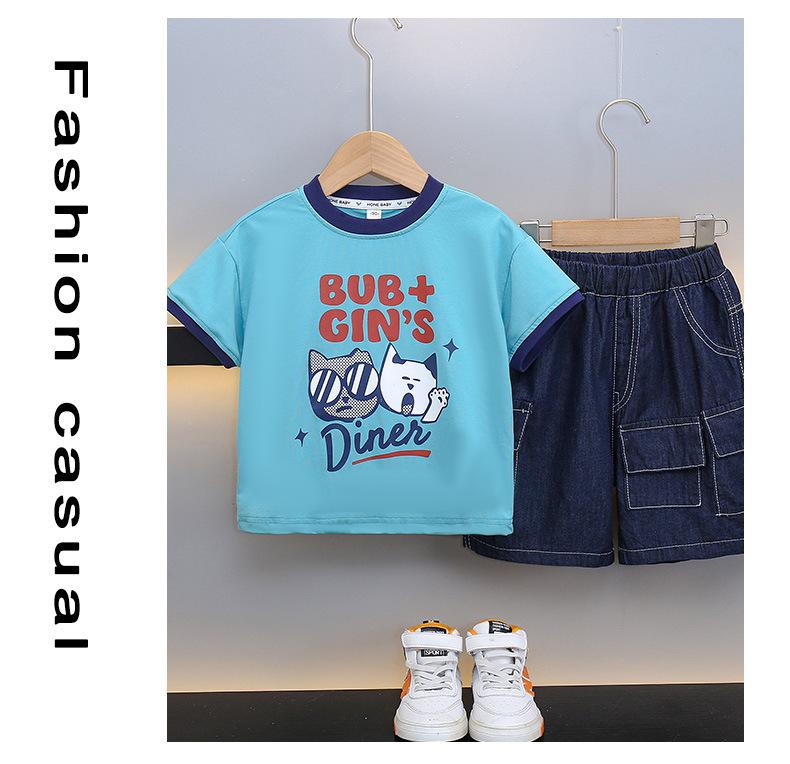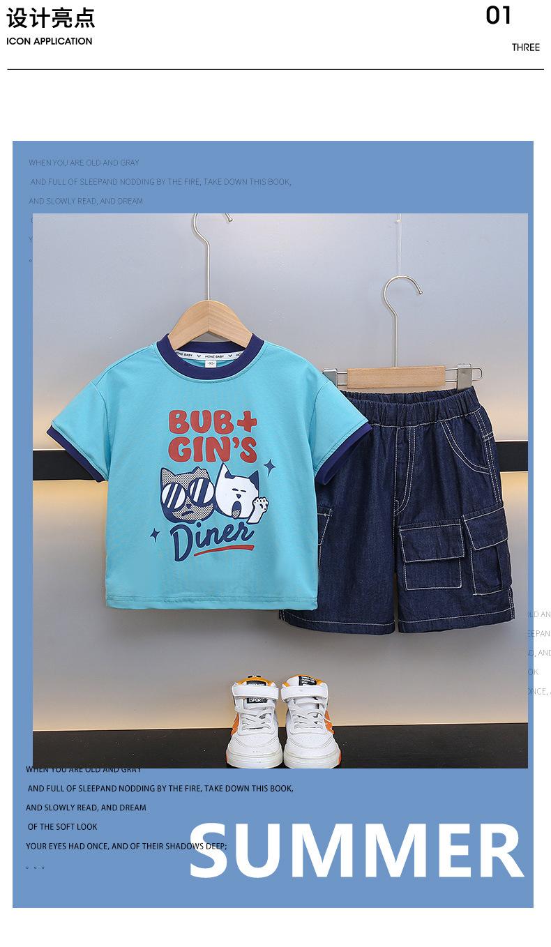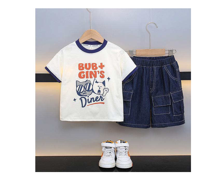 Traje para niño Ropa de verano 2025 Nuevo Conjunto de dos piezas de jeans de manga corta con estampado de dibujos animados delgado para niños pequeños Ropa para bebés y niños pequeños