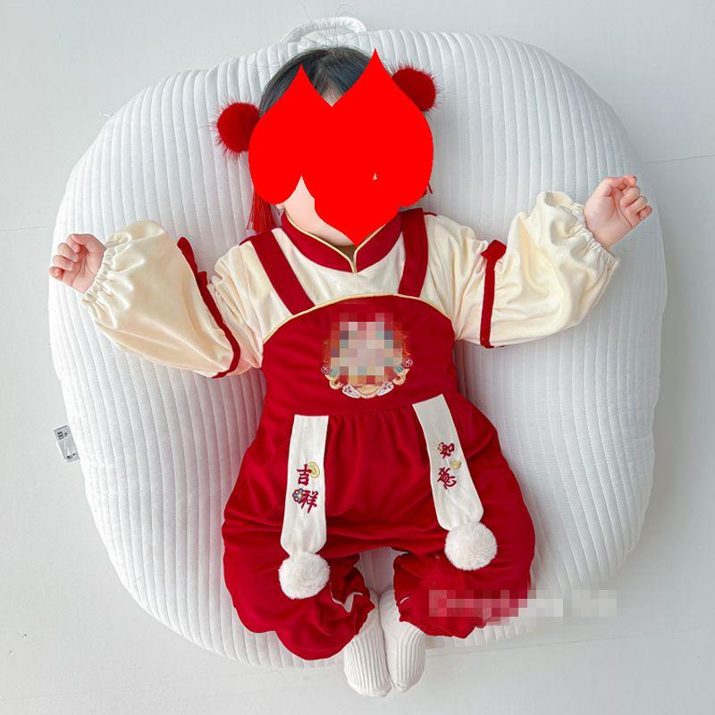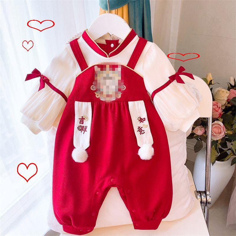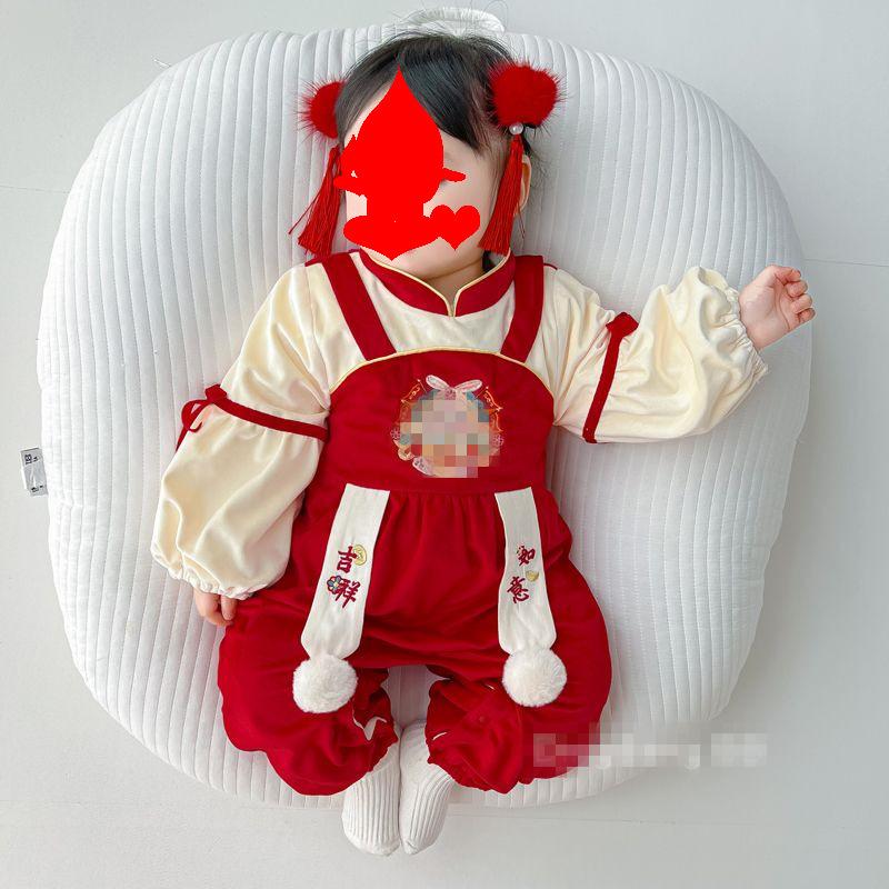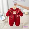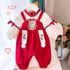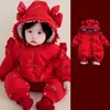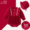 Ropa de bebé otoño e invierno, ropa de una pieza con forro polar, vestido festivo rojo para bebé de 100 días, mono cálido para salir