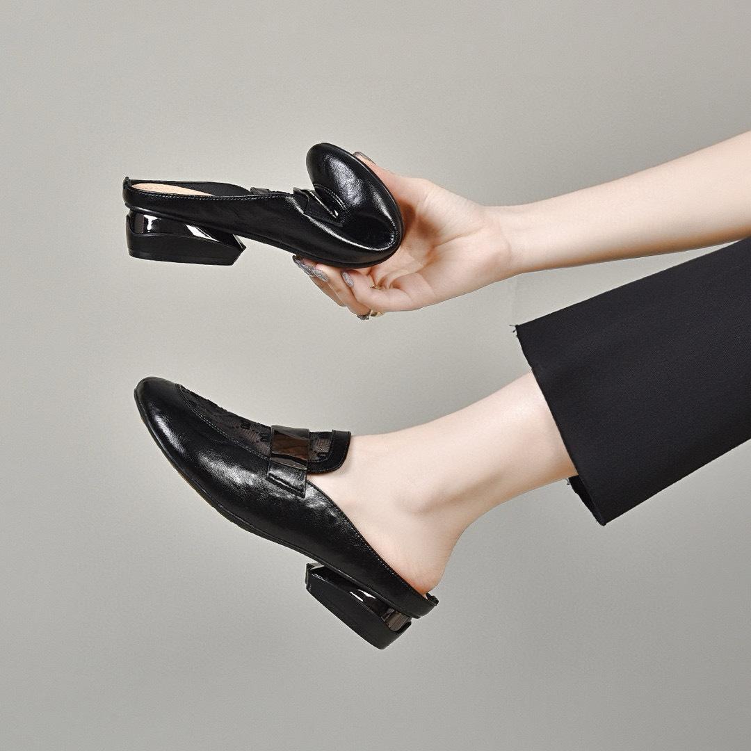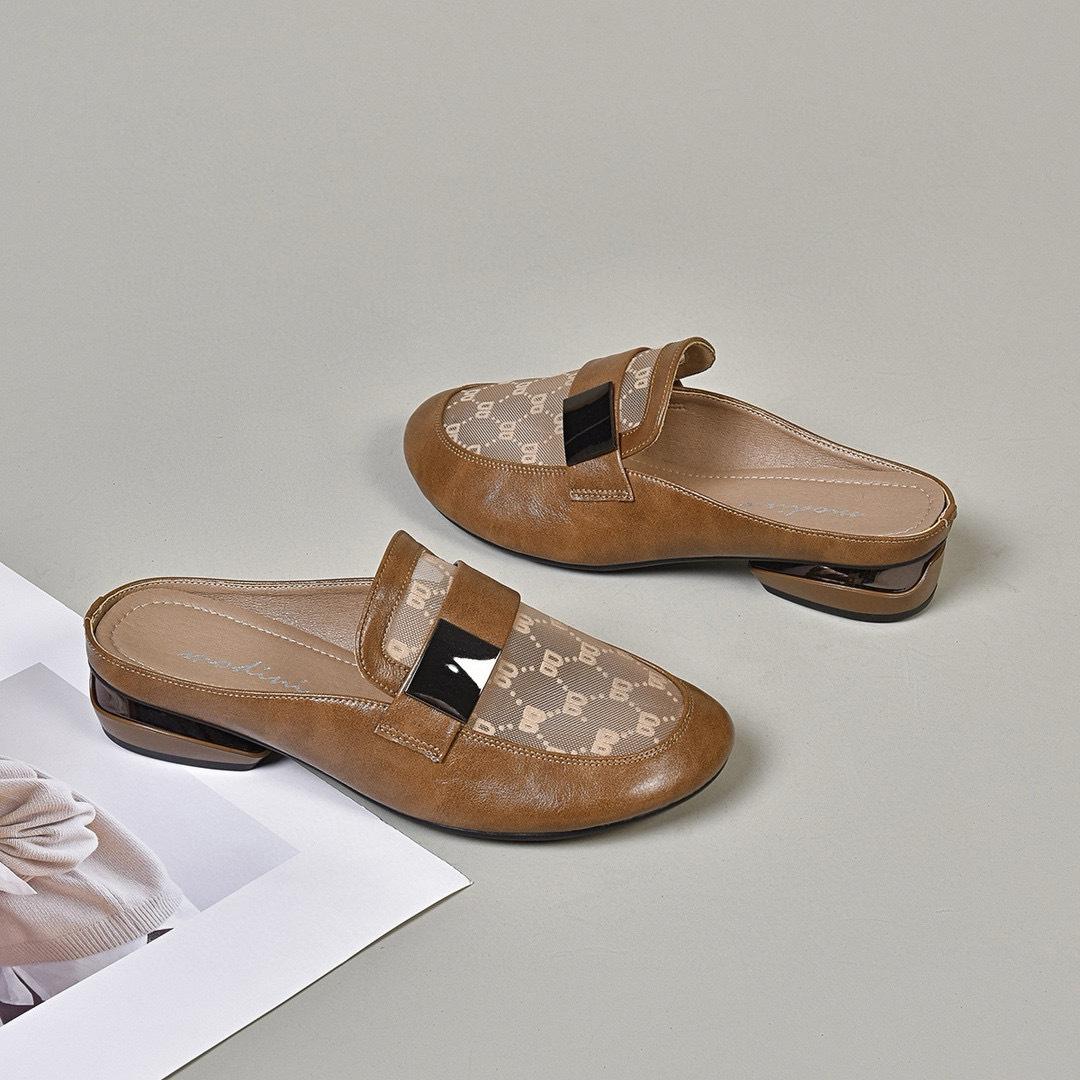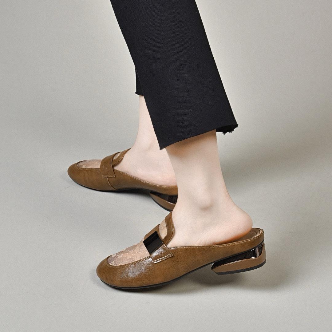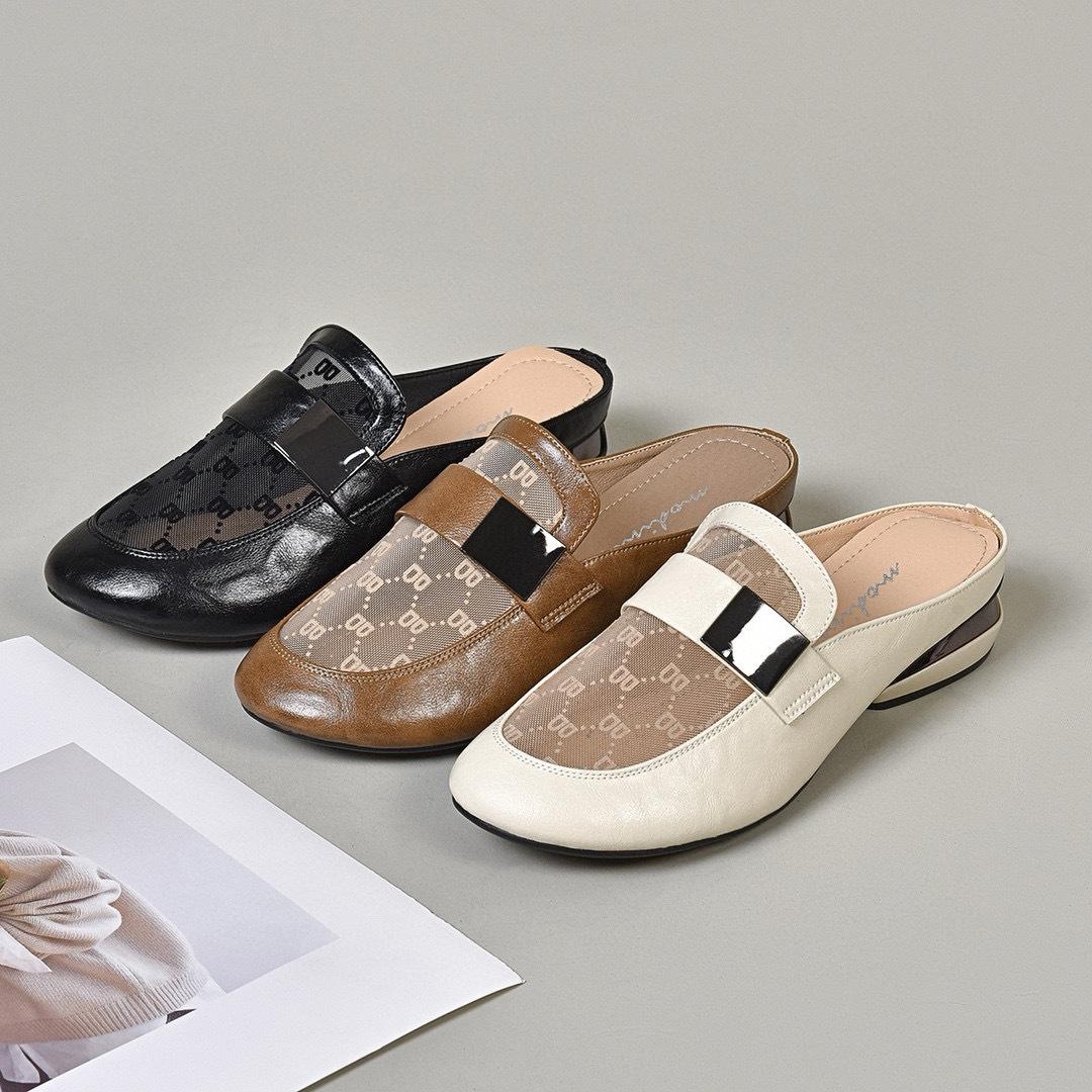 Nuevas pantuflas de malla de primavera y verano para llevar en la mano, de punta redonda, tacón bajo, medias pantuflas Material: piel de vaca Color: negro, caqui, blanquecino Altura del tacón: 3cm, 5cm Talla: 34-41