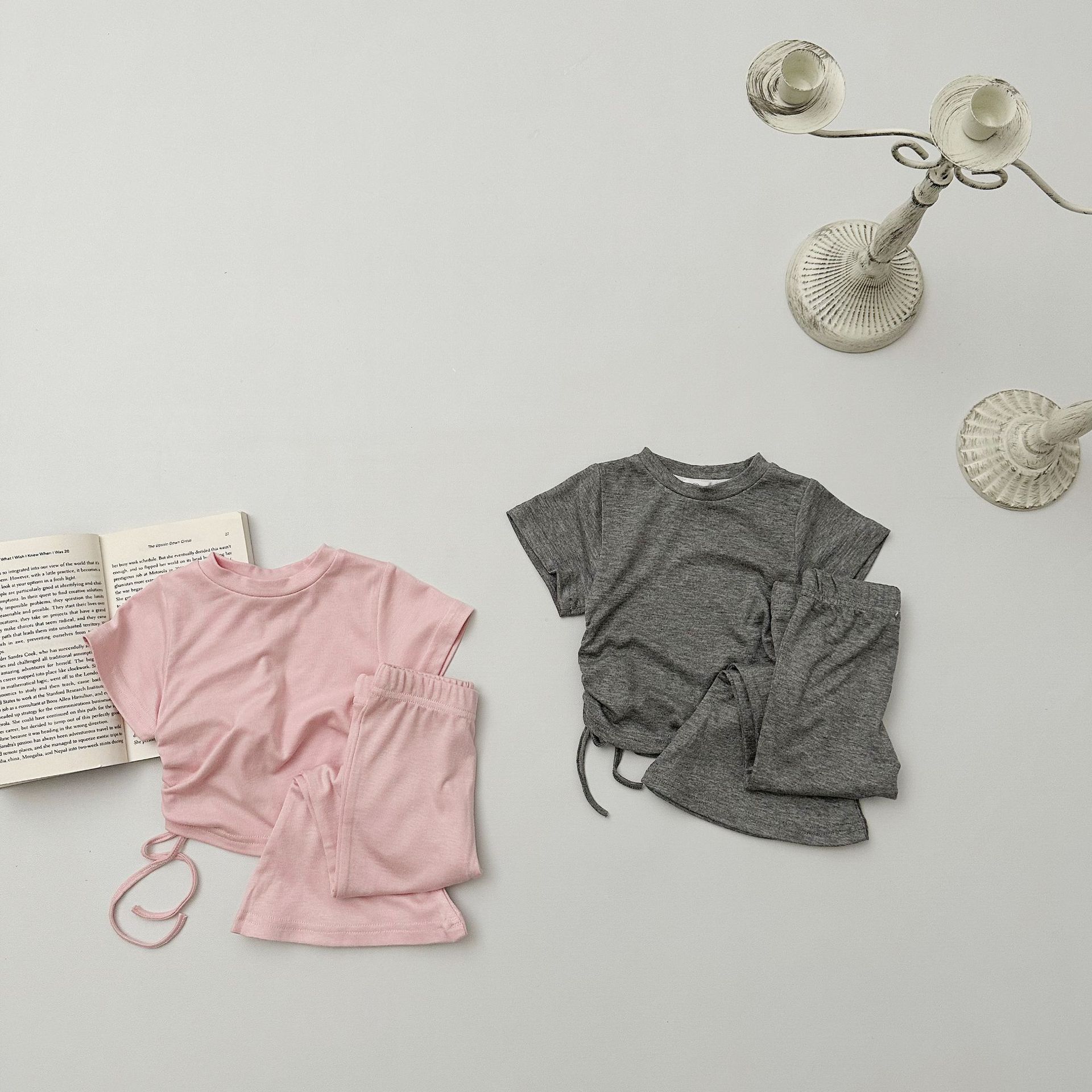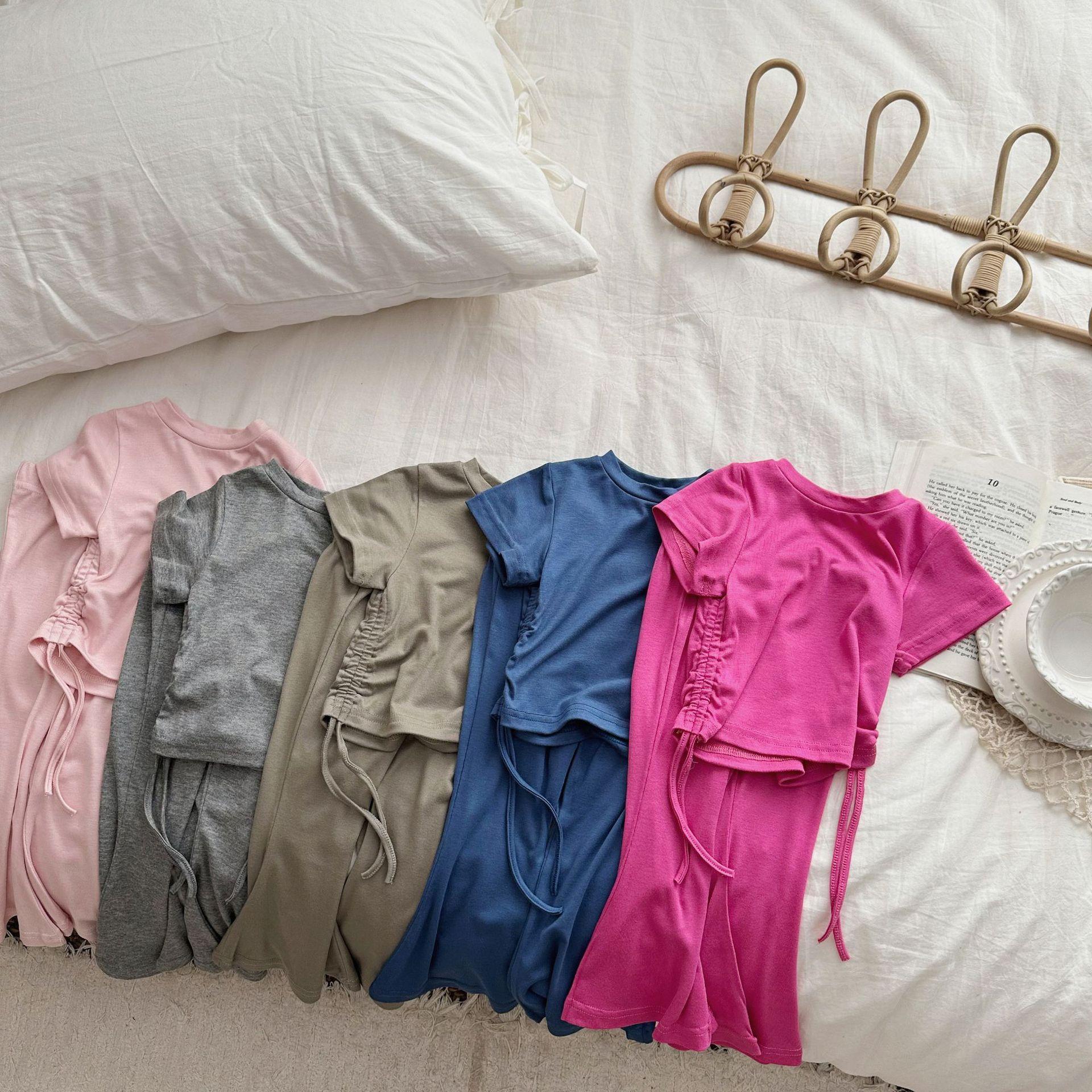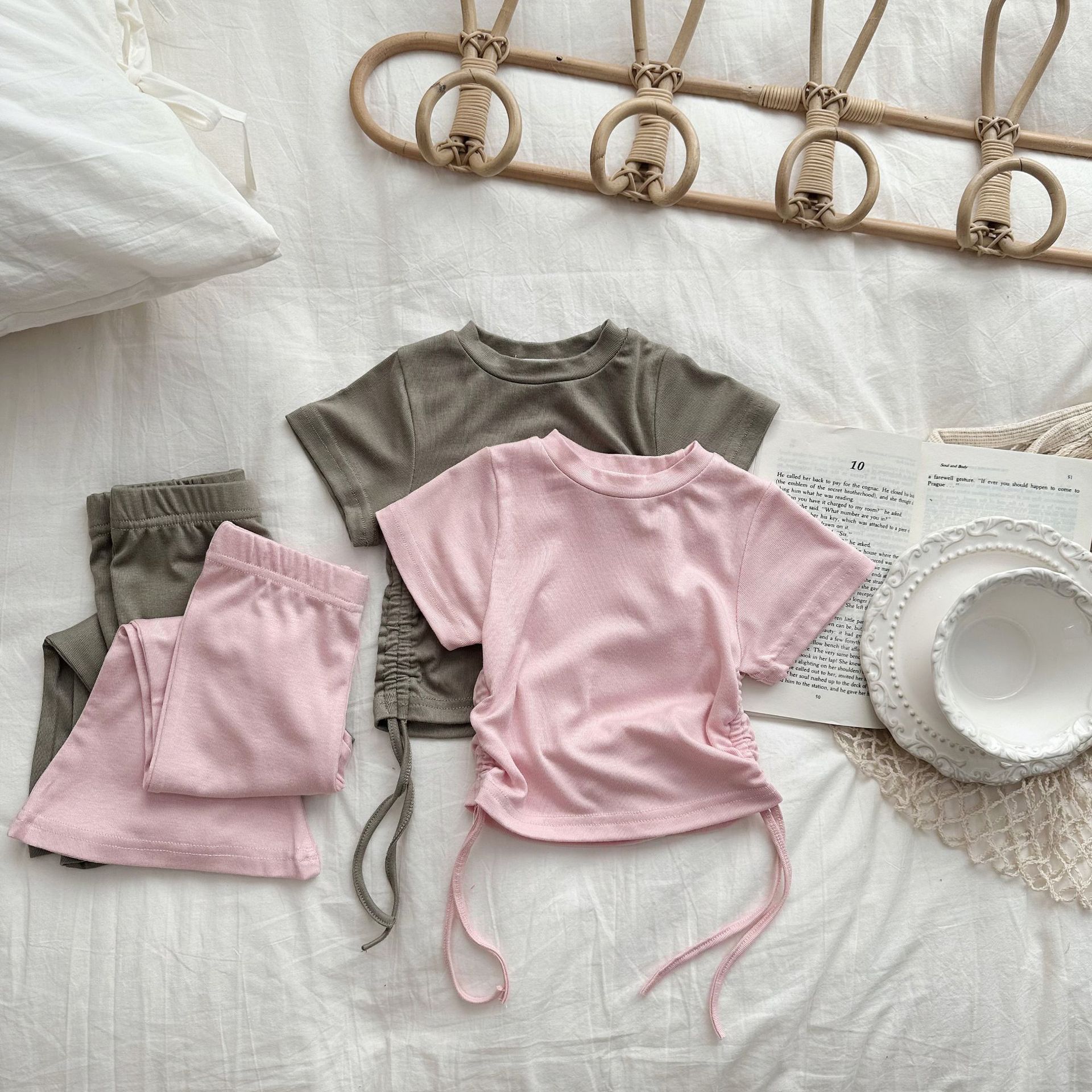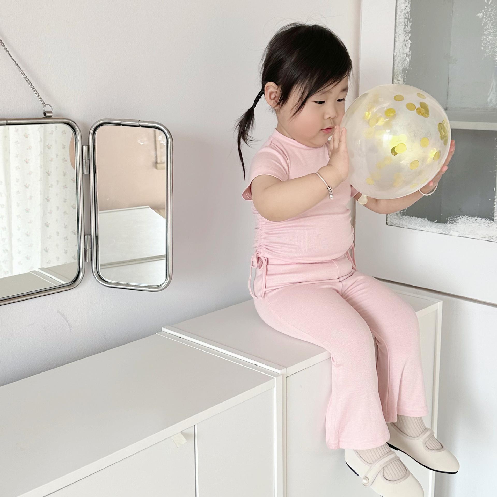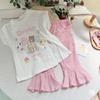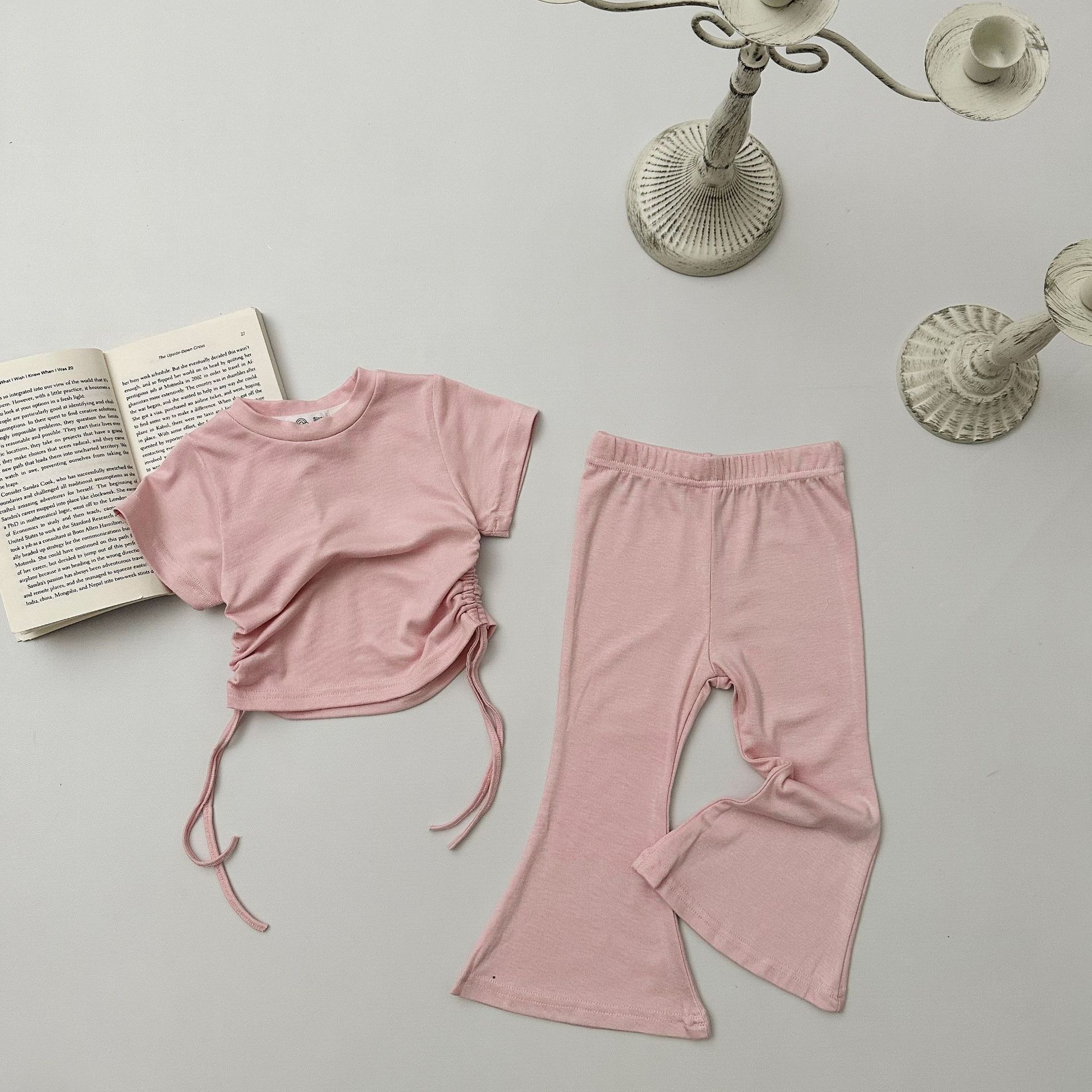 Traje de verano para niña estilo coreano camiseta de manga corta verano estilo occidental top de cuello redondo con cordón bebé verano nuevo pantalón acampanado
