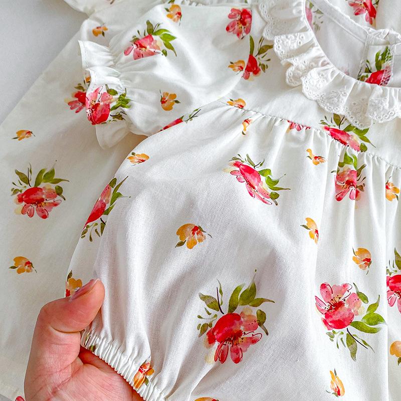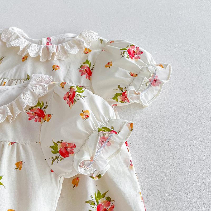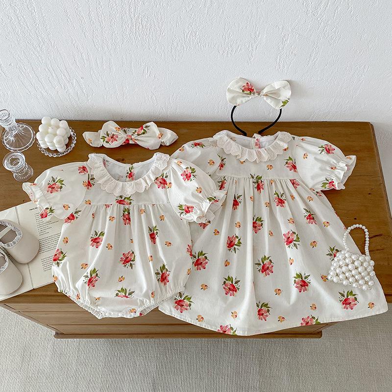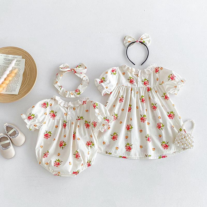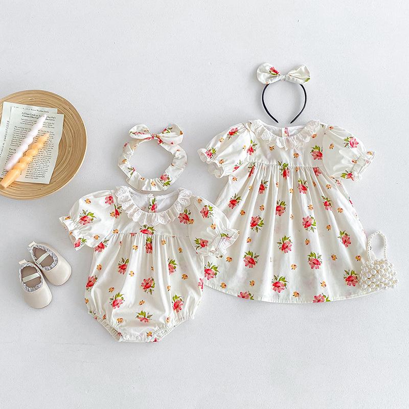 Ropa de Verano para Bebé 2025 para Niñas: Mameluco Dulce de Triángulo con Mangas Abullonadas y Traje de Hermana a Juego