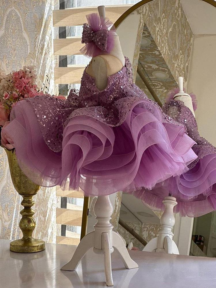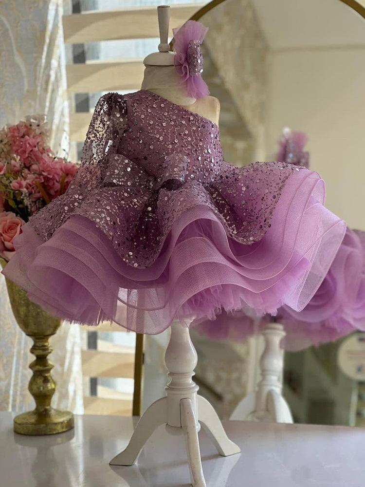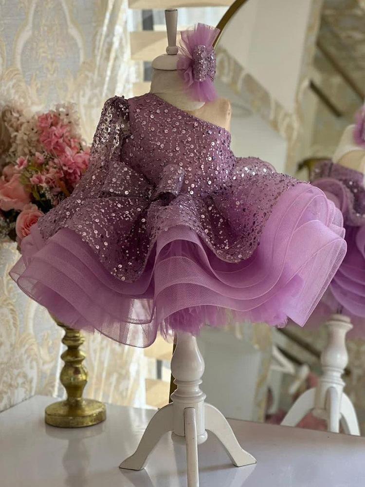 Vestido de niña de un año, vestido de princesa con lentejuelas de un solo hombro morado, vestido de gasa esponjosa para niña, disfraz de anfitriona de niña de las flores