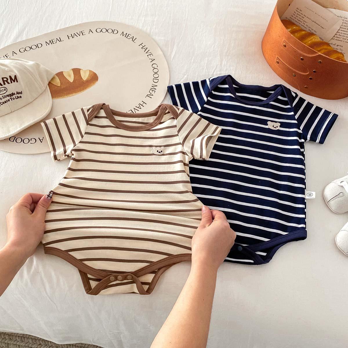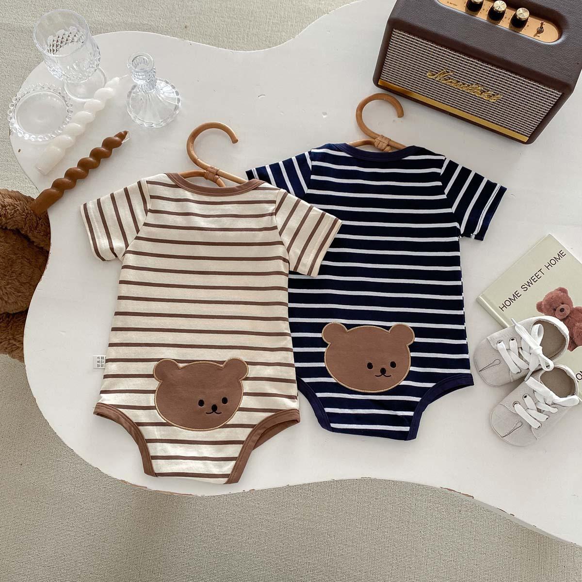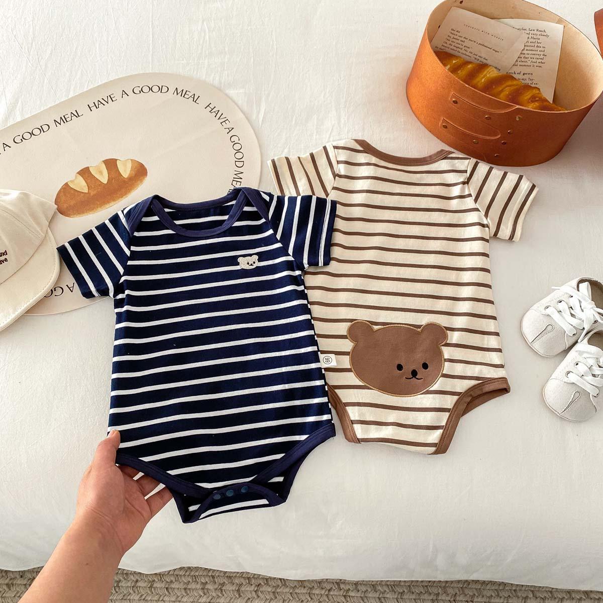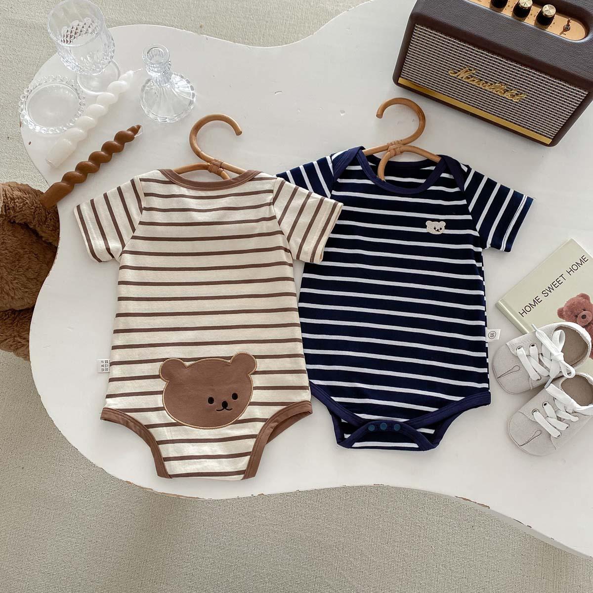 Ins Bebé Verano Nuevo Niños Manga Corta Rayas Oso de Dibujos Animados Mameluco de Una Pieza Estilo Coreano Suave Harem