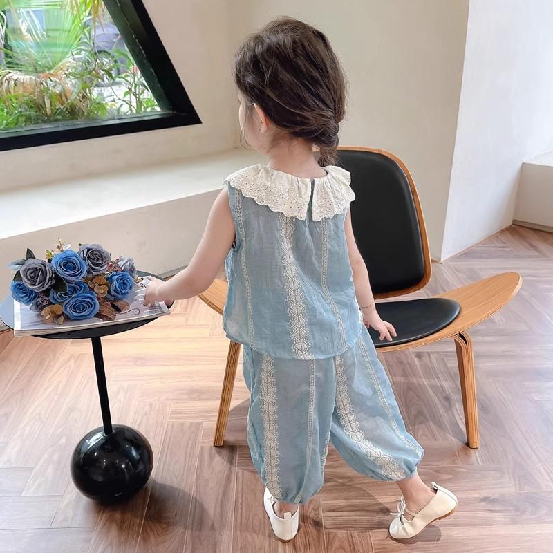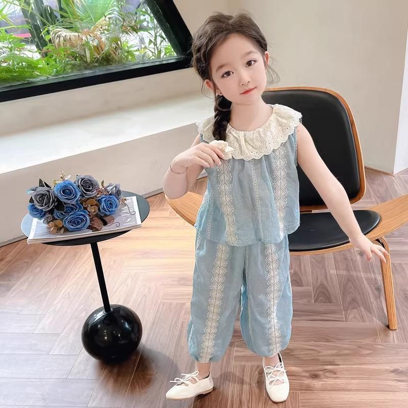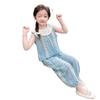 Traje Casual de Verano para Niñas 2024 Estilo Bosque Ropa de Verano para Niños Cuello de Muñeca Fresco Pequeño Sin Mangas Bloomers Conjunto Completo