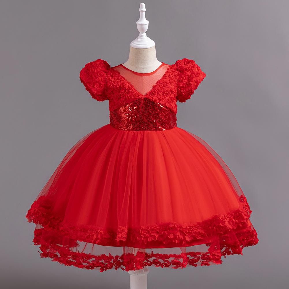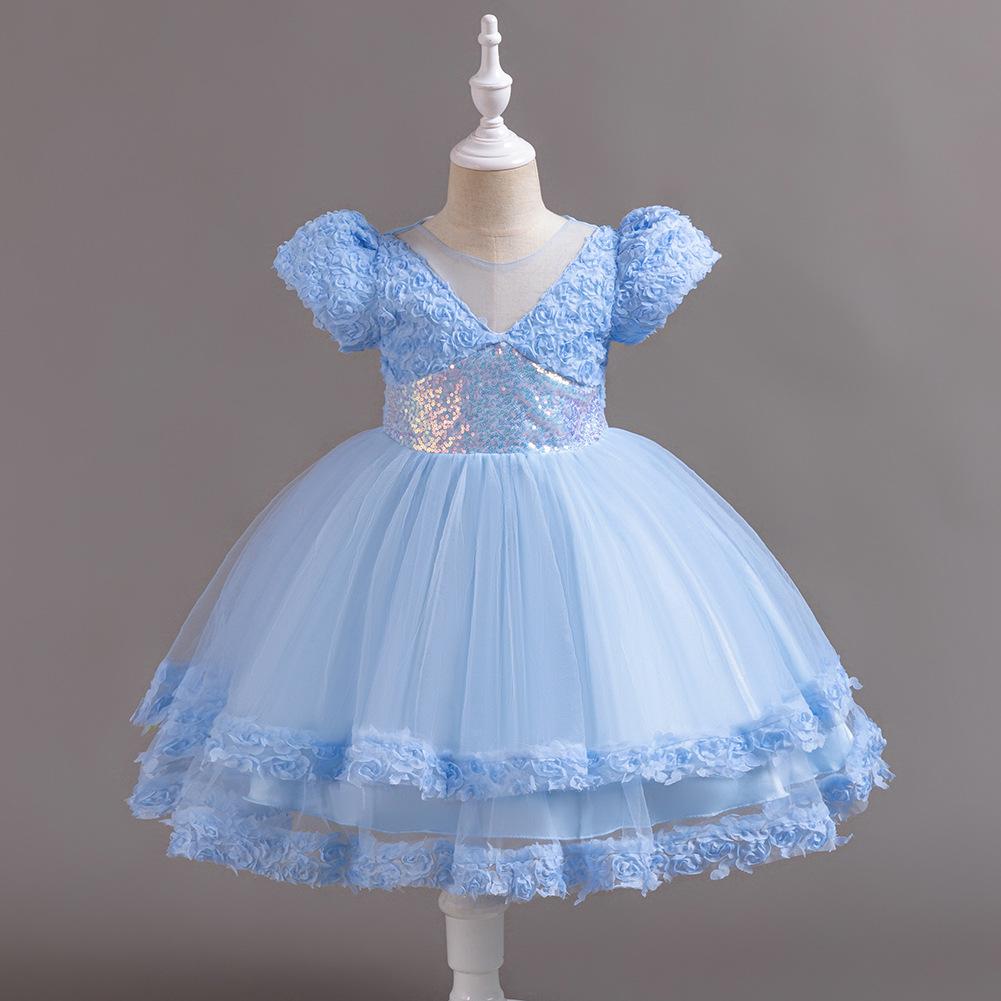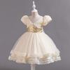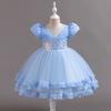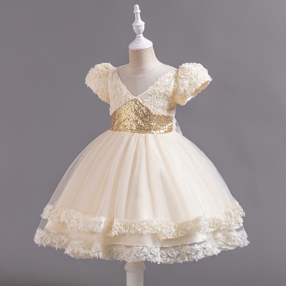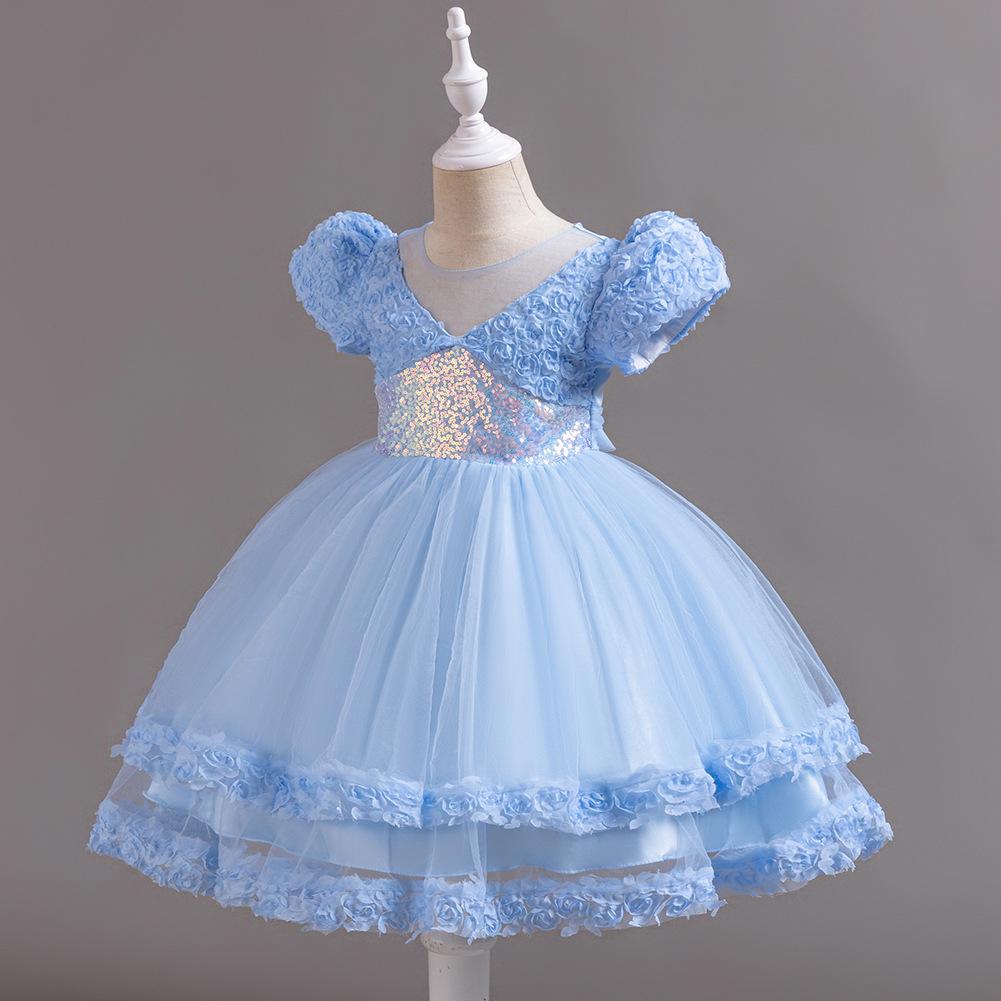 Vestido de princesa con mangas abullonadas y malla con lentejuelas para niños europeos y americanos, vestido de novia, disfraz de presentadora de pasarela para el Día del Niño