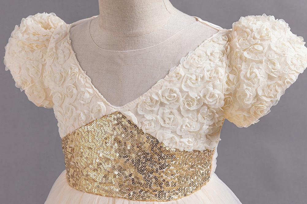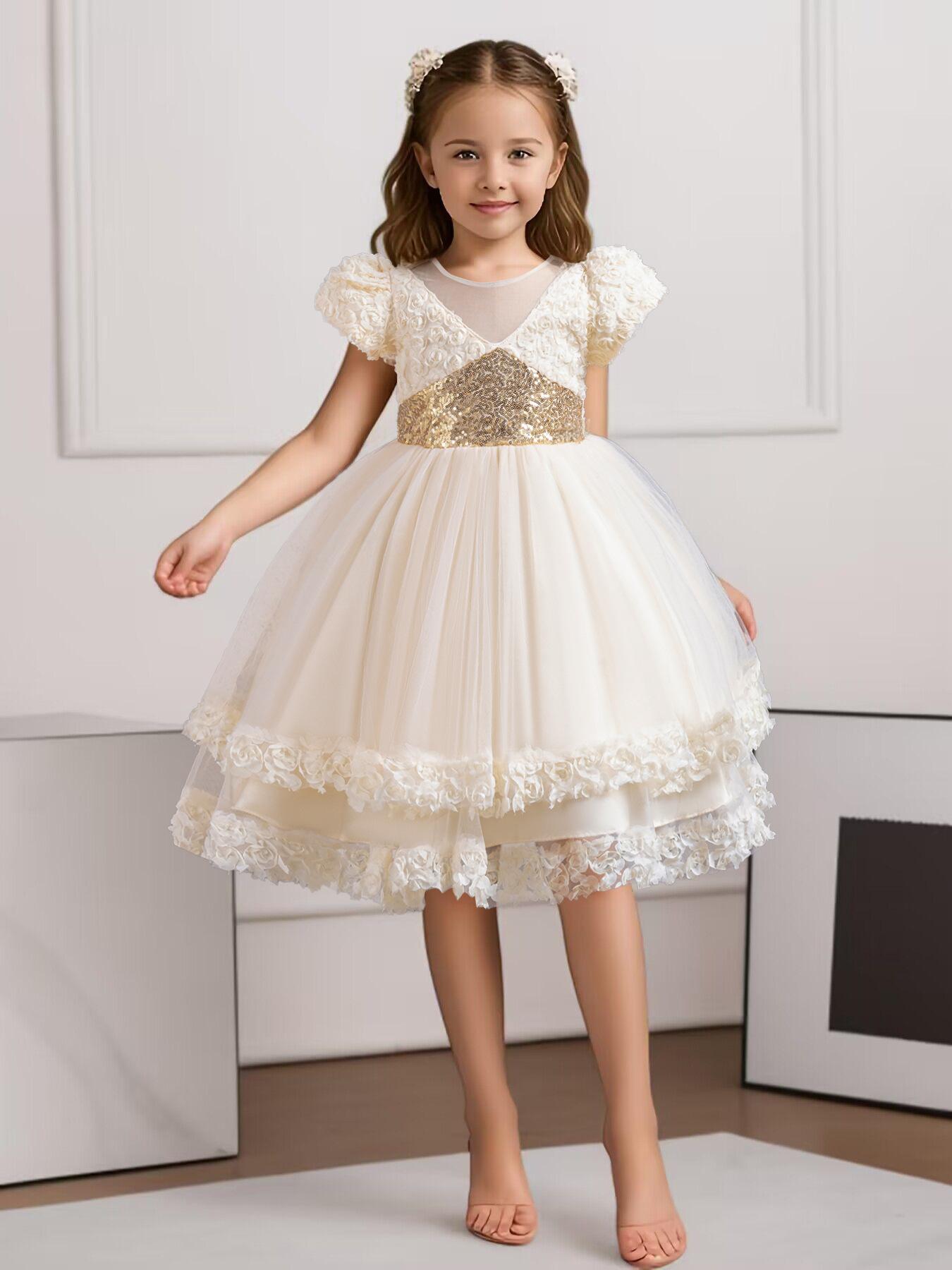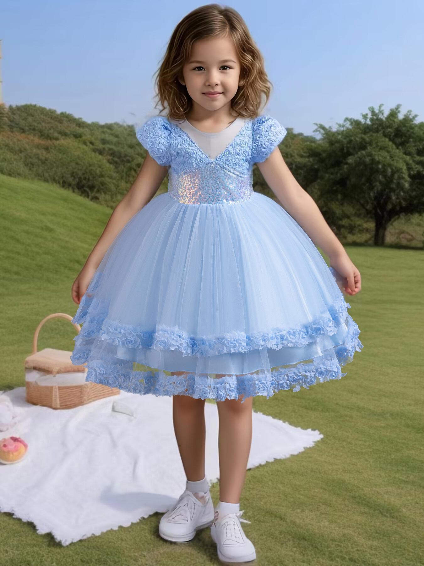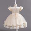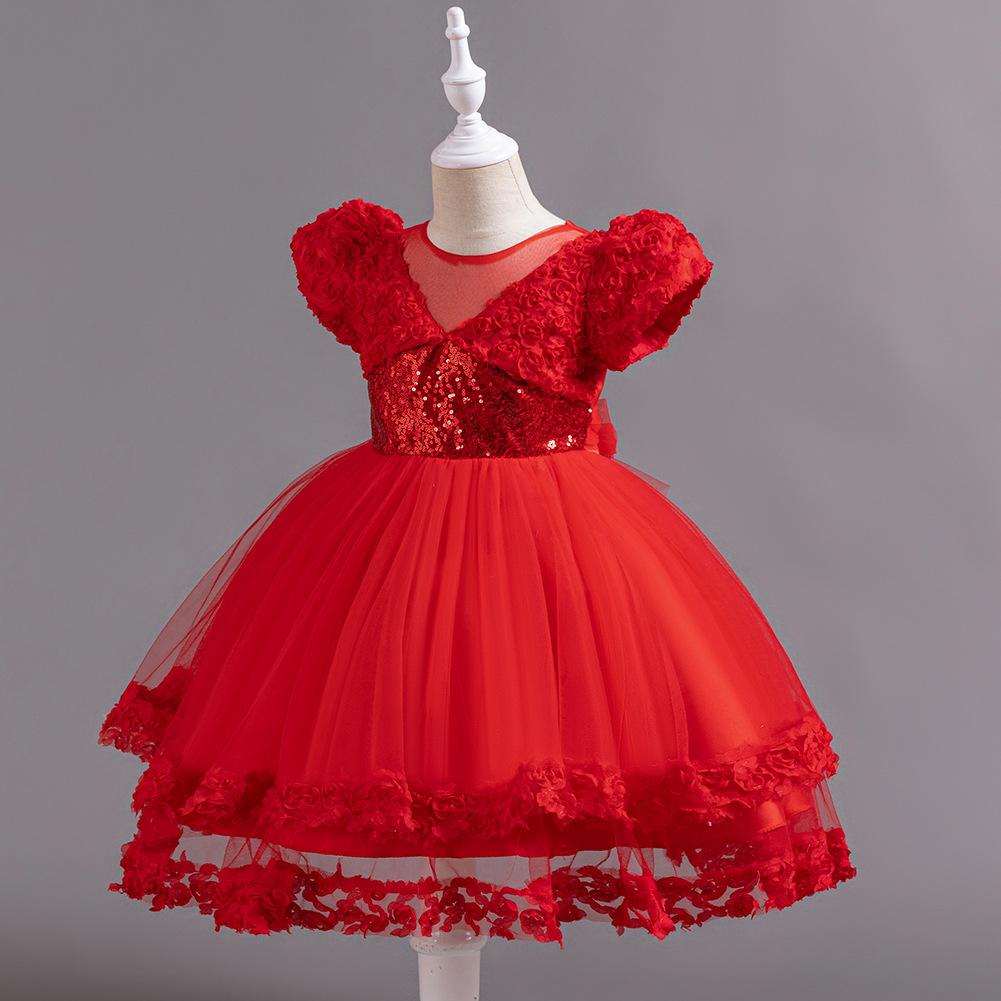 Vestido de princesa con mangas abullonadas y malla con lentejuelas para niños europeos y americanos, vestido de novia, disfraz de presentadora de pasarela para el Día del Niño
