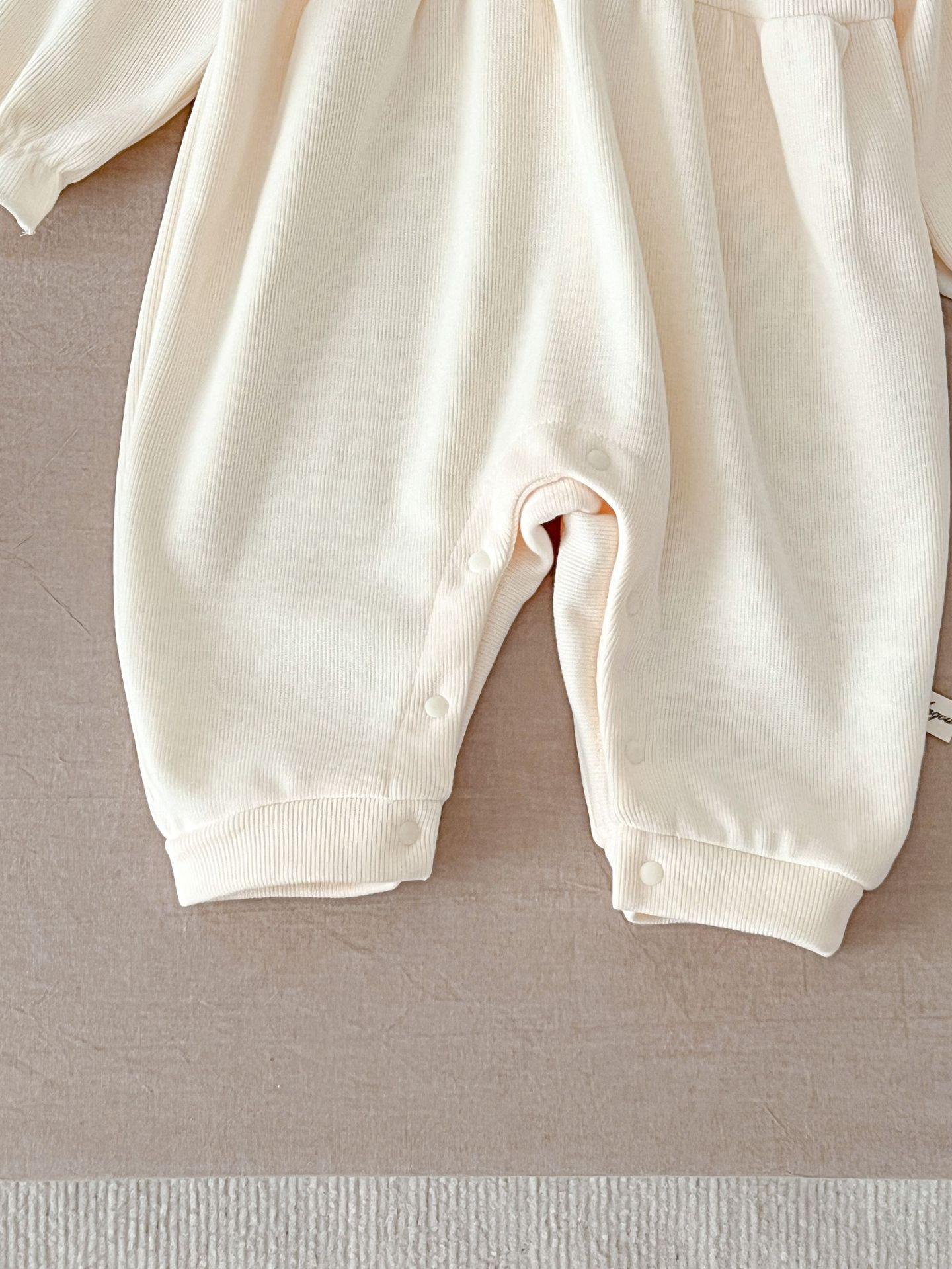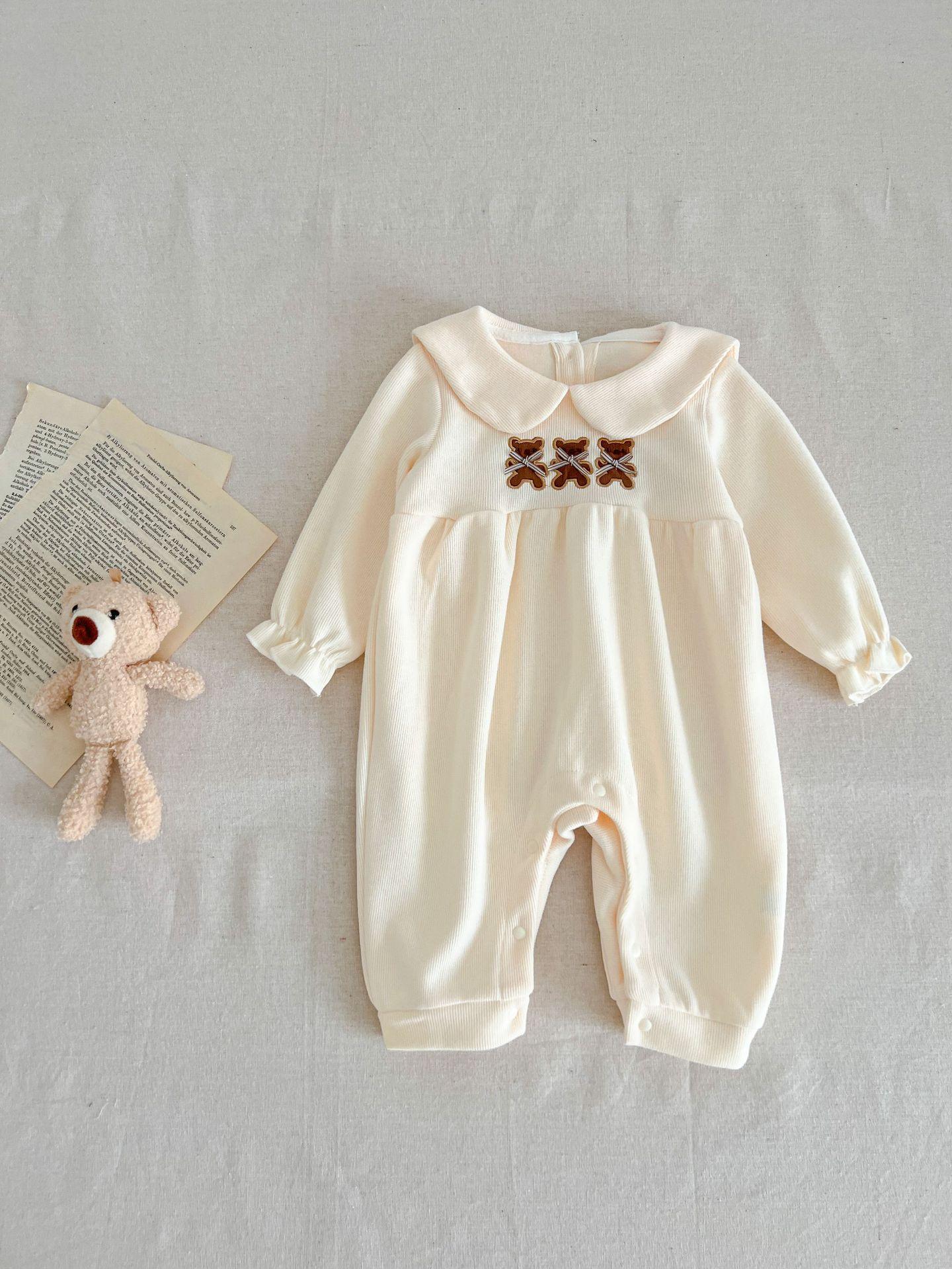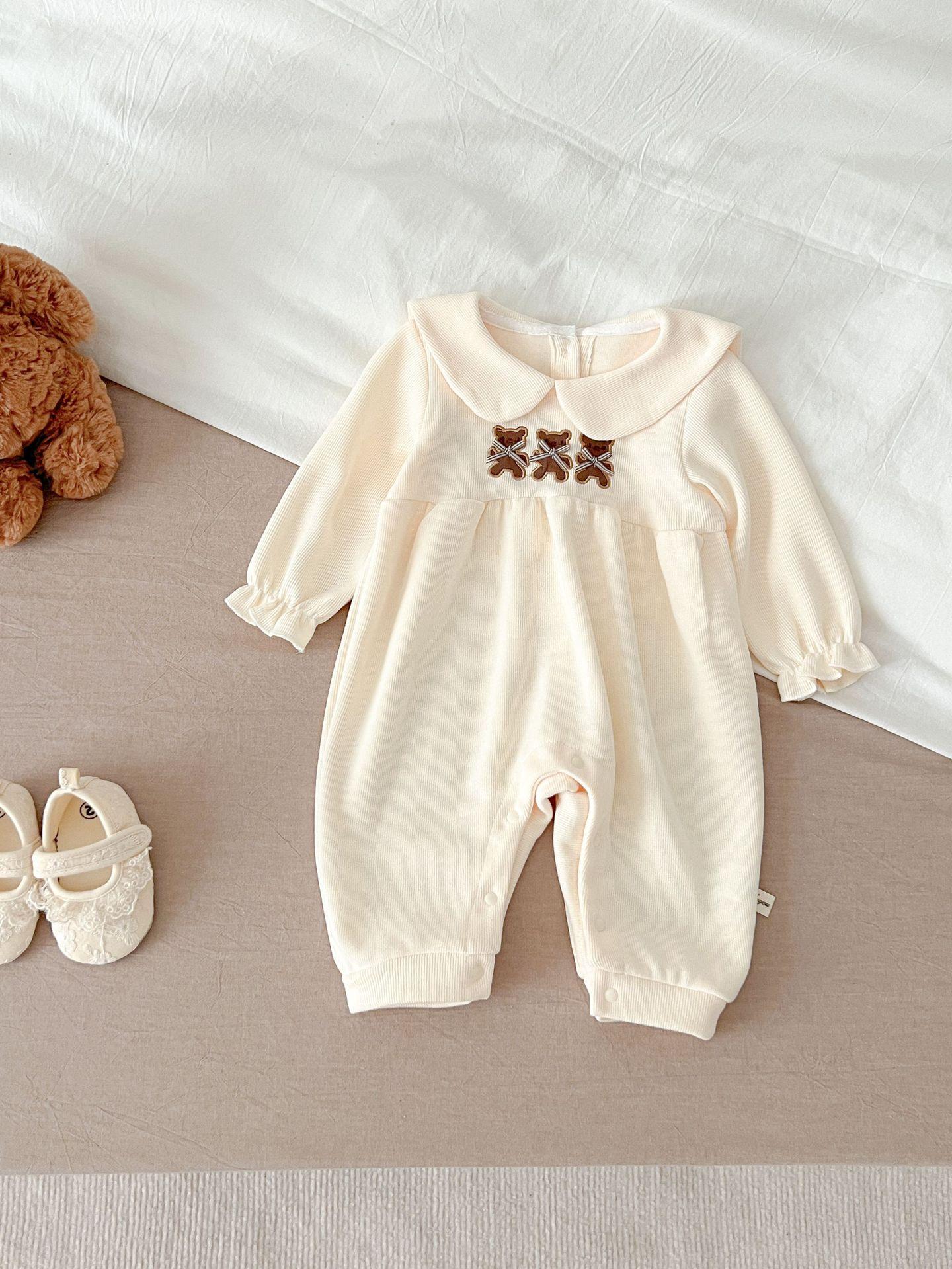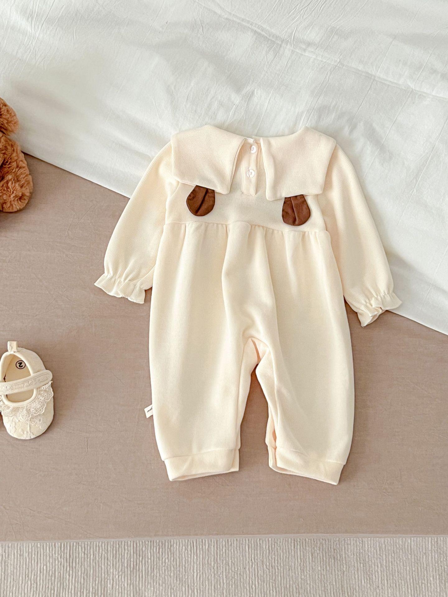 Mono de bebé de otoño 2023 con cuello de muñeca de oso, mono de color sólido súper lindo para bebé