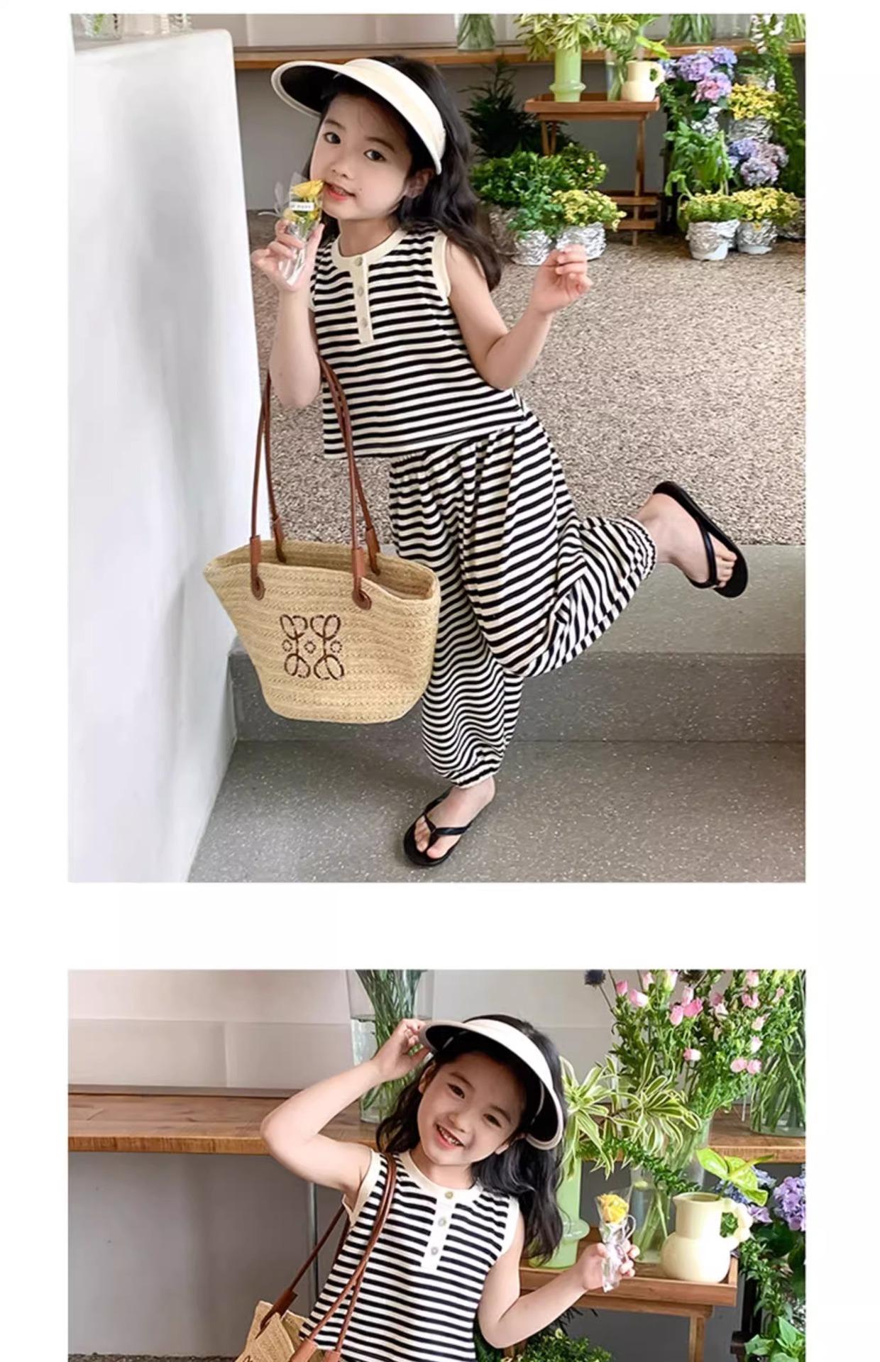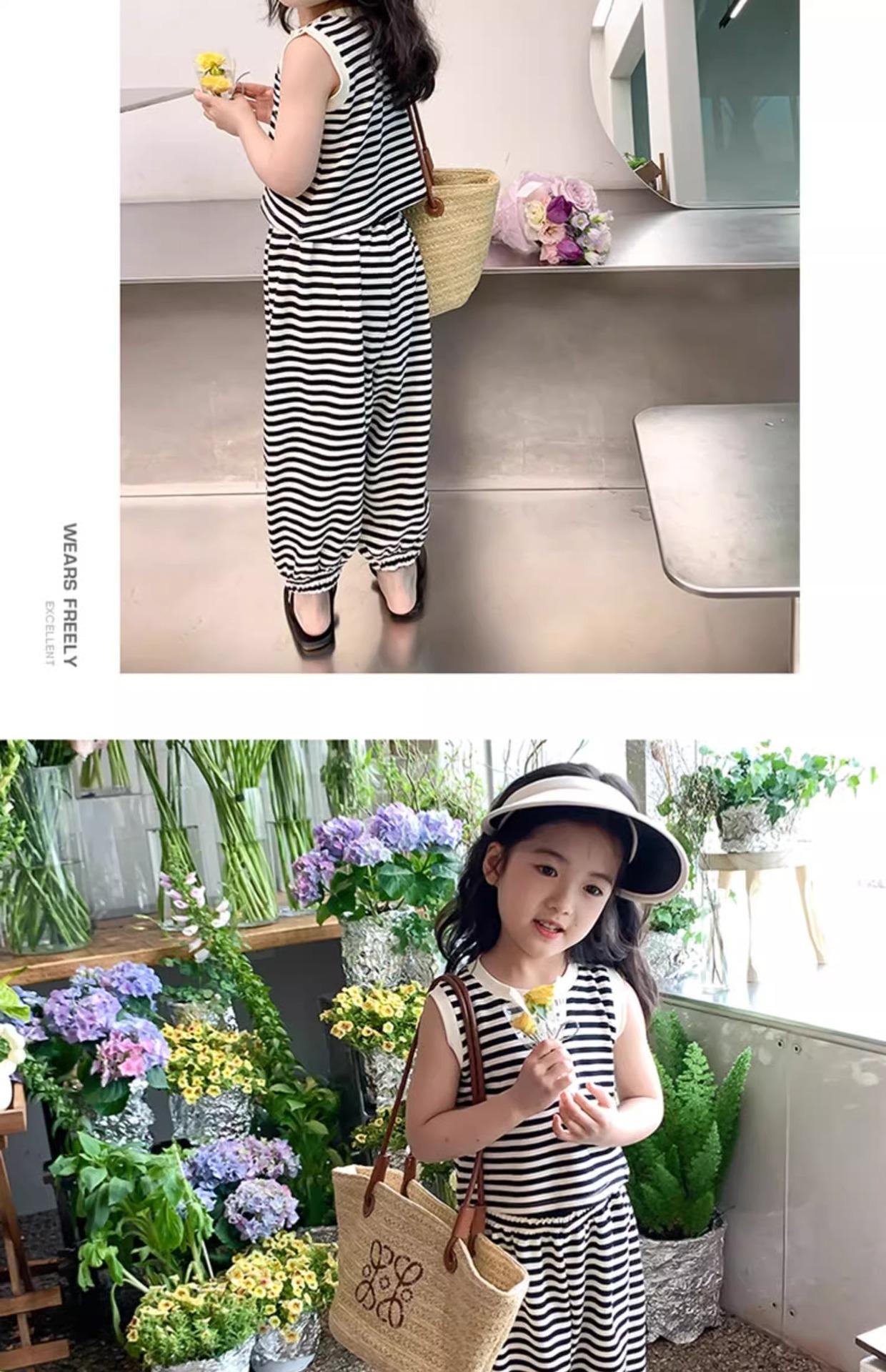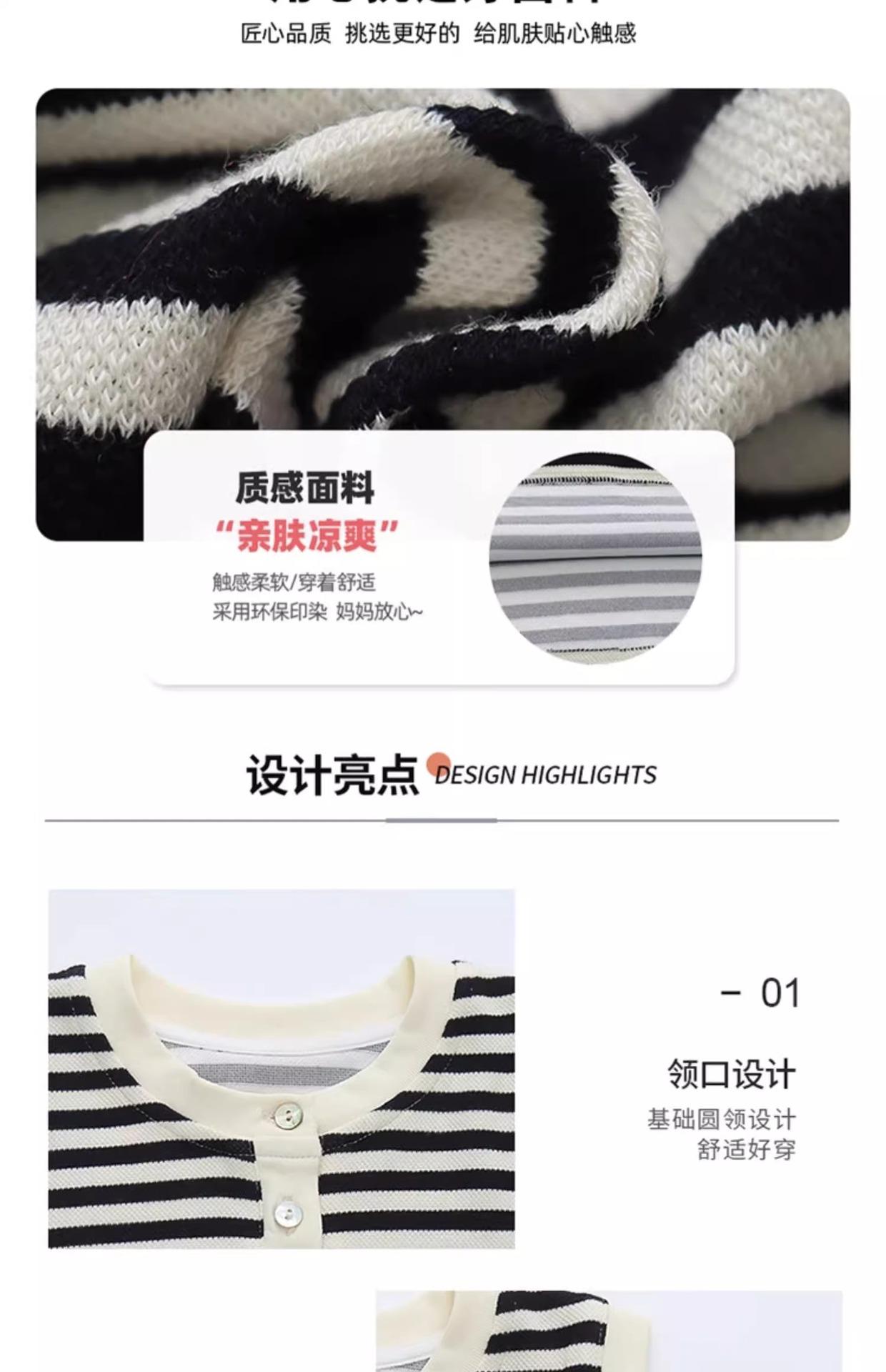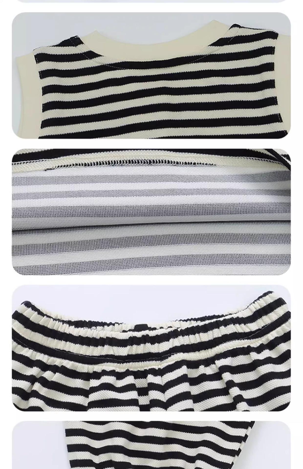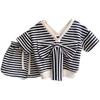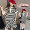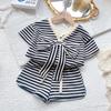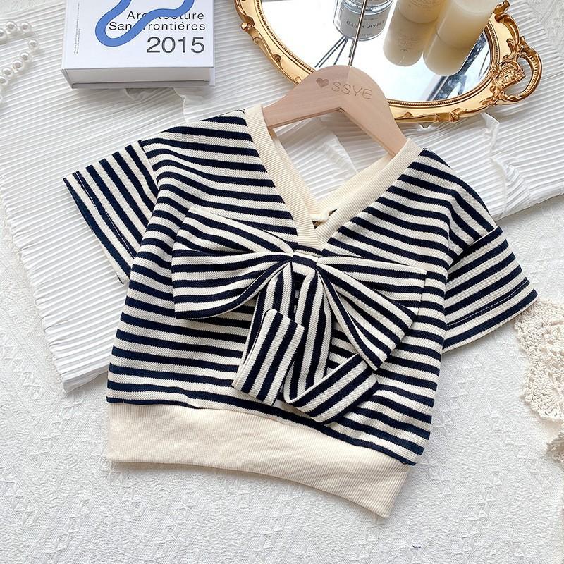 Ropa para niños y mujeres, verano 2025, nuevo traje de rayas de moda para niñas, camiseta de manga corta con lazo y pantalones cortos.