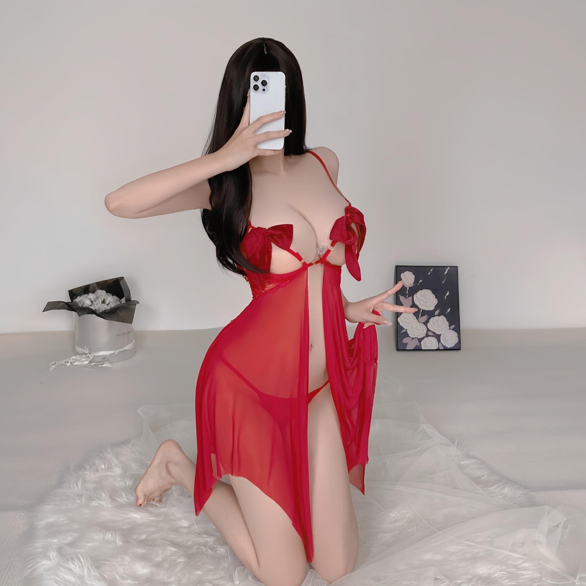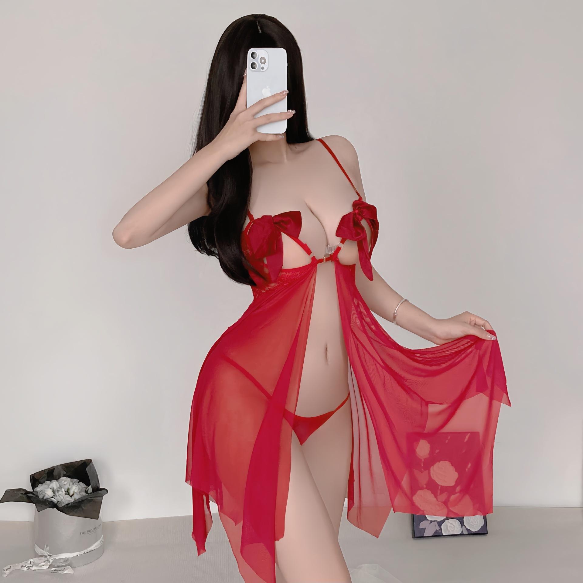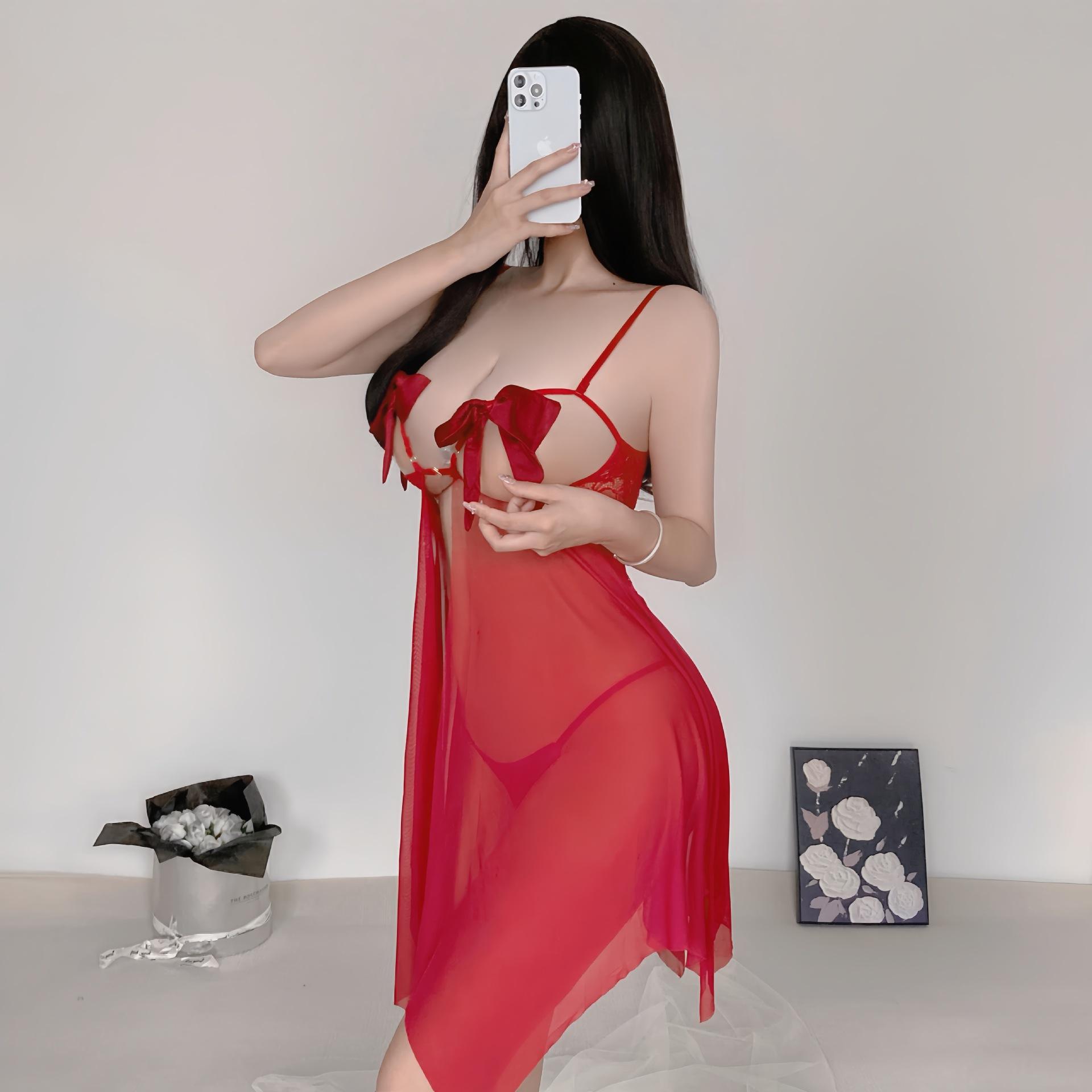 Lencería sexy con lazo, pijama sexy para mujer, camisón con tirantes de encaje, abertura libre, pecho pequeño, traje de gran pasión