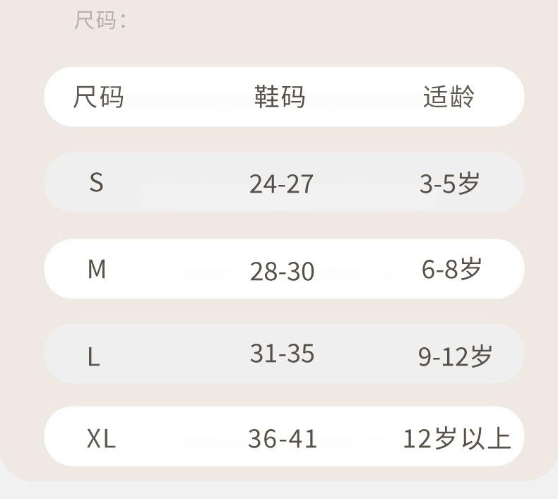 XS size 1-3 years old, S size 3-5 years old, M size 6-8 years old, I Code 9-12 years old, XL code over 12 years old