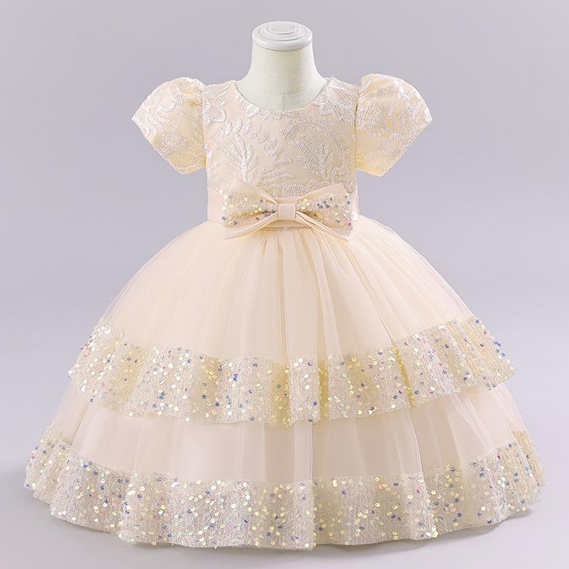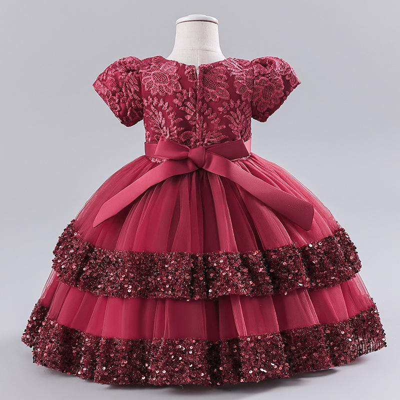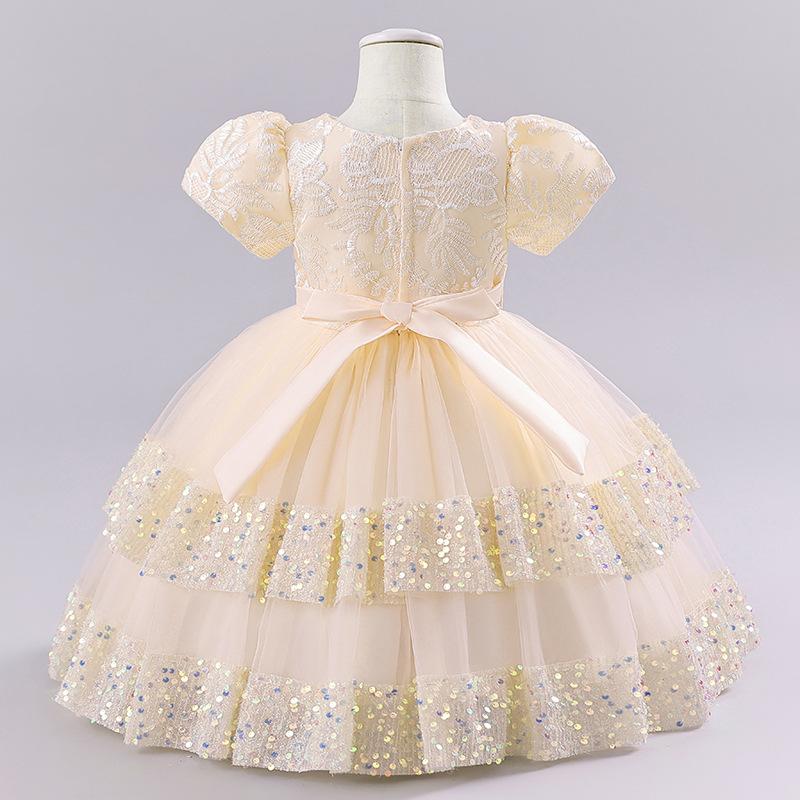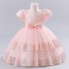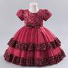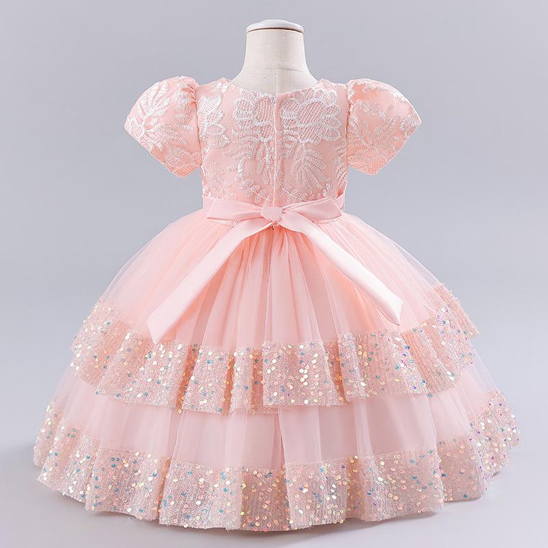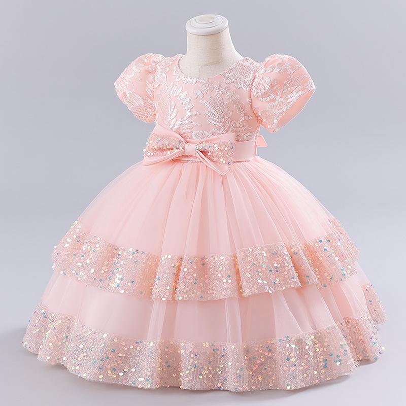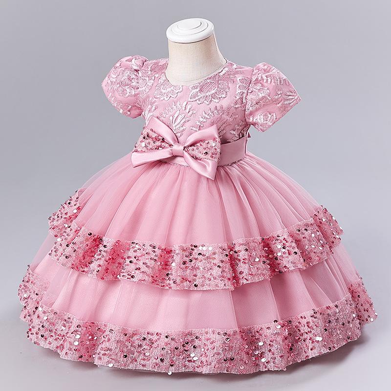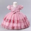 Vestido para niñas, vestido bordado con lentejuelas y lazo, manga corta, falda de princesa abullonada, venta al por mayor con punto transfronterizo