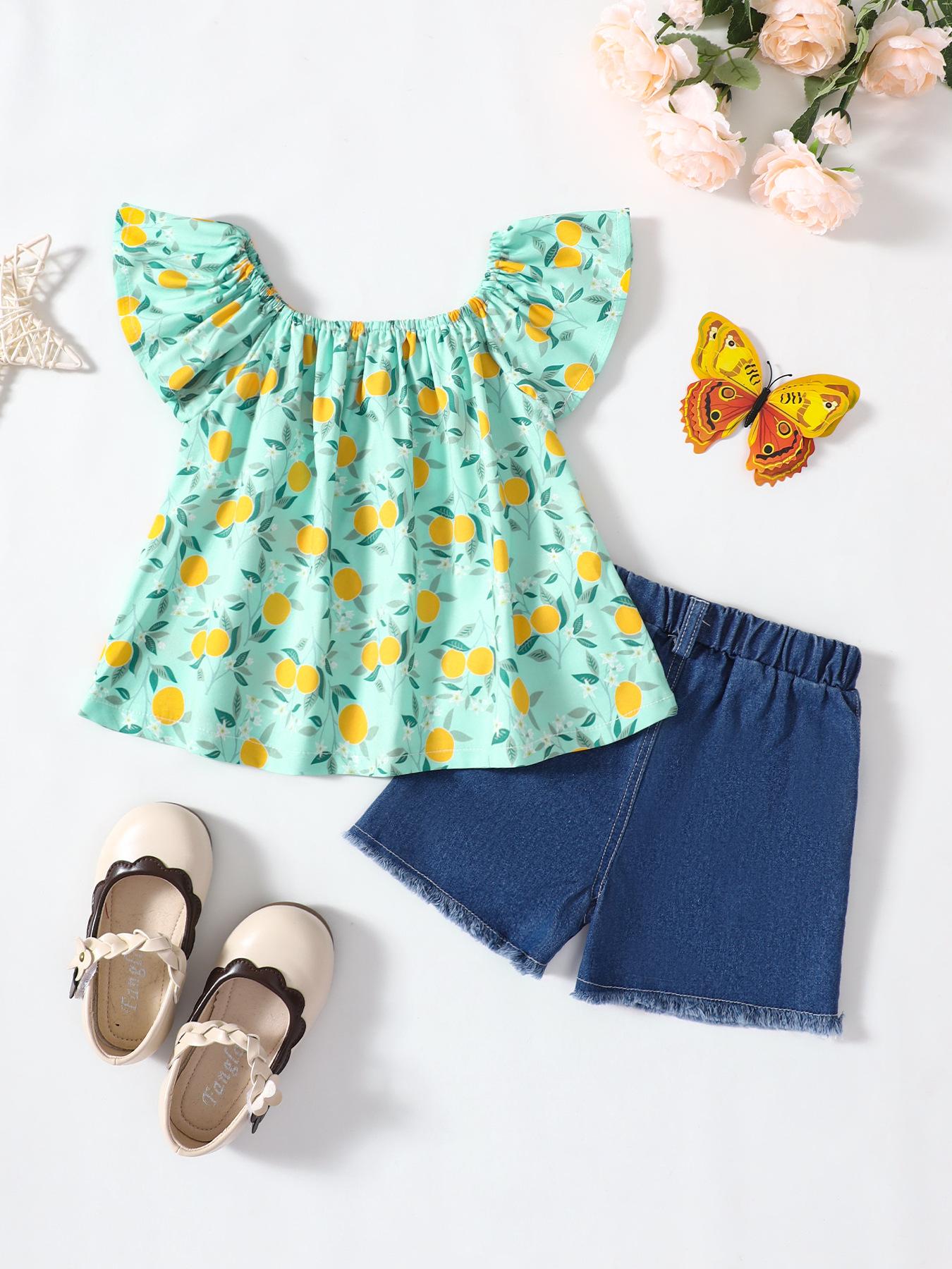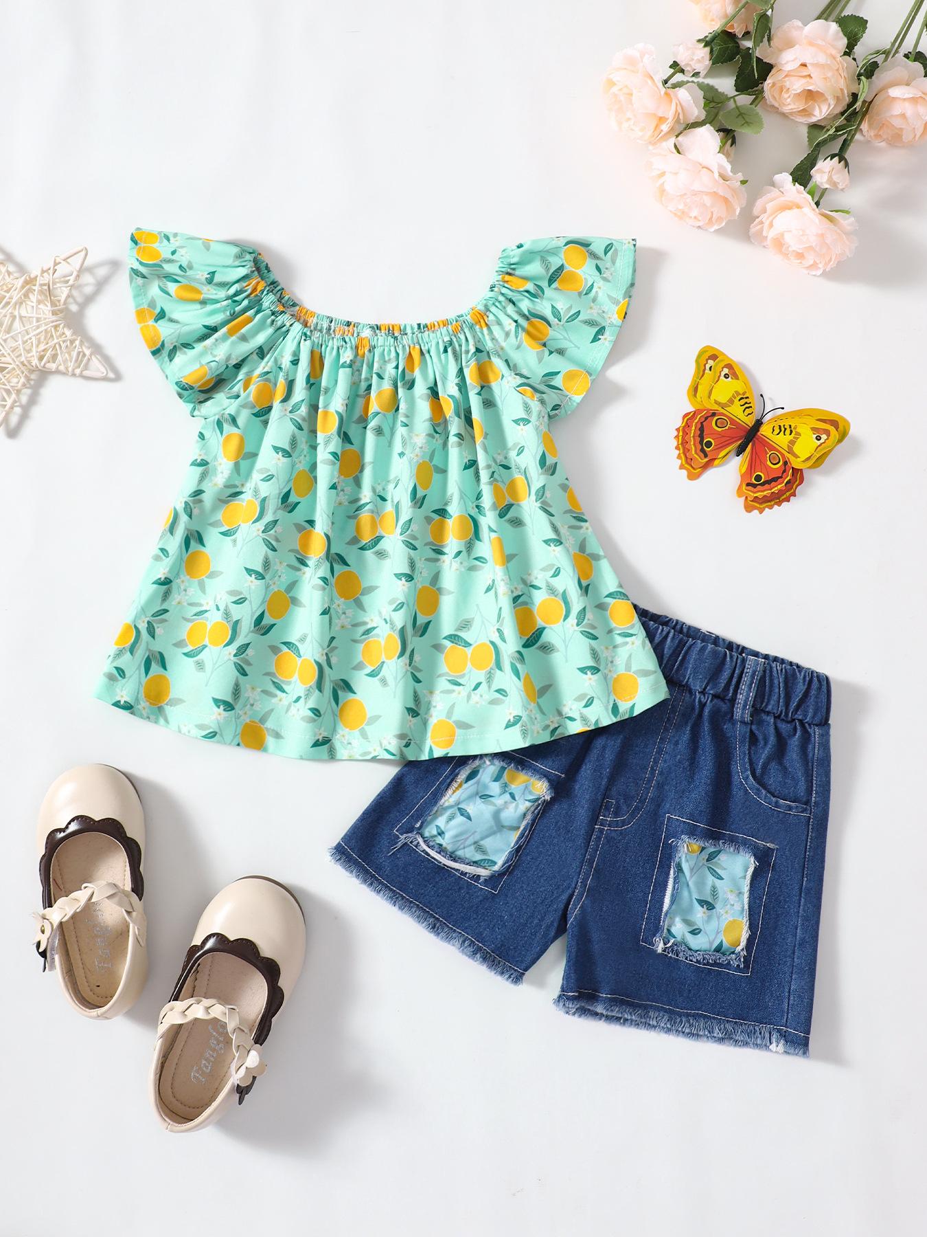 Comercio exterior transfronterizo nuevas niñas verano fruta agujero jeans dos piezas ropa infantil comercio exterior una generación de cabello