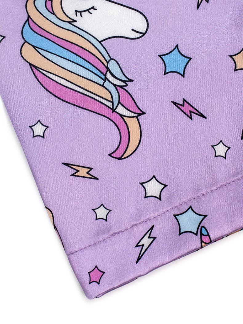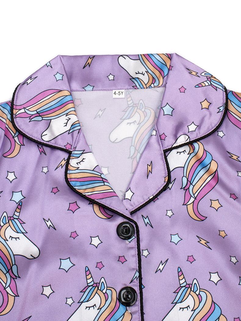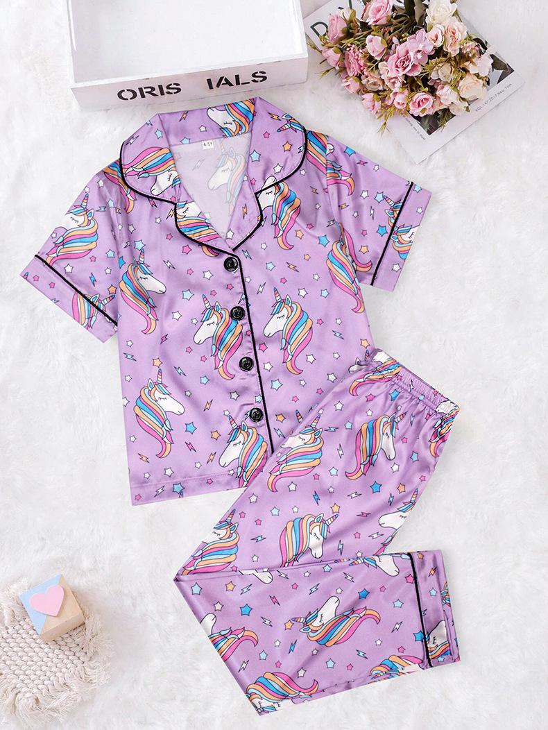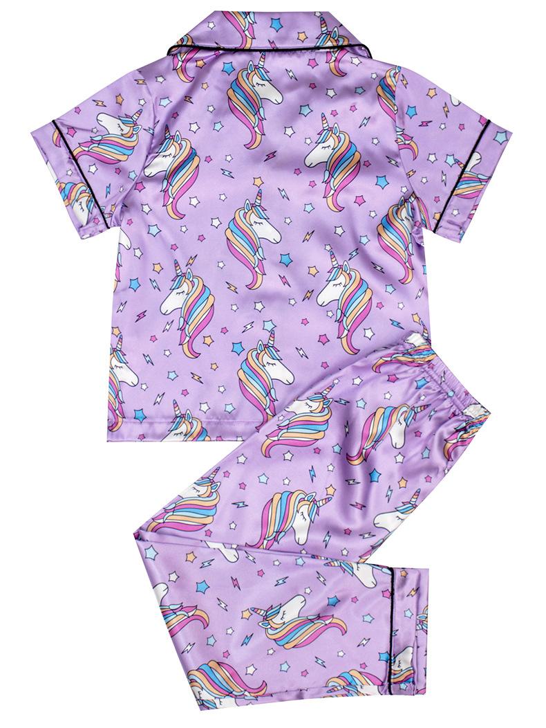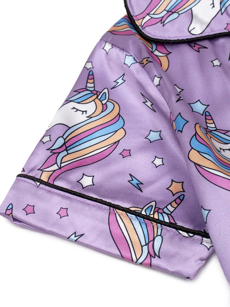 Pijamas de bebé de dibujos animados para niños, de verano, de manga corta, con solapa nueva, bonitos pijamas de niña para el hogar con estampado de unicornio y satén.
