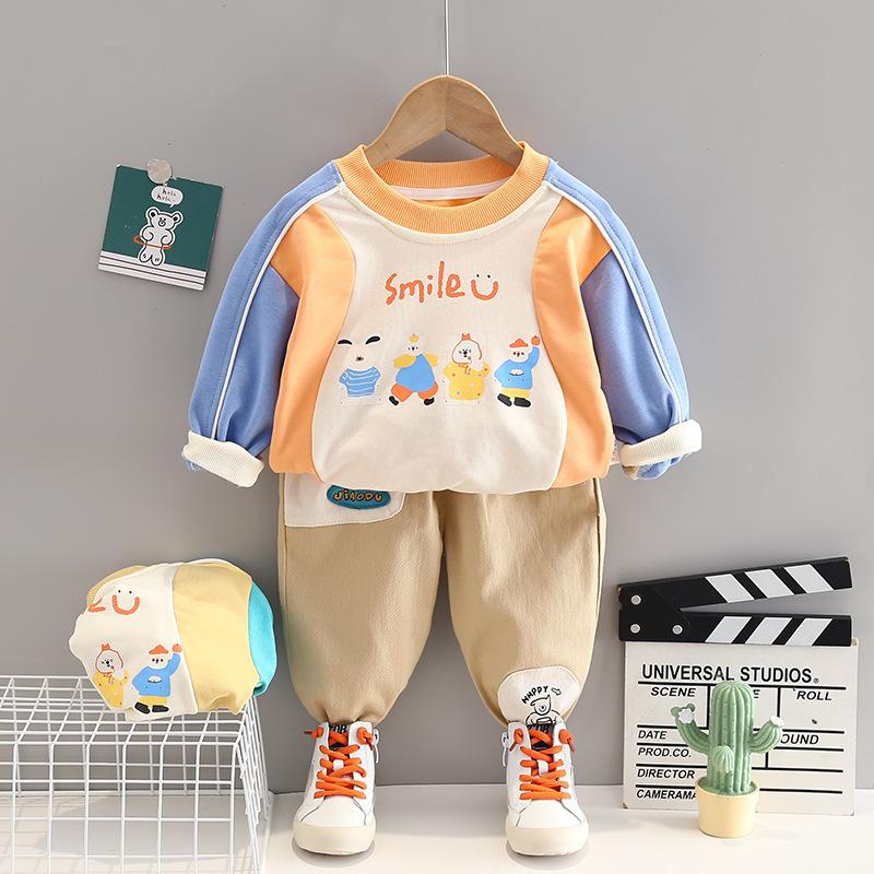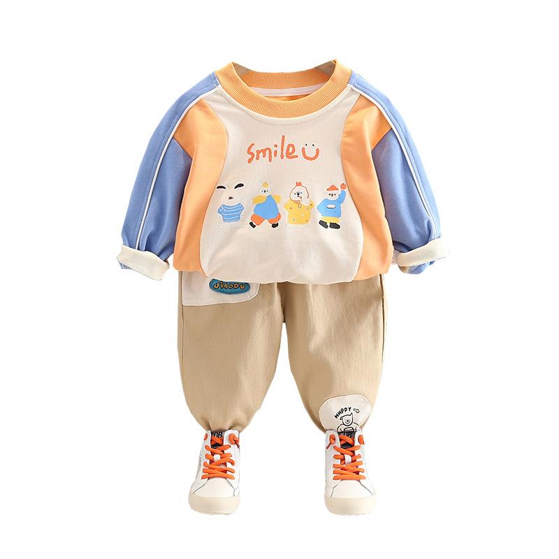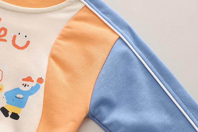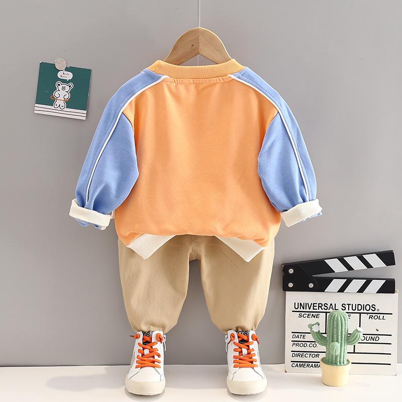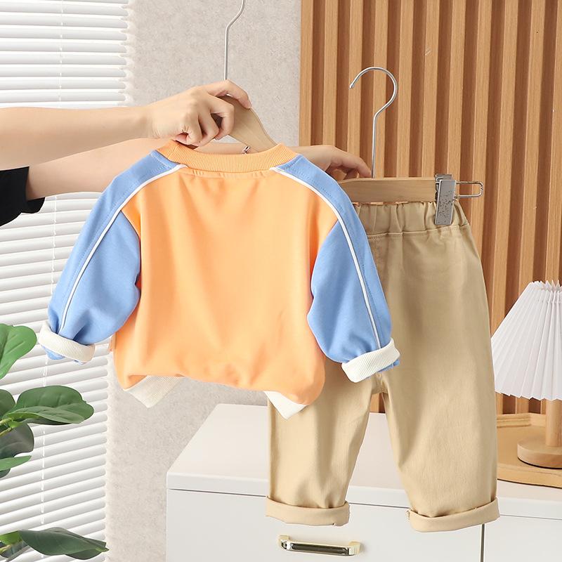 Ropa de primavera y otoño para bebé 2023 nuevo conjunto de dos piezas para niño con suéter de cuello redondo a bloques de color en contraste, traje casual para niños