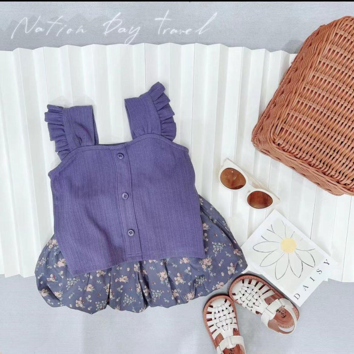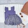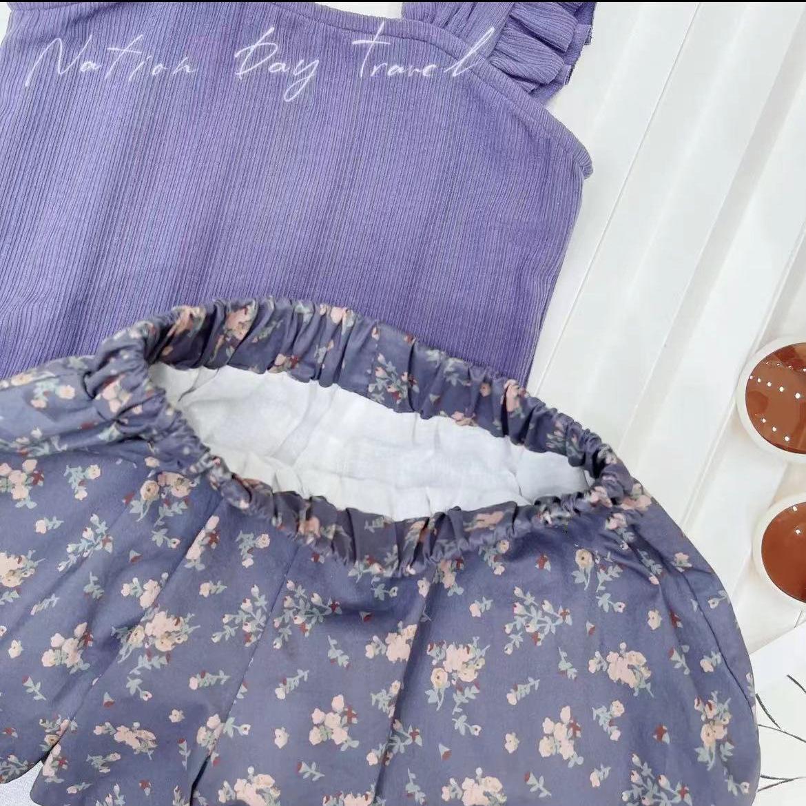Conjunto de Chaleco para Niñas 2025 Nuevo Estilo Top de Manga Volante Short con Tirantes Pantalones Bombachos Conjunto de Dos Piezas Floral Estilo K