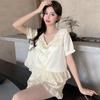 Pantalones cortos de manga corta de satén de seda helada para mujer de Han Yatong, conjunto de ropa de hogar estampada de primavera y verano, pijamas de otoño para hombre, nuevo