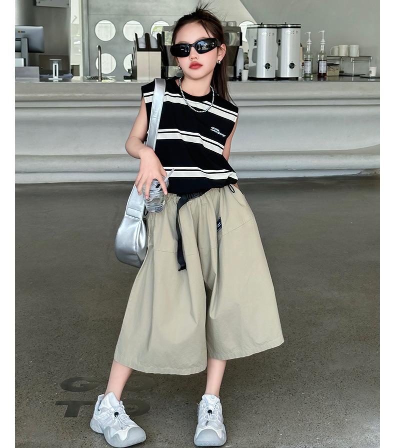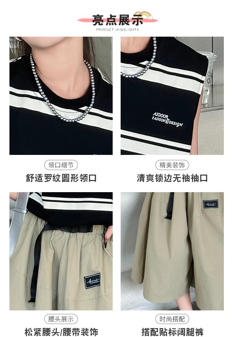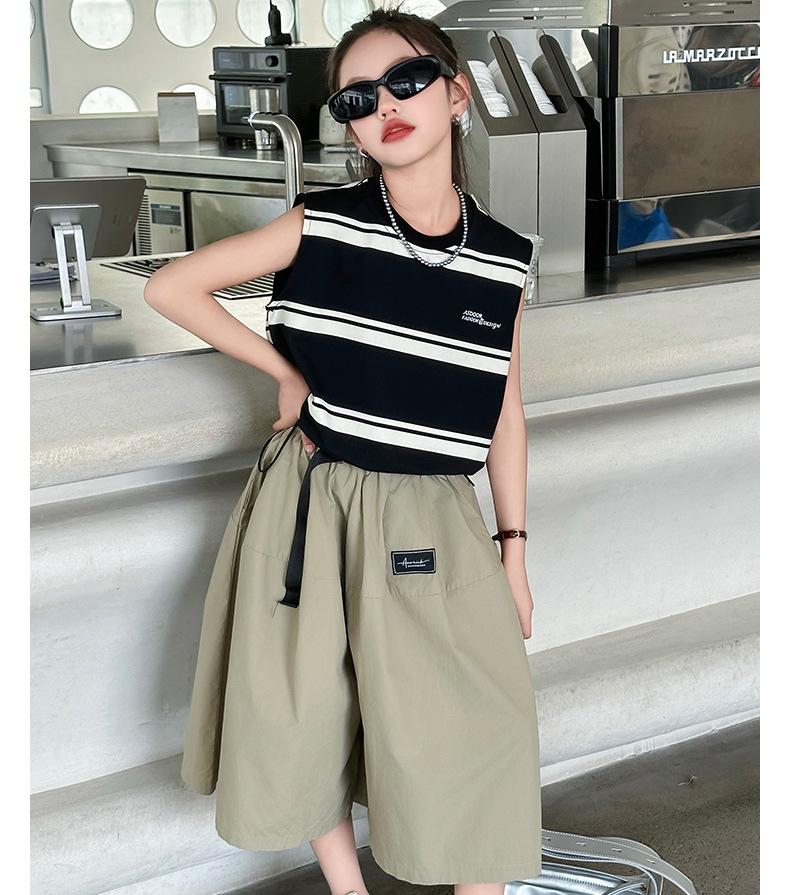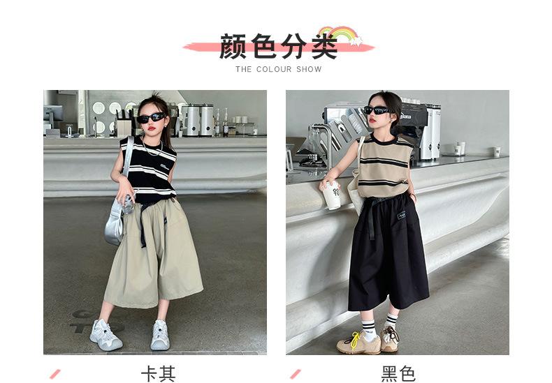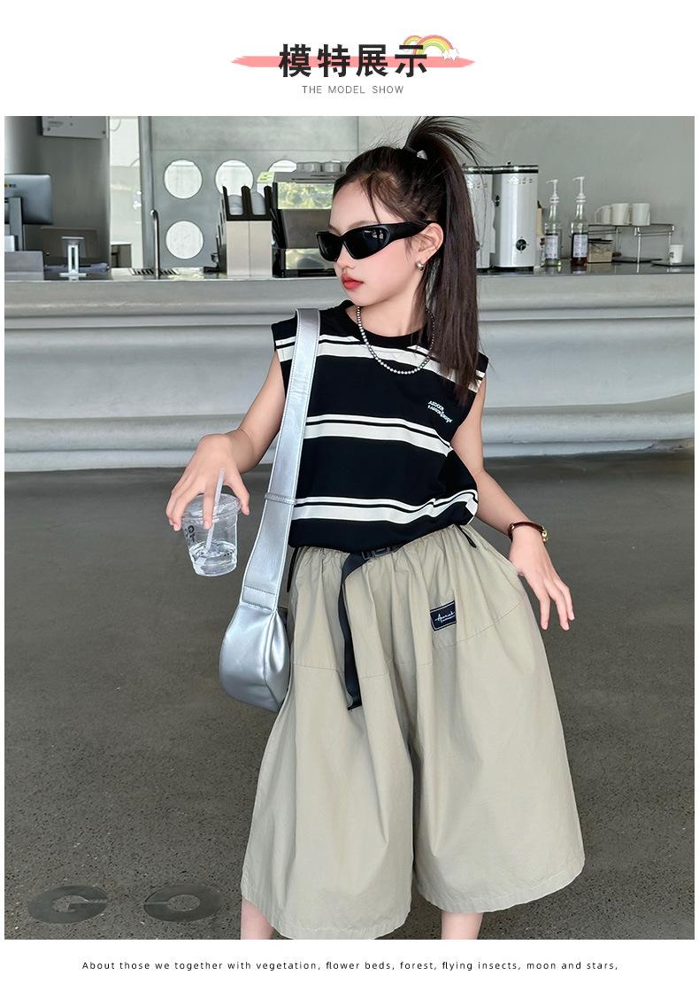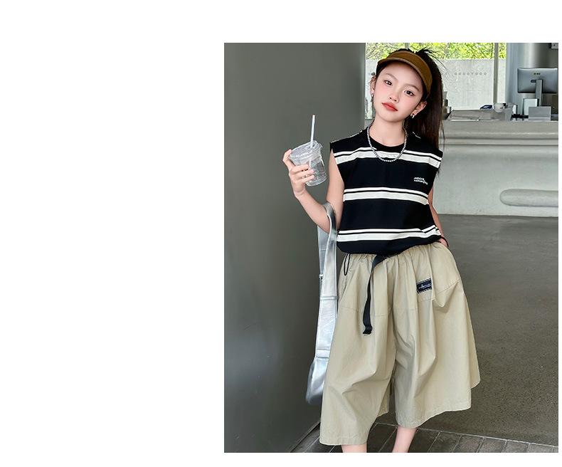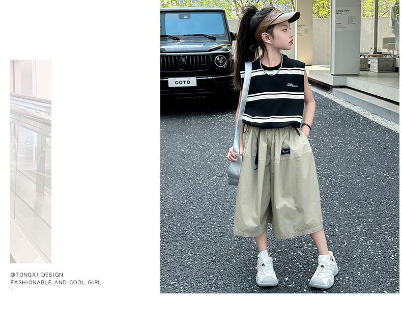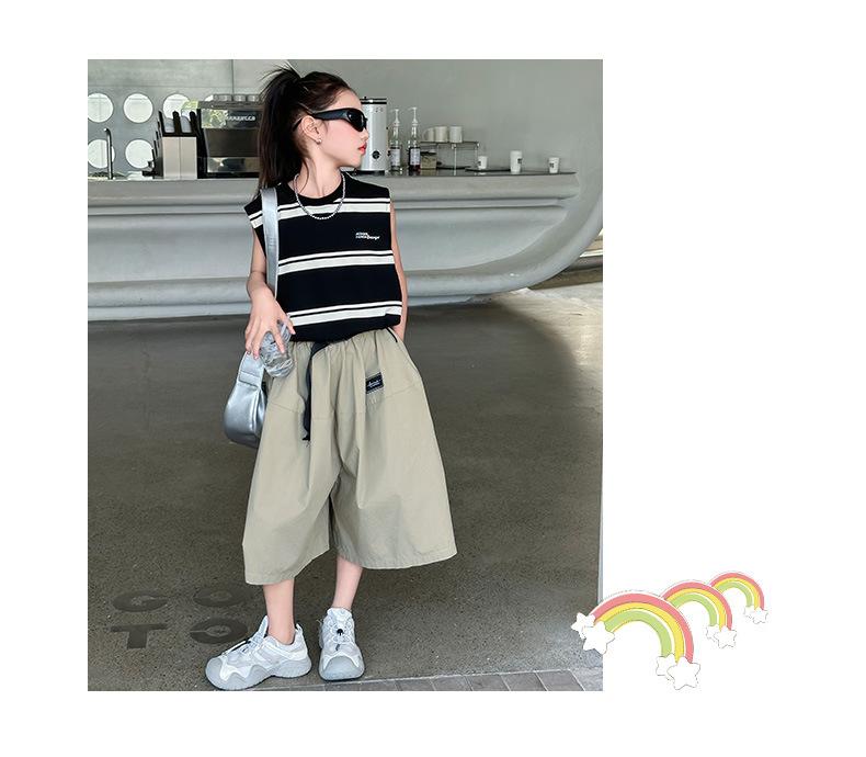 Traje de verano para niñas 2024, nuevo estilo coreano, estilo occidental, para niñas de talla mediana, de moda, informal, con parte superior a rayas, pantalones de vestir a la moda.