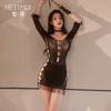 Negro [vestido de red de una pieza] + aplausos con plumas negras (precio limitado 39.8)